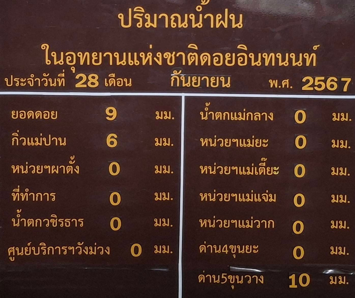 วันที่ 28 กันยายน 2567 ในพื้นที่จังหวัดเชียงใหม่ ยังวิกฤตจากน้ำท่วมขัง ในหลายพื้นที่ ท้องฟ้าปิดมืดครึ้มดวยกลุ่มเมฆฝนมาหลายวัน เช้าวันนี้ที่ ดอยอินทนนท์ นายเกรียงไกร ไชยพิเศษ หัวหน้าอุทยานแห่งชาติดอยสนุ่นได้รายงานมาว่าบรรยากาศเช้าวันที่ 28 กันยายน 2567 เวลา 7.00 น. วันนี้ยอดดอยและกิ่วแม่ปานท้องฟ้าเปิด คุณภาพอากาศดีมาก อุณหภูมิต่ำสุด