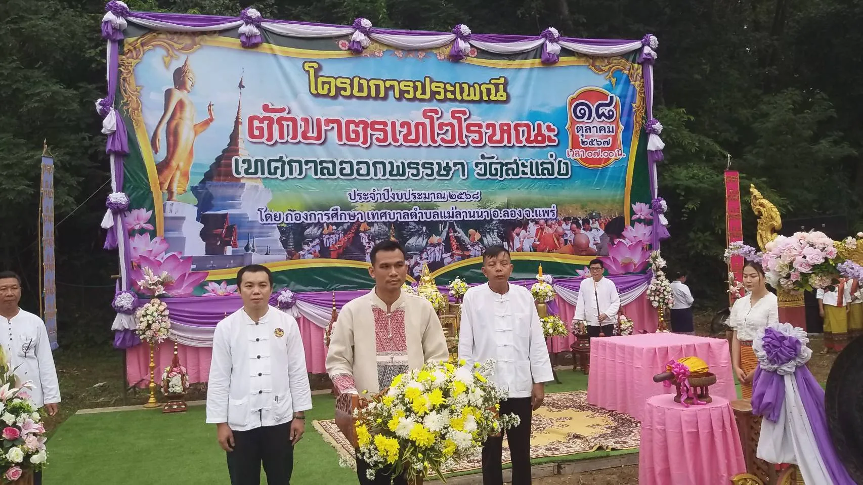 นางสาวกรรณิการ์ ผาภูมิ นายกเทศมนตรีเทศบาลแม่ลาน กล่าวรายงานวัตถุประสงค์การจัดงานประเพณีทำบุญตักบาตรเทโวโรหณะ ประจำปี 2567 เพื่อเป็นการส่งเสริมงานประเพณี วัฒนธรรม และสร้างจิตสำนึกให้ประชาชนได้เข้ามามีบทบาท และมีส่วนร่วมในการทำกิจกรรมด้านศาสนา สร้างความรักคสามสามมัคคีของคนในชุมชน เด็ก เยาวชน เพื่อเป็นการอนุรักษ์วัฒนธรรมที่ดีงาม ให้ประเพณีตักบาตรเทโวโรหณะวัดสะแล่ง ได้สืบทอดมาเป็นประจำทุกปี โดยมีทางฝ่ายปกครองอำเภอลอง , ชมรมกำนัน-ผญบ.ตำบลห้วยอ้อ , สภาวัฒนธรรมอำเภอลอง , หน่วยงานราชการในพื้นที่ชาวอำเภอลอง ร่วมในพิธีงานทำบุญตักบาตรเทโวโรหณะ ครั้งนี้เป็นจำนวนมาก