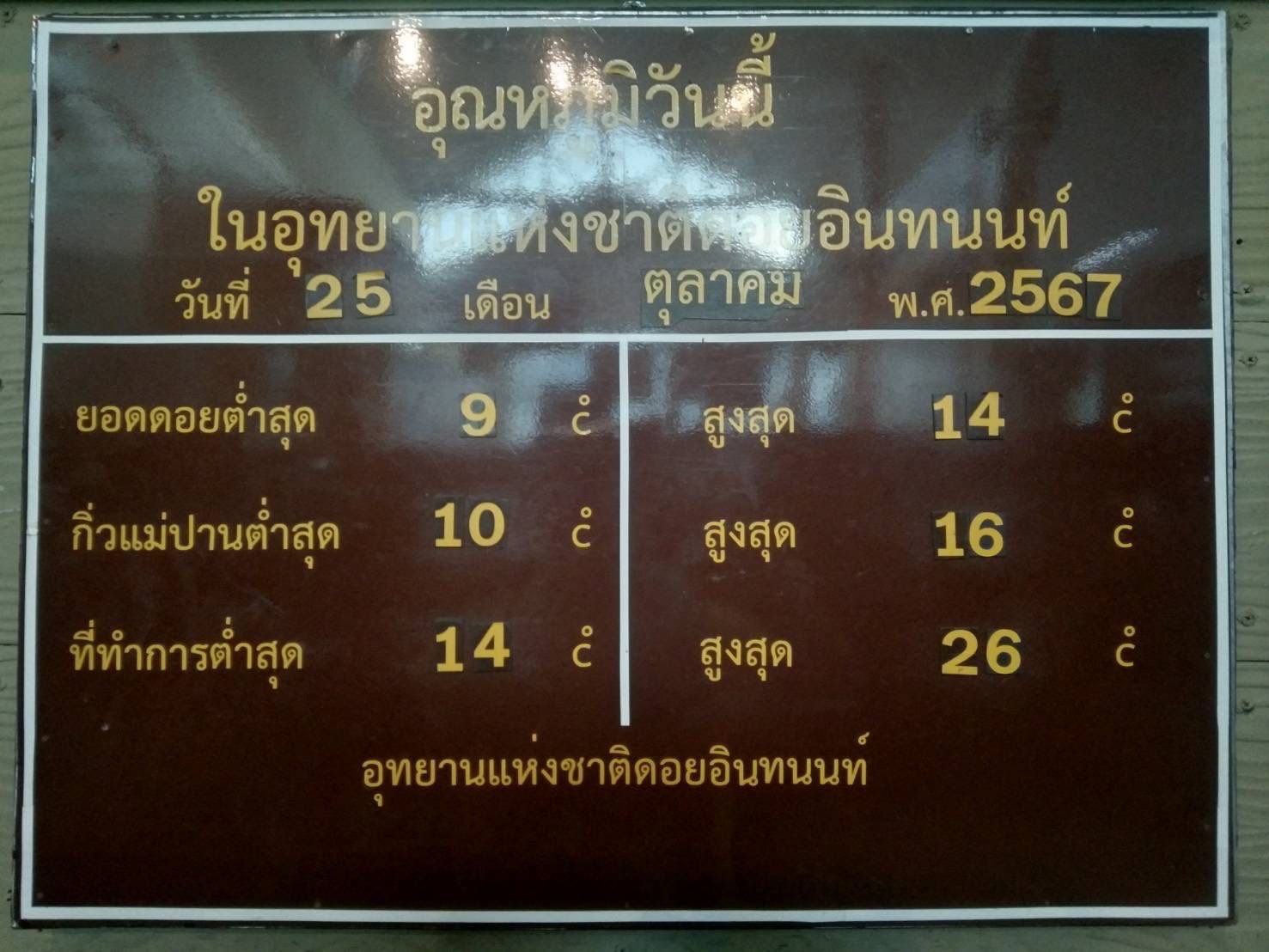 เมื่อเวลา 08.50 น วันที่ 25 ต.คุณ.2567 มีรายงานจากอุทยานแห่งชาติดอยอินทนนท์ อ.จอม ทอง จ.เชียงใหม่ โดยนายเกรียงไกร ไชยพิเศษ หัวหน้าอุทยานแห่งชาติดอยอินทนนท์ ว่า บรรยากาศเช้าวันที่ 25ตุลาคม 2567 เวลา 7.00 น. วันนี้ยอดดอยและกิ่วแม่ปานท้องฟ้าเปิด คุณภาพอากาศดีมาก อุณหภูมิต่ำสุด ยอดดอย 9 c ที่ กิ่วแม่ปาน 10 c ที่ทำการ 14 c ยอดดอย ค่า pm 2.5= 0 ที่ทำการ ค่า pm 2.5 = 0 นักท่องเที่ยวที่เข้ามาในเขตอุทยานแห่งชาติดอยอินทนนท์ เริ่มคึกคัก นักท่องเที่ยวได้สัมผัสอากาศหนาวเย็นสบาย ชมแสงอาทิตย์ยามเช้า ตัดกับเฆม และชมศึกษาธรรมชาติในเขตอุทยานแห่งชาติซึ่งมีหลายจุดให้เข้าชม รวมทั้งน้ำตกต่าง ๆ ทั้งน้ำตกแม่กลาง,น้ำตกแม่ยะ,น้ำตกวชิรธาร,น้ำตกทุ่งเสี้ยว รวมทั้งดอกไม้ฤดูหนาวนานาชนิด ,ดอกกุหลาบพันปี ที่เบ่งบานสวยงามมาก