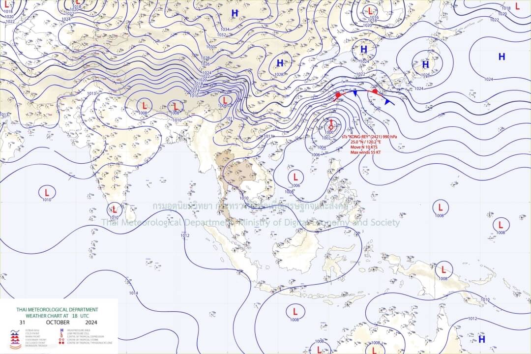 อนึ่ง ในช่วงวันที่ 2-5 พฤศจิกายน บริเวณความกดอากาศสูงหรือมวลอากาศเย็นกำลังปานกลางถึงค่อนข้างแรงอีกระลอกหนึ่งจากประเทศจีนจะแผ่เสริมลงมาปกคลุมประเทศไทยตอนบน และทะเลจีนใต้ ลักษณะเช่นนี้จะทำให้บริเวณประเทศไทยตอนบนมีฝนฟ้าคะนองกับมีลมกระโชกแรงเกิดขึ้นได้บางพื้นที่ในระยะแรก หลังจากนั้นอุณหภูมิจะลดลง โดยมีอากาศเย็นกับมีลมแรง โดยภาคเหนือและภาคตะวันออกเฉียงเหนือ อุณหภูมิจะลดลง 2-4 องศาเซลเซียส ส่วนภาคกลาง รวมทั้งกรุงเทพมหานครและปริมณฑล ภาคตะวันออก และภาคใต้ตอนบน อุณหภูมิจะลดลง 1-3 องศาเซลเซียส ในขณะที่ร่องมรสุมพาดผ่านภาคใต้ตอนกลาง ทำให้ภาคใต้มีฝนตกหนักถึงหนักมากบางแห่ง