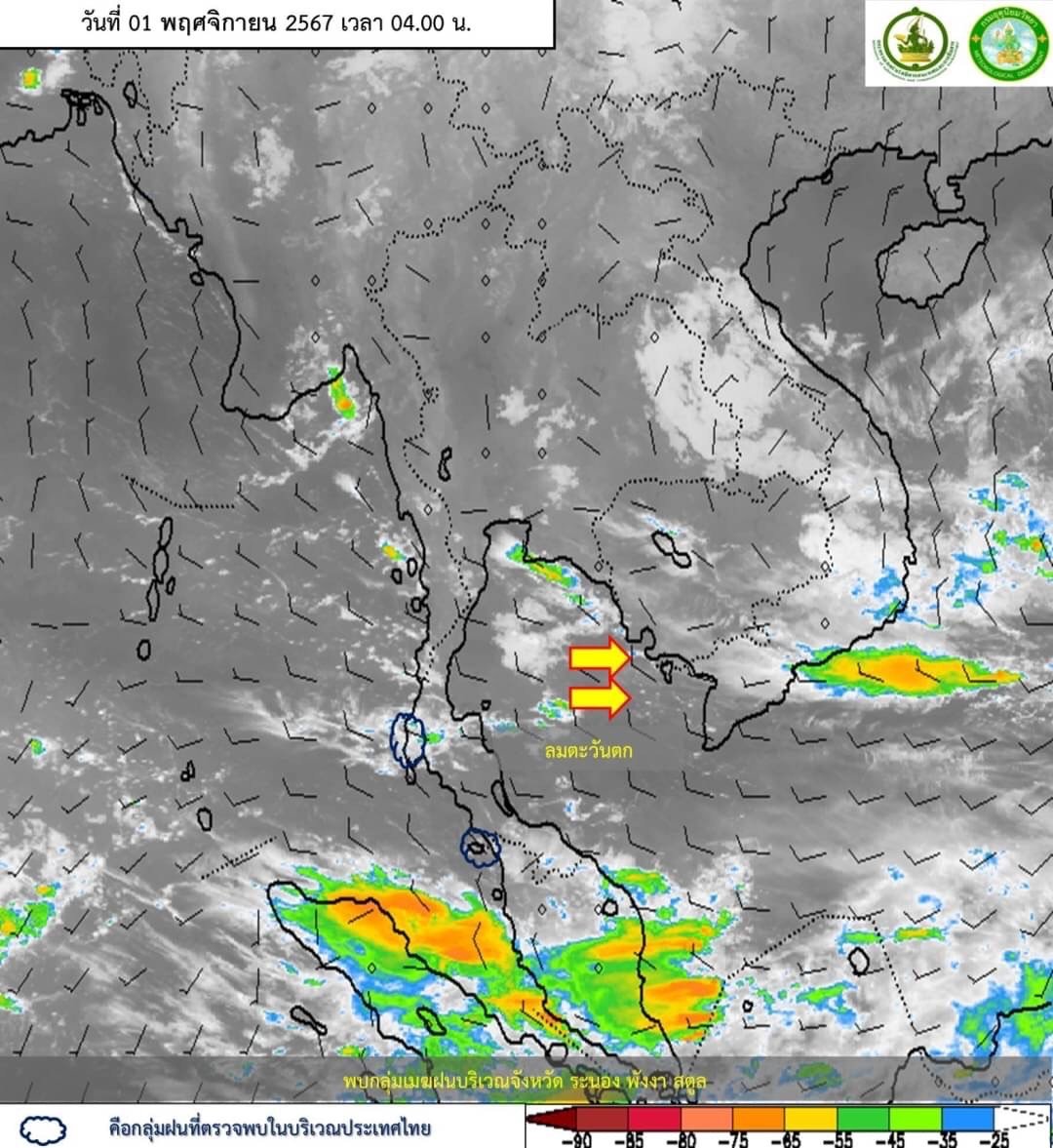 ภาคใต้(ฝั่งตะวันตก) มีฝนฟ้าคะนอง ร้อยละ 20 ของพื้นที่ ส่วนมากบริเวณจังหวัดระนอง พังงา ตรัง และสตูลอุณหภูมิต่ำสุด 24-26 องศาเซลเซียส อุณหภูมิสูงสุด 32-34 องศาเซลเซียส ลมตะวันตกเฉียงเหนือ ความเร็ว 15-30 กม./ชม.ทะเลมีคลื่นสูงประมาณ 1 เมตร บริเวณที่มีฝนฟ้าคะนองคลื่นสูงมากกว่า 2 เมตร
