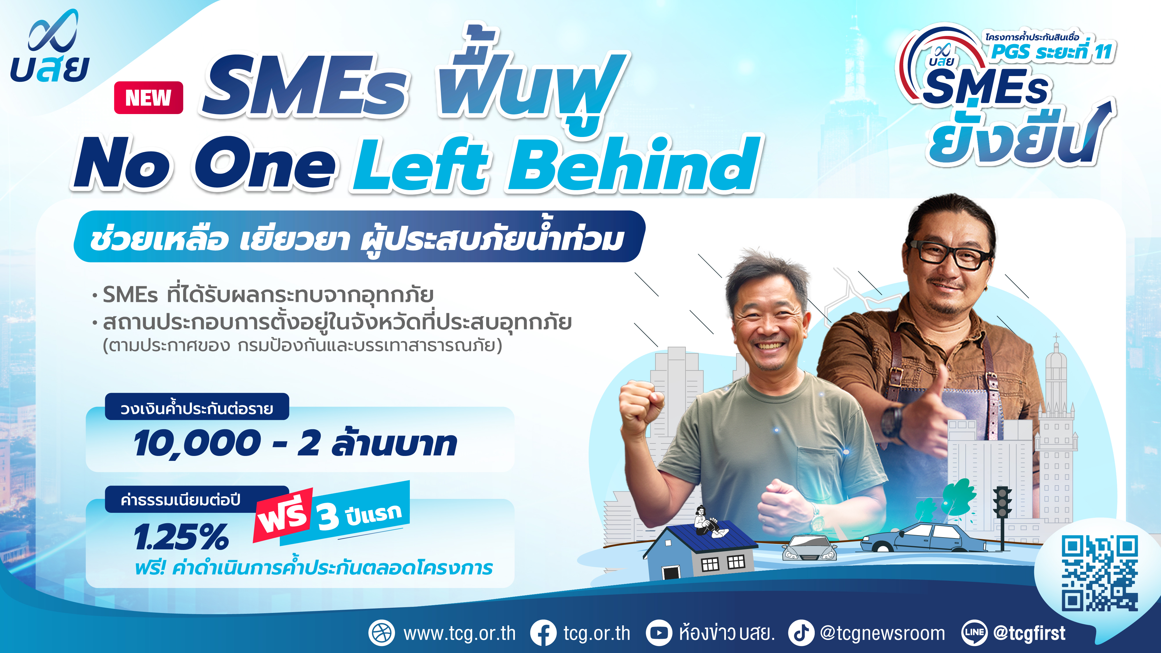 นายสิทธิกร ดิเรกสุนทร กรรมการและผู้จัดการทั่วไป บรรษัทประกันสินเชื่ออุตสาหกรรมขนาดย่อม (บสย.) กล่าวว่า ที่ผ่านมารัฐบาลได้ระดมมาตรการให้ความช่วยเหลือผู้ประกอบการ SMEs ในมิติต่างๆ หนึ่งในนั้นคือ มาตรการค้ำประกันสินเชื่อดอกเบี้ยถูกของ บสย. ภายใต้ โครงการค้ำประกันสินเชื่อ SMEs ฟื้นฟู No One Left Behind วงเงิน 1,000 ล้านบาท ค้ำประกันตั้งแต่ 1 หมื่น – 2 ล้านบาทต่อราย นานสูงสุด 10 ปี อัตราค่าธรรมเนียม 1.25% ต่อปี ฟรี! ค่าธรรมเนียม 3 ปีแรก พร้อมยกเว้นค่าดำเนินการค้ำประกันตลอดโครงการ เพื่อช่วยลดภาระทางการเงินให้กับ SMEs ผู้ประสบภัยอุทกภัย