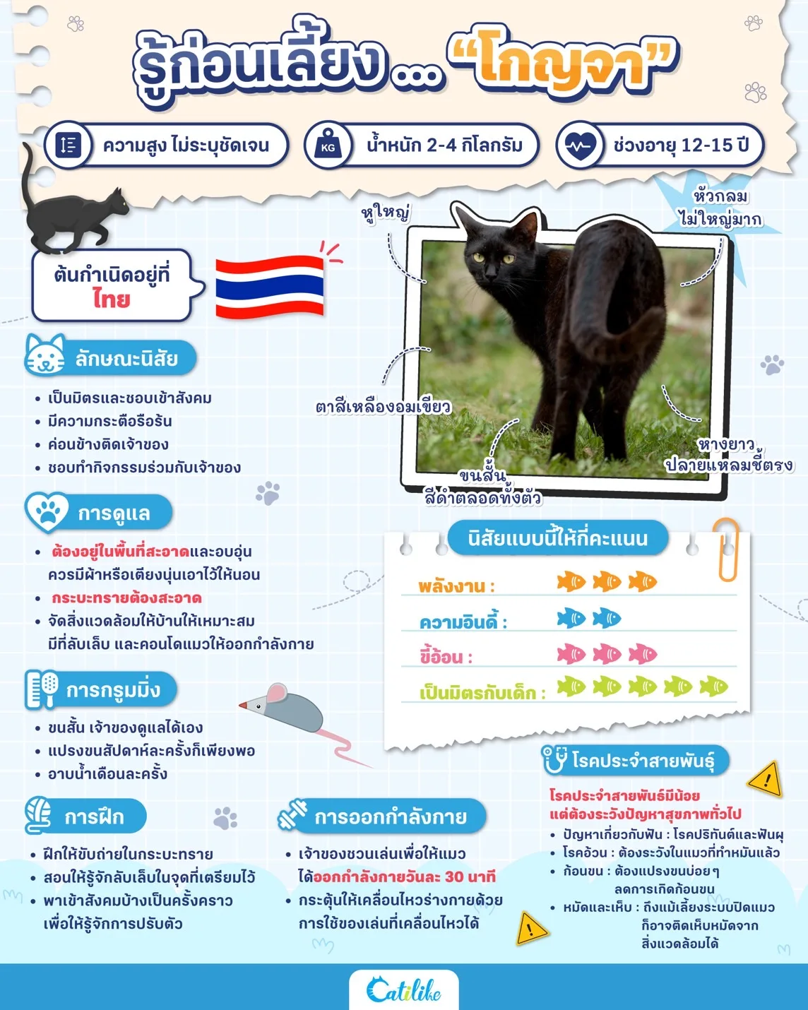 คำว่า “โกญจา” แปลว่า นกกระเรียน, เสียงที่ดังก้อง แมวชนิดนี้ เป็นแมวสีดำสนิทตลอดทั้งตัว ขนสั้น เส้นเล็กละเอียด นุ่ม และเรียบตรงทั้งลำตัว ส่วนหัวกลมแต่ไม่โต มีปากเรียวแหลม หูตั้ง นัยน์ตาเป็นสีเหลืองอมเขียวหรือทองอ่อน อาจเปรียบได้กับดอกบวบแรกแย้มหรือทองดอกบวบ รูปร่างสะโอดสะองคล่องแคล่ว หางยาว ปลายหางแหลมตรง อุ้งเท้าทอดคล้ายเท้าสิงห์ มีความสง่างามขณะเคลื่อนไหว