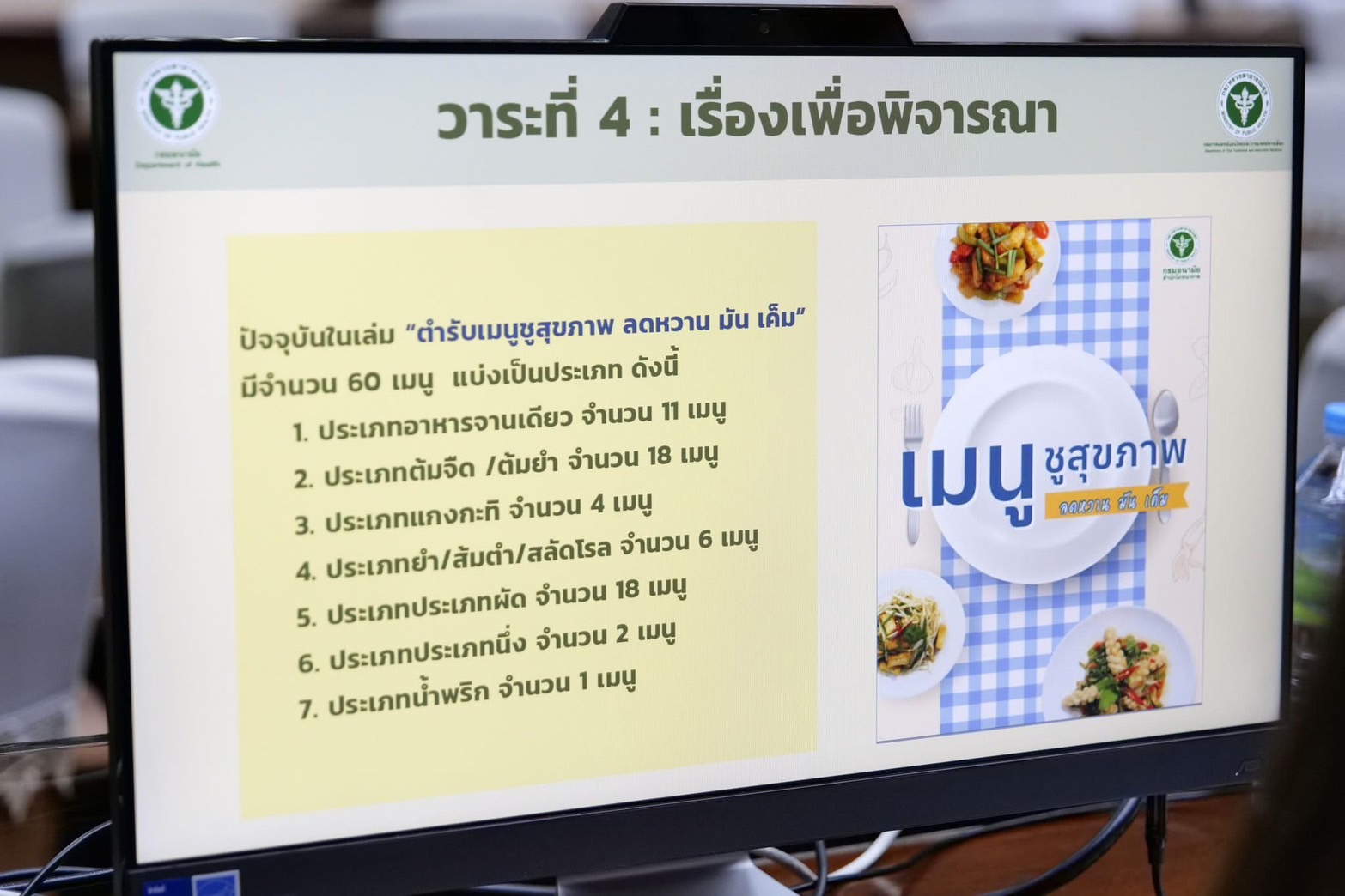 เมื่อวันที่ 21 พฤศจิกายน 2567 กรมอนามัยร่วมกับกรมการแพทย์แผนไทยและการแพทย์ทางเลือก ประชุมความร่วมมือด้านอาหารและสมุนไพรไทยเพื่อแก้ปัญหาโรคไม่ติดต่อเรื้อรัง : NCDs โดยมีนายโฆสิต สุวินิจจิต คณะที่ปรึกษารัฐมนตรีว่าการกระทรวงสาธารณสุข เป็นประธาน ทั้งนี้ นายแพทย์ปองพล วรปาณิ รองอธิบดีกรมอนามัย และแพทย์หญิงสายพิณ โชติวิเชียร ผู้อำนวยการสำนักโภชนาการ ร่วมนำเสนอความก้าวหน้าการดำเนินงานขับเคลื่อนด้านโภชนาการ “กินเป็นไม่ป่วย ด้วยเมนูชูสุขภาพ” ณ ห้องประชุมกำธรสุวรรณกิจ อาคาร 1 กรมอนามัย กระทรวงสาธารณสุข