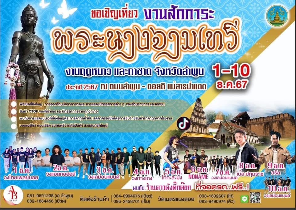 งานฤดูหนาวจังหวัดลำพูน ตั้งแต่วันที่ 1-10 ธันวาคม 2567 ณ บริเวณพื้นที่เอกชน บ้านแม่สารป่าแดด ถนนสายลำพูน-ดอยติ ต.เวียงยอง อ.เมืองลำพูน