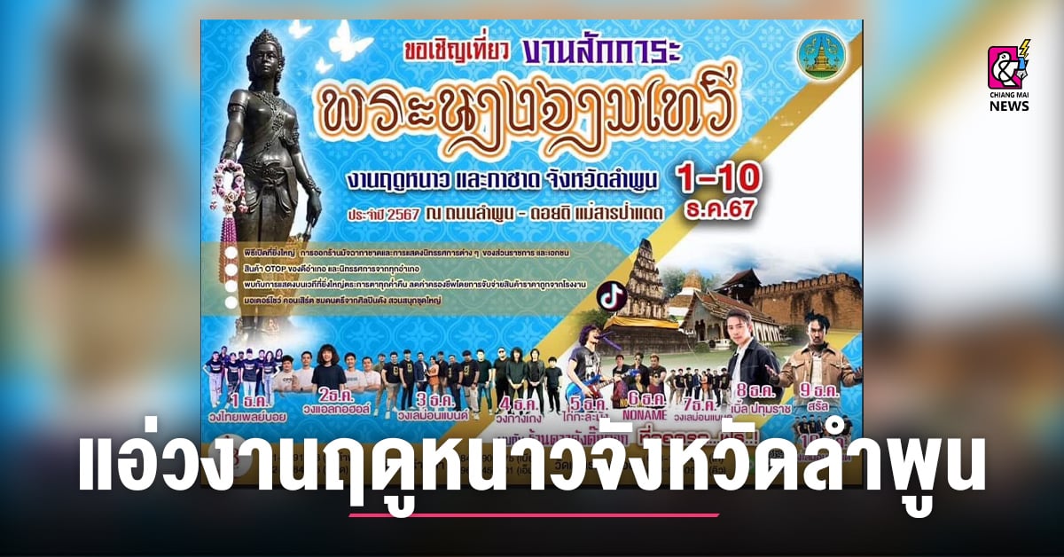 งานฤดูหนาวจังหวัดลำพูน ตั้งแต่วันที่ 1-10 ธันวาคม 2567 ณ บริเวณพื้นที่เอกชน บ้านแม่สารป่าแดด ถนนสายลำพูน-ดอยติ ต.เวียงยอง อ.เมืองลำพูน