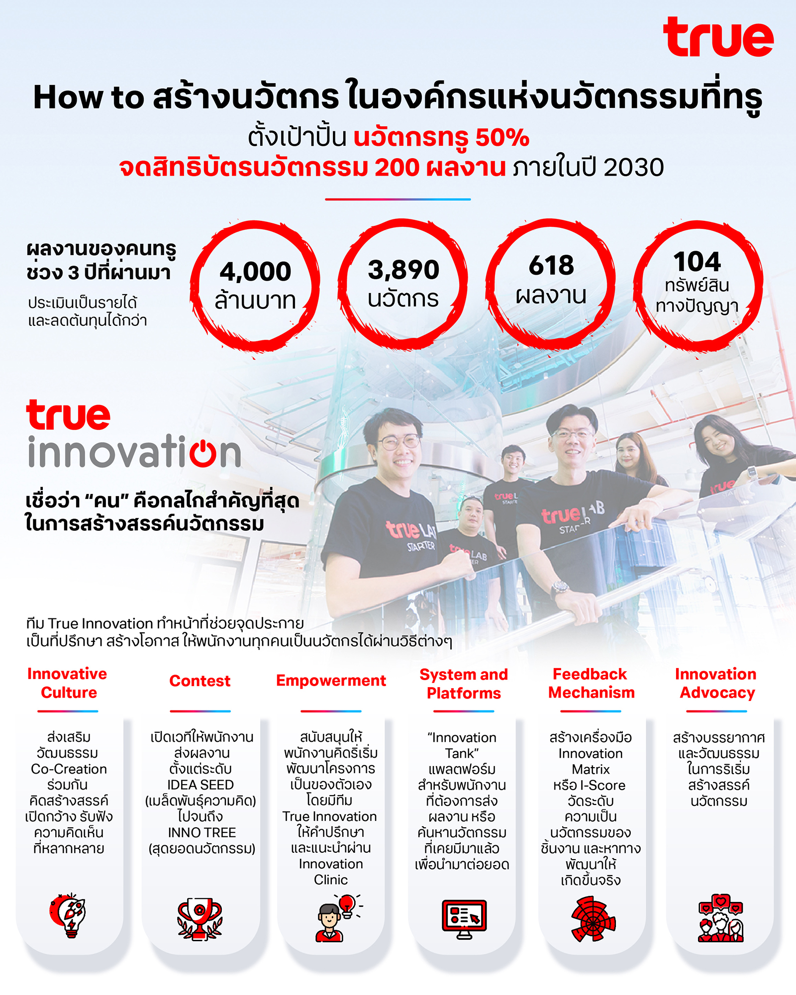 “True Innovation เชื่อว่า “คน” คือกลไกสำคัญที่สุดในการสร้างสรรค์สิ่งใหม่ๆ ในองค์กร ทีมเรา จึงทำหน้าที่ช่วยจุดประกาย เป็นที่ปรึกษา สร้างโอกาส ให้พนักงานทุกคนเป็นนวัตกรได้ โดยในช่วง 3 ปีที่ผ่านมา พนักงานทรู พัฒนานวัตกรรมไปแล้วกว่า 600 ผลงาน มีพนักงานที่เป็นนวัตกรกว่า 4,000 คน ยื่นจดทรัพย์สินทางปัญญาได้กว่า 100 ผลงาน ประเมินเป็นรายได้และลดต้นทุนได้กว่า 4,000 ล้านบาท โดยตั้งเป้าหมายที่จะสร้างนวัตกรทรูให้ได้ 50% จากจำนวนพนักงานทั้งหมด พร้อมจดสิทธิบัตรนวัตกรรมให้ได้ 200 ผลงาน ภายในปี 2030” นายวีรศักดิ์ กล่าวสรุป