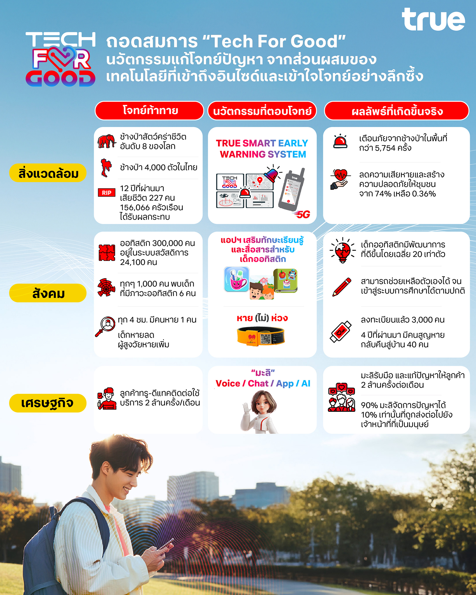 จากสถิติของ BBC Science Focus Magazine พบว่า ช้างป่าเป็นสัตว์ที่อันตรายที่สุดต่อชีวิต ติดอันดับ 8 ของโลก ขณะที่ประเทศไทยมีช้างป่ามากกว่า 4,000 ตัว และมีจำนวนเพิ่มขึ้น 8% ในปี 2567 สถิติที่น่าวิตกคือในช่วง 12 ปี (2555 – 2567) ที่ผ่านมา ช้างป่ามีการบุกรุกพื้นที่เพาะปลูกและที่อยู่อาศัย ส่งผลให้ชาวบ้านได้รับบาดเจ็บ 198 ราย มีผู้เสียชีวิตถึง 227 ราย เกิดเป็นปัญหาความขัดแย้งระหว่างคนกับช้างป่า ซึ่งในมิติด้านสิ่งแวดล้อม ทรู ได้นำเทคโนโลยีอินเทอร์เน็ตความเร็วสูง 5G, 4G และ AI ร่วมกับกล้องดักถ่ายภาพสัตว์ป่า (Camera Trap) ทำงานร่วมกันในการวิเคราะห์ภาพช้างป่า หรือผู้พบเห็นแจ้งผ่านแอปพลิเคชัน Smart Adventure แจ้งเตือนภัยแบบเรียลไทม์ ช่วยจัดการปัญหาความขัดแย้งระหว่างคนกับช้าง ผ่านโครงการเฝ้าระวังช้างป่าด้วยระบบเตือนภัยล่วงหน้า (True Smart Early Warning System) โดยร่วมกับกรมอุทยานแห่งชาติ สัตว์ป่าและพันธุ์พืช และ WWF ประเทศไทย ดำเนินการนำร่องในพื้นที่รอบเขตอุทยานแห่งชาติกุยบุรี จ.ประจวบคีรีขันธ์ มาตั้งแต่ปี พ.ศ. 2561