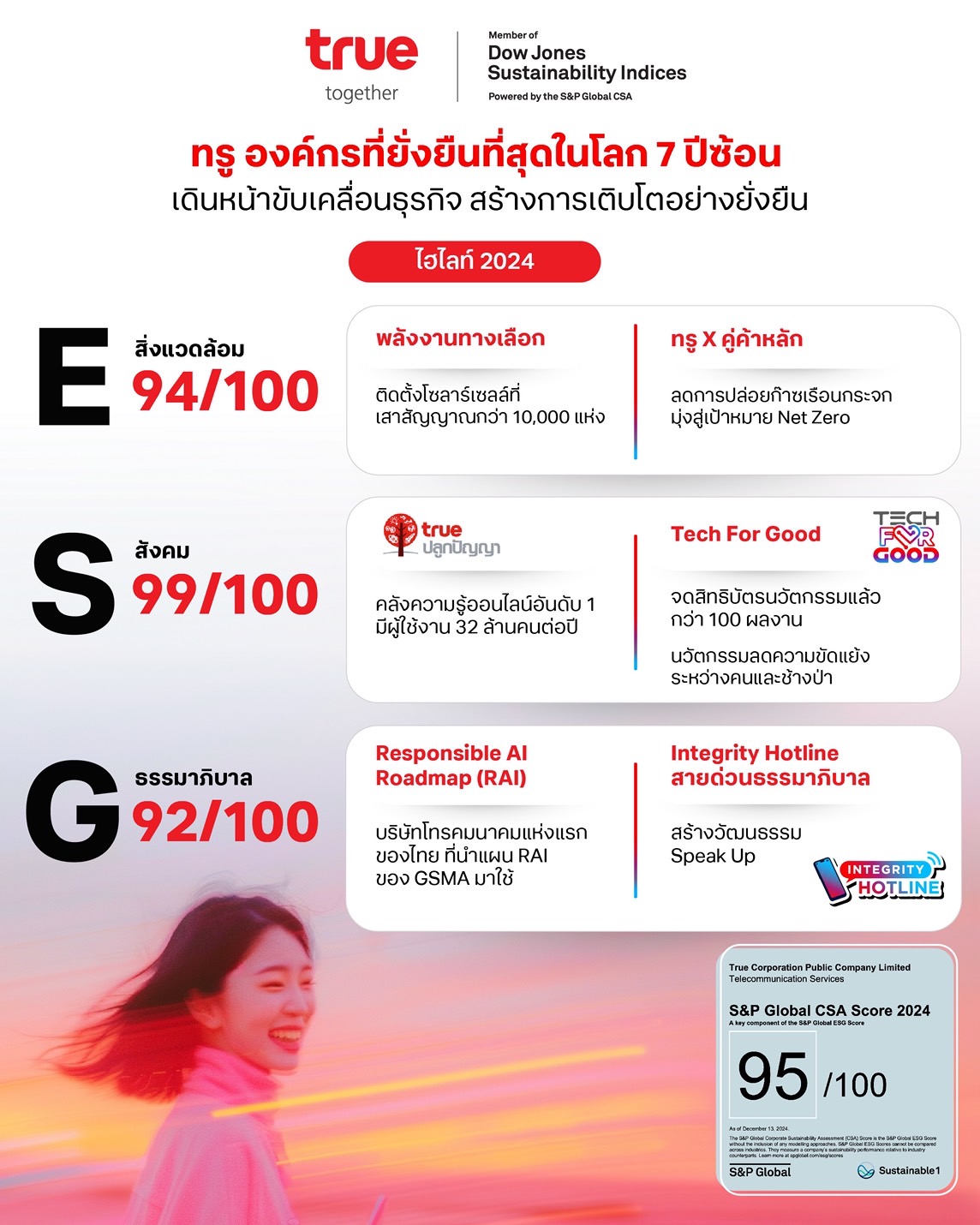 กรุงเทพฯ 24 ธันวาคม 2567 – ทรู คอร์ปอเรชั่น ได้รับการจัดอันดับดัชนีความยั่งยืน Dow Jones Sustainability Indices (DJSI) ปี 2024 ให้เป็นองค์กรที่ยั่งยืนที่สุดในกลุ่มโทรคมนาคมของโลก ต่อเนื่องเป็นปีที่ 7 จากการประเมินบริษัทต่างๆ ทั่วโลกตามหลักเกณฑ์ Corporate Sustainability Assessment (CSA) ของ S&P Global ครอบคลุมทุกมิติ ทั้งด้านเศรษฐกิจ สังคม และสิ่งแวดล้อม โดยความสำเร็จอีกครั้งในปีนี้ ทรู คอร์ปอเรชั่น ได้คะแนนรวมสูงถึง 95 จาก 100 ซึ่งเป็นคะแนนสูงสุดของโลกในกลุ่มบริษัทโทรคมนาคม พร้อมเดินหน้าประกาศแผนงานสำคัญ ปี 2568 ขับเคลื่อนกลยุทธ์สร้างองค์กรผู้นำด้านความยั่งยืนต่อเนื่อง