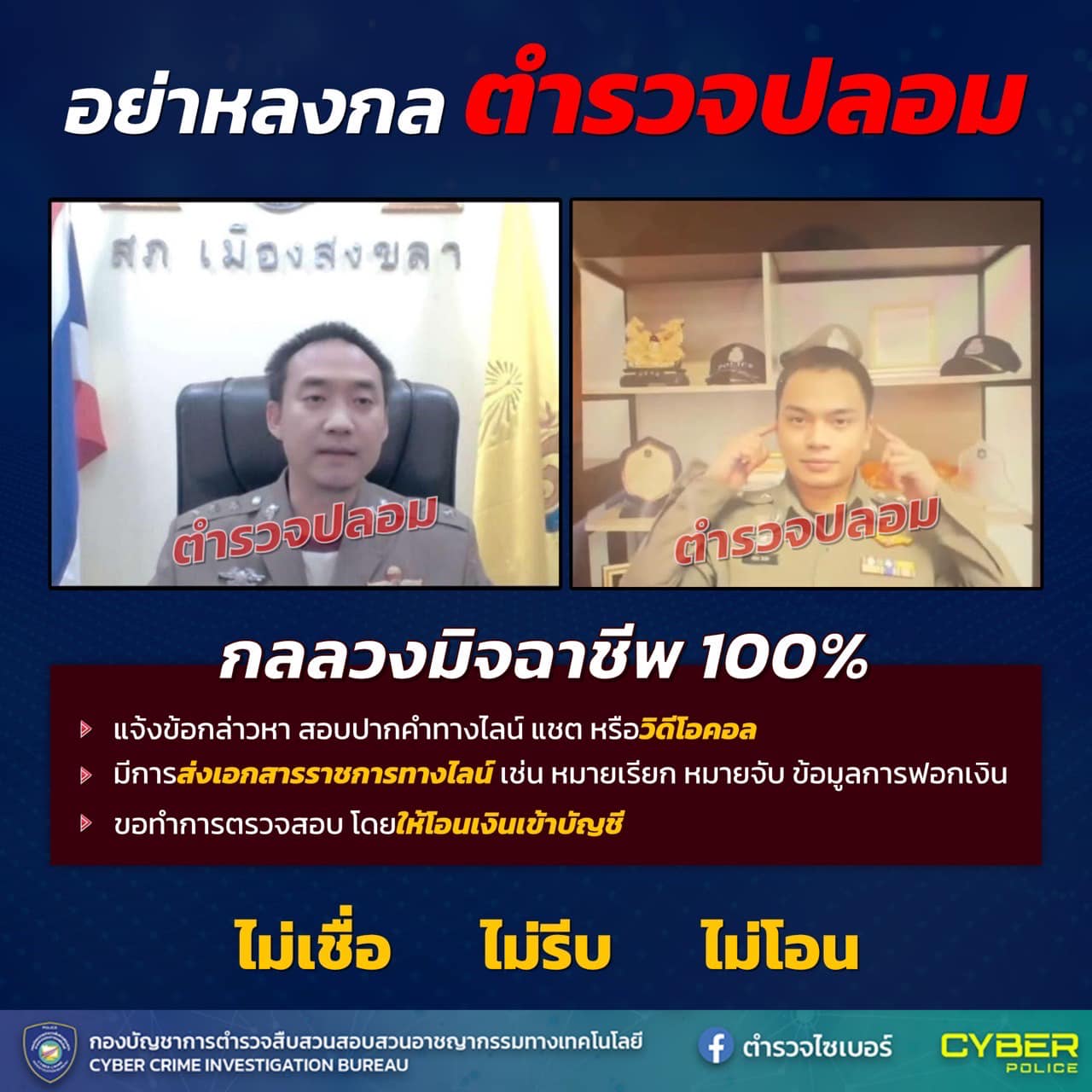 ปัจจุบันมิจฉาชีพใช้ช่องทางออนไลน์หลอกลวงมากขึ้น เช่น การปลอมแปลงเป็นตำรวจ ติดต่อผ่านแอปพลิเคชันไลน์ วิดีโอคอล หรือแพลตฟอร์มต่างๆ เพื่อหลอกลวงเงิน โปรดระมัดระวังทุกครั้งที่มีการติดต่อจากบุคคลที่อ้างตัวเป็นเจ้าหน้าที่