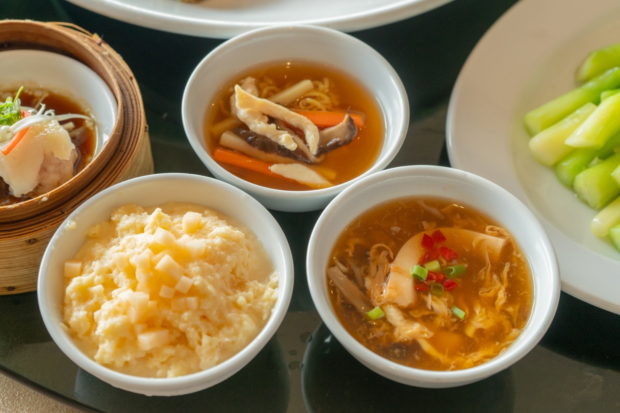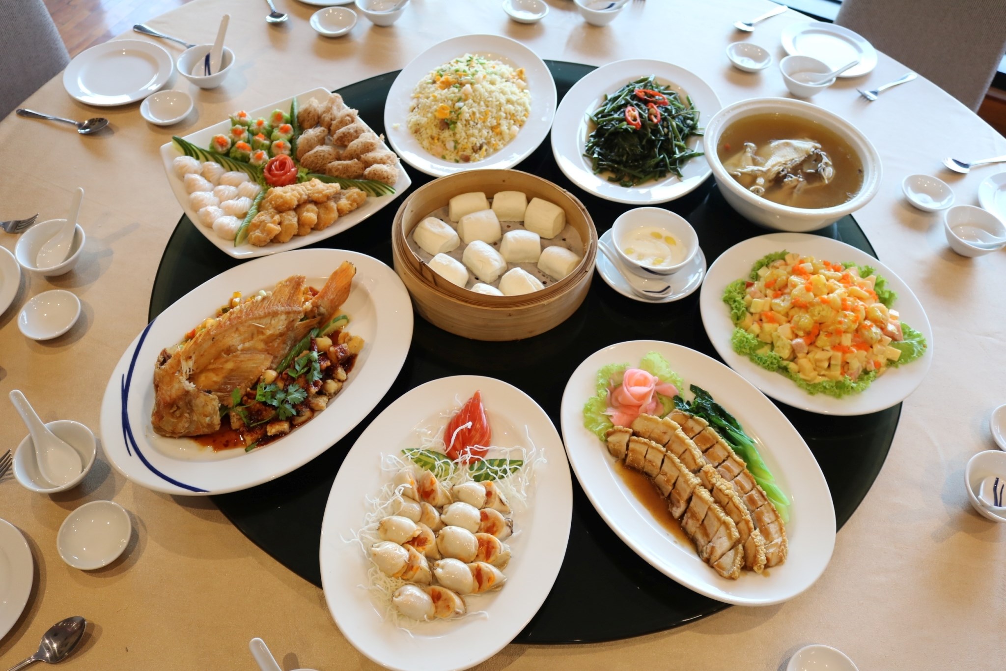 ชวนลิ้มลอง เมนูใหม่.. สลัดผลไม้กุ้งทอด ออเดิร์ฟร้อน (ขนมจีบหมู ฮะเก๋ากุ้ง ทอดมันกุ้ง ขนมผักกาดทอด กุ้ยช่ายทอด เผือกทอด) ไก่สาวตุ๋นยาจีน หมูกรอบ ผัดผักบุ้ง ปลาหมึกไส้ไข่เค็ม ซี่โครงมังกรอบซอส หรือปลาทับทิมสอง ข้าวผัดหยางโจว และแปะก๊วยมะพร้าวอ่อน