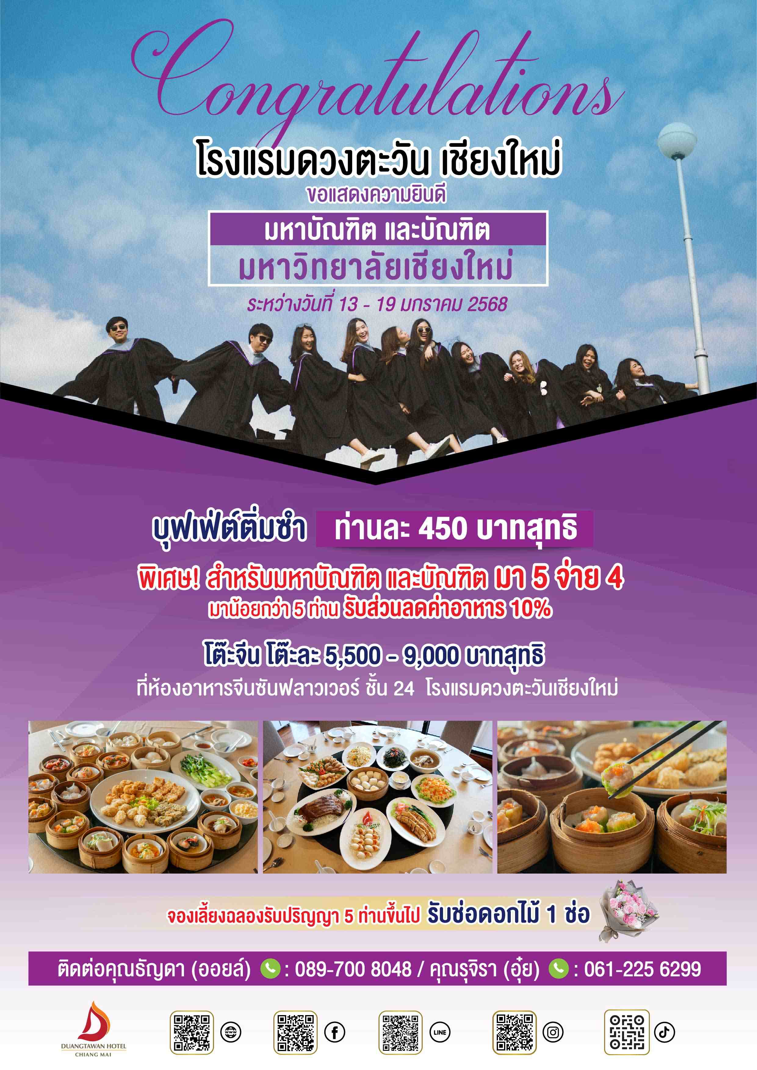 โรงแรมดวงตะวันเชียงใหม่ ขอแสดงความยินดีกับบัณฑิตใหม่ มช.ทุกท่าน ขอจัดโปรโมชั่น ให้บัณฑิตใหม่ได้ฉลองความสำเร็จ ด้วยบุฟเฟ่ต์ติ่มซำ อิ่มไม่อั้น 120 นาที ท่านละ 450 สุทธิ โปรบัณฑิตใหม่.มา 5 จ่าย 4!! สำรอง 5 ท่านขึ้นไป รับช่อดอกไม้แสดงความยินดี!! หรืออาหารจีน โต๊ะละ 5,500 ทานได้ 10 ท่าน