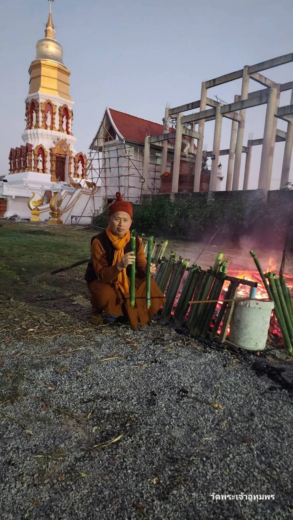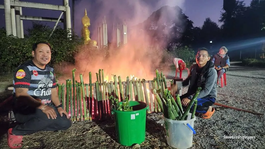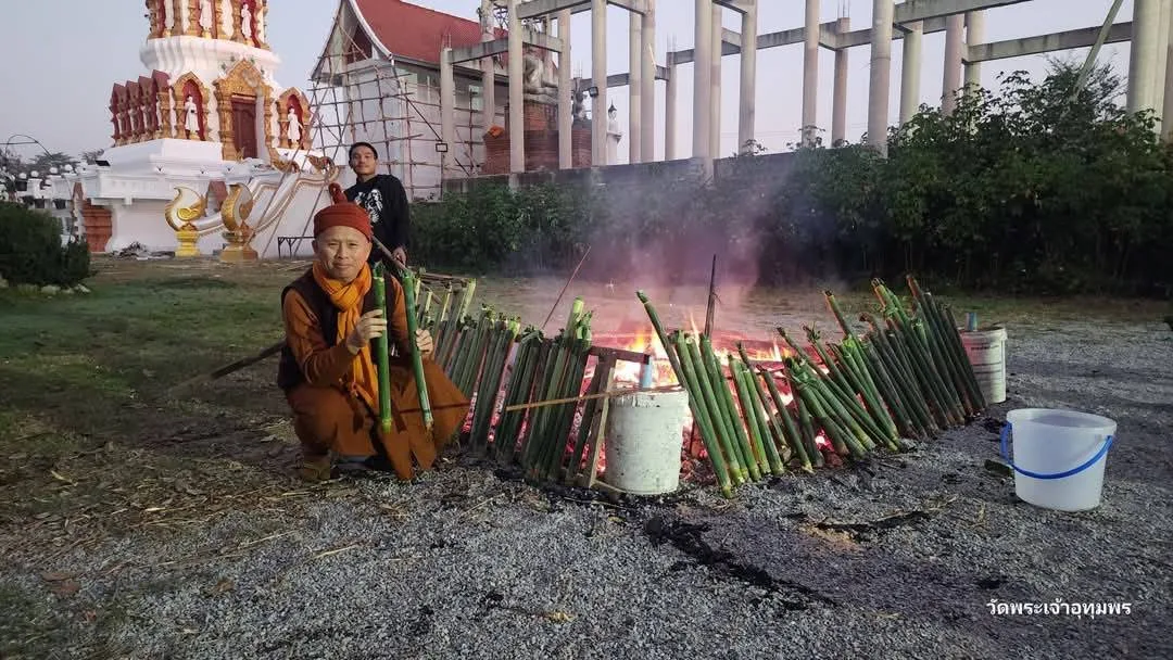“โดยประชาชนก็นำข้าวเปลือกข้าวสารใหม่ และ ขันข้าว ข้าวหลาม ข้าวจี่ 1 สำรับ ประกอบด้วย ดอกไม้ ธูปเทียน น้ำสำหรับกรวด ข้าวต้ม ขนมจ๊อก อาหาร น้ำตาลน้ำอ้อยไปใส่บาตรและยังมีพิธีบูชากองหลัวถวายเป็นพุทธบูชาอีก คือ พระภิกษุสามเณร และไปตัดเอาไม้จี่ ยาวบ้าง สั้นบ้างมาก่อเป็นกองหลัวทำเป็นเจดีย์ แล้วจุดบูชาตอนเช้า เป็นการบูชาพระรัตนตรัย โดยความหมายเพื่อเผากิเลส ตัณหาให้หมดไป ซึ่งคณะสงฆ์วัดพระเจ้าอุทุมพร ต.บ่อแฮ้ว อ.เมืองลำปาง ได้สนับสนุนสืบทอดประเพณีพิธีกรรมวัฒนธรรมล้านนาประเพณีเดือนสี่เป็งเรื่อยมา cr.คลิป-ภาพ ข้อมูล ครูบาบุญปิง กิตติญาโน ดจ้าอาวาสวัดพระเจ้าอุทุมพร บ้านน้ำโท้งอุดมพร