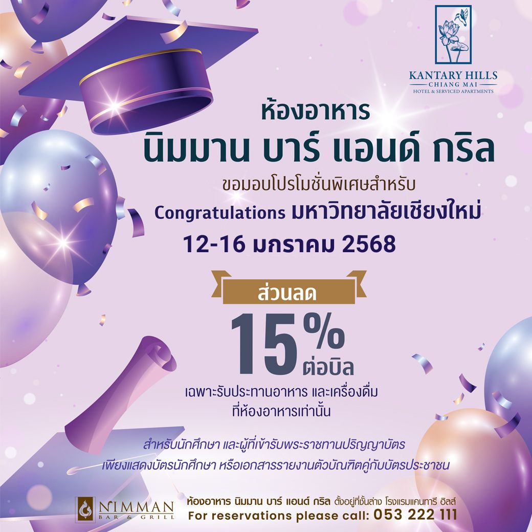 หมายเหตุ : *โปรโมชั่นส่วนลด 15 % สำหรับนักศึกษา มช. ที่กำลังศึกษาอยู่ทุกระดับชั้น (ป.ตรี, ป.โท, ป.เอก) และผู้ที่เข้ารับพระราชทานปริญญาบัตร เพียงแสดงบัตรนักศึกษาตัวจริง หรือเอกสารรายงานตัวบัณฑิต คู่กับบัตรประชาชน(หรือ ใบขับขี่, พาสปอร์ต) เพื่อรับสิทธิในช่วงวันเวลาดังกล่าว