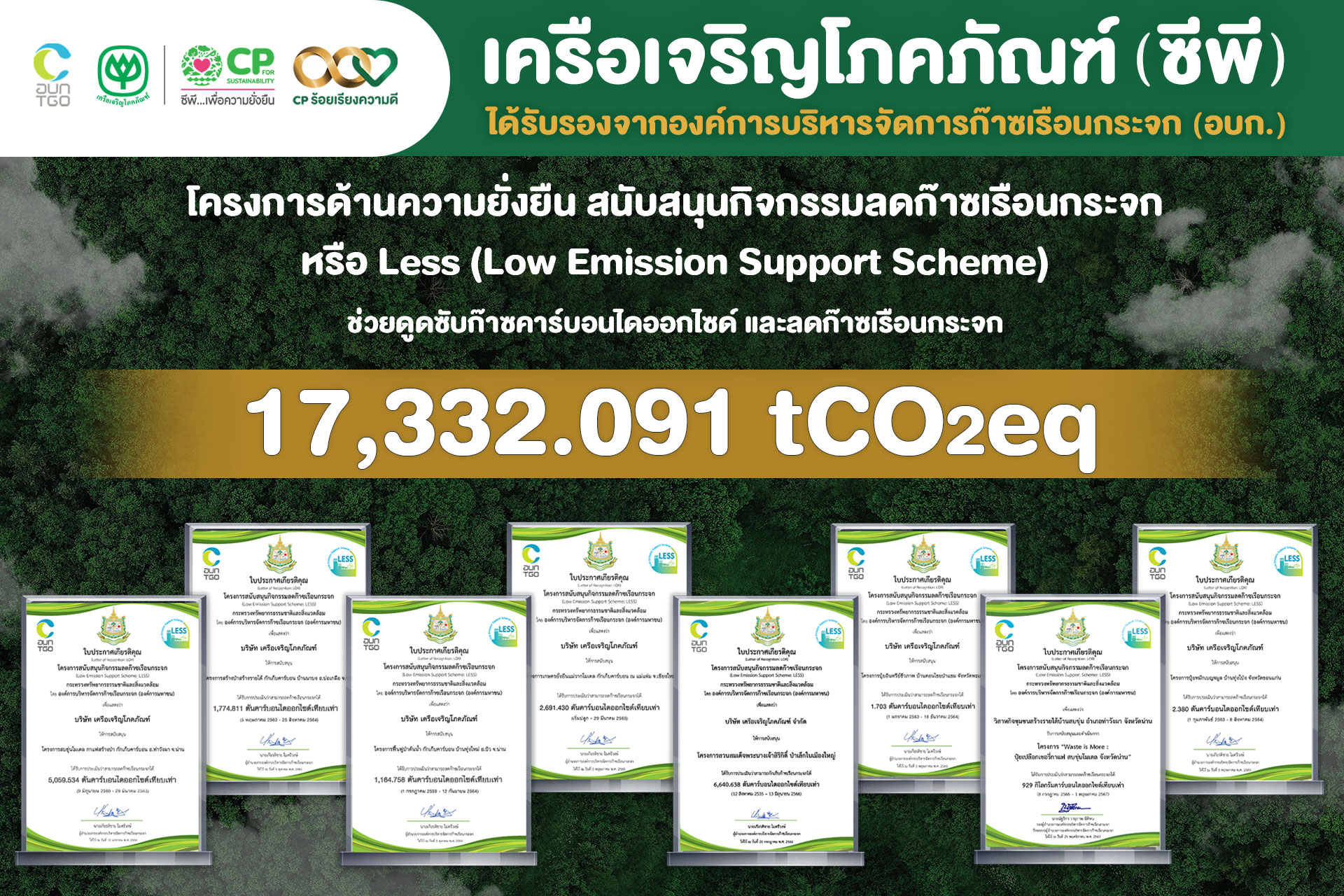 โดยปัจจุบัน เครือซีพี ดำเนินโครงการด้านความยั่งยืนในหลายพื้นที่ อย่างต่อเนื่อง จนกระทั่งสามารถปลูกต้นไม้เพิ่มพื้นที่สีเขียวบนพื้นที่ป่าต้นน้ำ และได้รับการรับรองจากองค์การบริหารจัดการก๊าซเรือนกระจก (องค์การมหาชน) หรือ อบก. ในโครงการสนับสนุนกิจกรรมลดก๊าซเรือนกระจก หรือ LESS โดยในด้านป่าไม้และพื้นที่สีเขียว ใน 5 โครงการ ได้แก่ โครงการสบขุ่นโมเดล กาแฟสร้างป่า อ.ท่าวังผา จ.น่าน กักเก็บคาร์บอนได้ 5,059.534 tCO2eq โครงการสร้างป่าสร้างรายได้ บ้านนาบง อ.บ่อเกลือ จ.น่าน สามารถกักเก็บคาร์บอนได้ 1,774.811 tCO2eq โครงการฟื้นฟูป่าต้นน้ำ บ้านทุ่งใหม่ อ.ปัว จ.น่าน สามารถกักเก็บคาร์บอนได้ 1,164.758 tCO2eq โดยทั้ง 3 โครงการเป็นโครงการที่เครือซีพีสนับสนุนด้านอนุรักษ์ ฟื้นฟูธรรมชาติและสิ่งแวดล้อมในพื้นที่ต้นน้ำน่าน พร้อมทั้งยกระดับอาชีพและคุณภาพชีวิตชุมชนให้อยู่ร่วมกับป่าอย่างยั่งยืน จากความร่วมมือของภาครัฐและภาคประชาสังคมและชุมชนในพื้นที่ จ.น่าน และโครงการเกษตรยั่งยืนแม่วากโมเดล อ.แม่แจ่ม จ.เชียงใหม่ สามารถกักเก็บคาร์บอนได้ 2,687.347 tCO2eq โดยขับเคลื่อนการทำงานระหว่างเครือซีพี กับภาคีเครือข่ายแม่แจ่ม โมเดล เพื่อฟื้นฟูทรัพยากรธรรมชาติป่าไม้บนพื้นที่ต้นน้ำปิง ในการปรับเปลี่ยนพืชเชิงเดี่ยวมายาวนาน มาปลูกพืชชนิดใหม่ที่เป็นมิตรกับสิ่งแวดล้อม และยังมีโครงการที่เป็นหนึ่งในภาคีเครือข่าย ร่วมกับ มูลนิธิสวนสมเด็จพระนางเจ้าสิริกิติ์ฯ ในโครงการสวนสมเด็จพระนางเจ้าสิริกิติ์ ป่าเล็กในเมืองใหญ่ เพื่อปลูกจิตสานึกแก่เยาวชนในการอนุรักษ์ทรัพยากรธรรมชาติ ภายใต้โครงการค่ายเยาวชน…รักษ์พงไพรฯ สามารถกักเก็บคาร์บอนได้ 6,640.638 tCO2eq