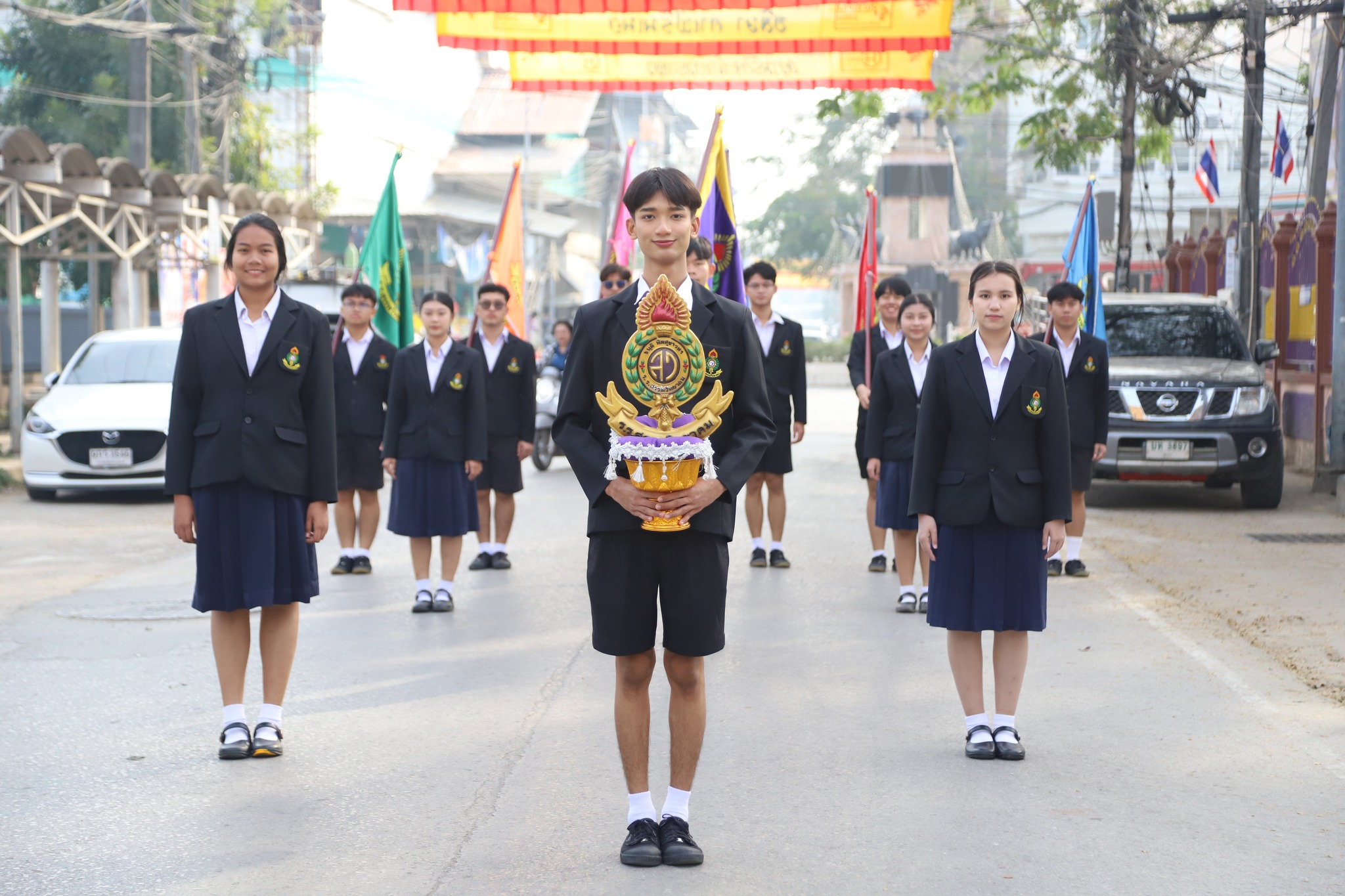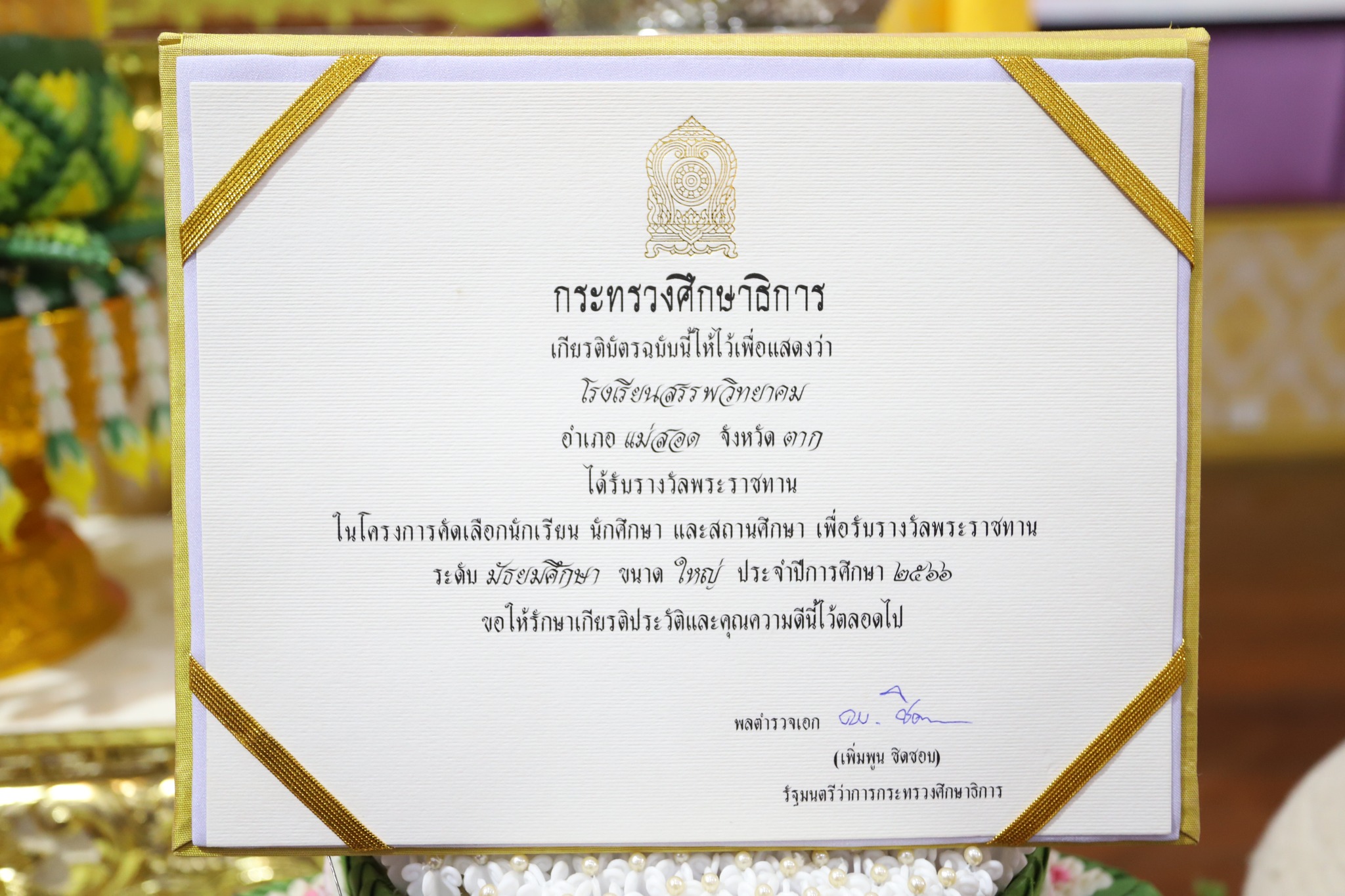 วันที่ 23 มกราคม 2568 โรงเรียนสรรพวิทยาคม สพม.ตาก นำโดยนายกฤษณะ เครืออยู่ ผู้อำนวยการโรงเรียน พร้อมด้วยคณะผู้บริหาร ครู บุคลากรและนักเรียน จัดพิธีอัญเชิญและฉลองรางวัล “สถานศึกษารางวัลพระราชทาน” ระดับมัธยมศึกษาขนาดใหญ่ ประจำปีการศึกษา 2566 มีนายประเดิม เดชายนต์บัญชา รองผู้ว่าราชการจังหวัดตาก เป็นประธานในพิธีเปิดกรวยถวายราชสักการะ นายกฤษณะ เครืออยู่ ผู้อำนวยการโรงเรียนสรรพวิทยาคม และนางสุภัทร เงินดี อดีตผู้อำนวยการโรงเรียนสรรพวิทยาคม ร่วมอัญเชิญรางวัลพระราชทานสถิตเบื้องหน้าพระบรมฉายาลักษณ์ พระบาทสมเด็จพระวชิรเกล้าเจ้าอยู่หัว โดยมีนายอาณัติ ผาพรม ผู้อำนวยการการสำนักงานเขตพื้นที่การศึกษามัธยมศึกษาตาก ผู้บริหารสถานศึกษา หัวหน้าส่วนราชการ คณะกรรมการสถานศึกษา คณะกรรมการเครือข่ายผู้ปกครอง คณะครู บุคลากรและนักเรียน เข้าร่วมพิธีดังกล่าว ณ หอประชุมสรรพการโรงเรียนสรรพวิทยาคม