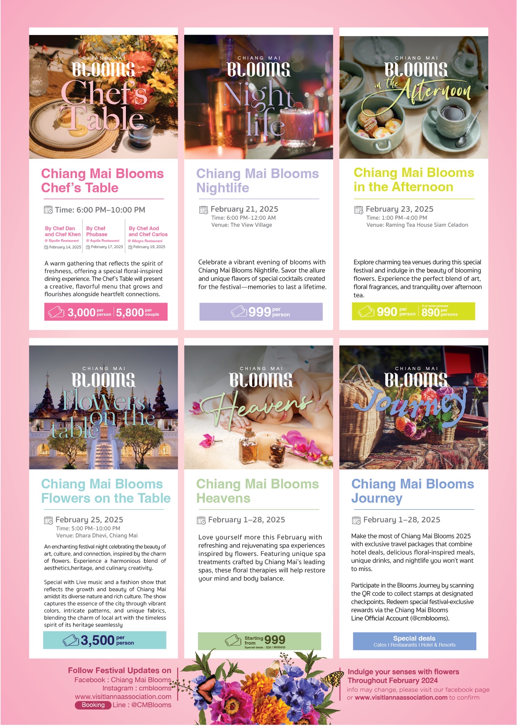 Every visit to Chiang Mai Blooms Festival offers a chance to experience something truly refreshing and delightful. Join us for an exclusive package that promises a new and revitalizing adventure, taking you through scenic paths filled with flowers and the natural beauty of Chiang Mai. This special package includes exclusive hotel deals, delicious meals, floral-inspired drinks, and a nightlife experience you won’t want to miss—an offer you can only find with Chiang Mai Blooms 2025 throughout February.