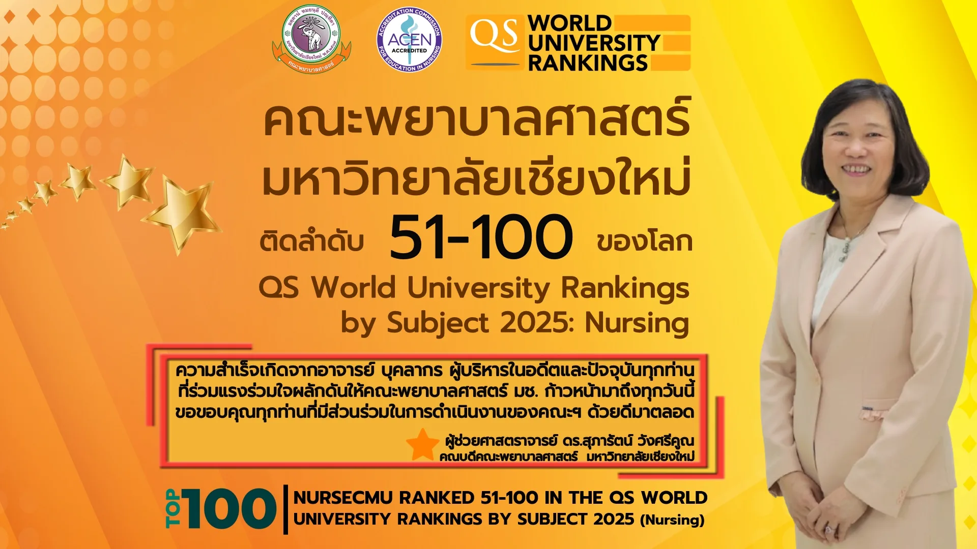 ผู้ช่วยศาสตราจารย์ ดร.สุภารัตน์ วังศรีคูณ คณบดีคณะพยาบาลศาสตร์ มหาวิทยาลัยเชียงใหม่ เปิดเผยว่า “ความสำเร็จเกิดจากอาจารย์ บุคลากร ผู้บริหารในอดีตและปัจจุบันทุกท่านที่ได้ร่วมแรงร่วมใจ ผลักดันให้คณะพยาบาลศาสตร์ มช. ก้าวหน้ามาถึงทุกวันนี้ ขอขอบคุณทุกท่านที่มีส่วนร่วมในการดำเนินงานของคณะฯ ด้วยดีมาตลอด สำหรับการจัดอันดับ QS World University Rankings by Subject ประจำปี 2568 (2025) คณะพยาบาลศาสตร์ มหาวิทยาลัยเชียงใหม่ ได้รับคะแนนตามตัวชี้วัด ประกอบด้วย Employer Reputation (Score: 70.3) H-index Citations (Score 72.6) Citations per Paper (Score: 83.2) และ Academic Reputation (Score: 75)”