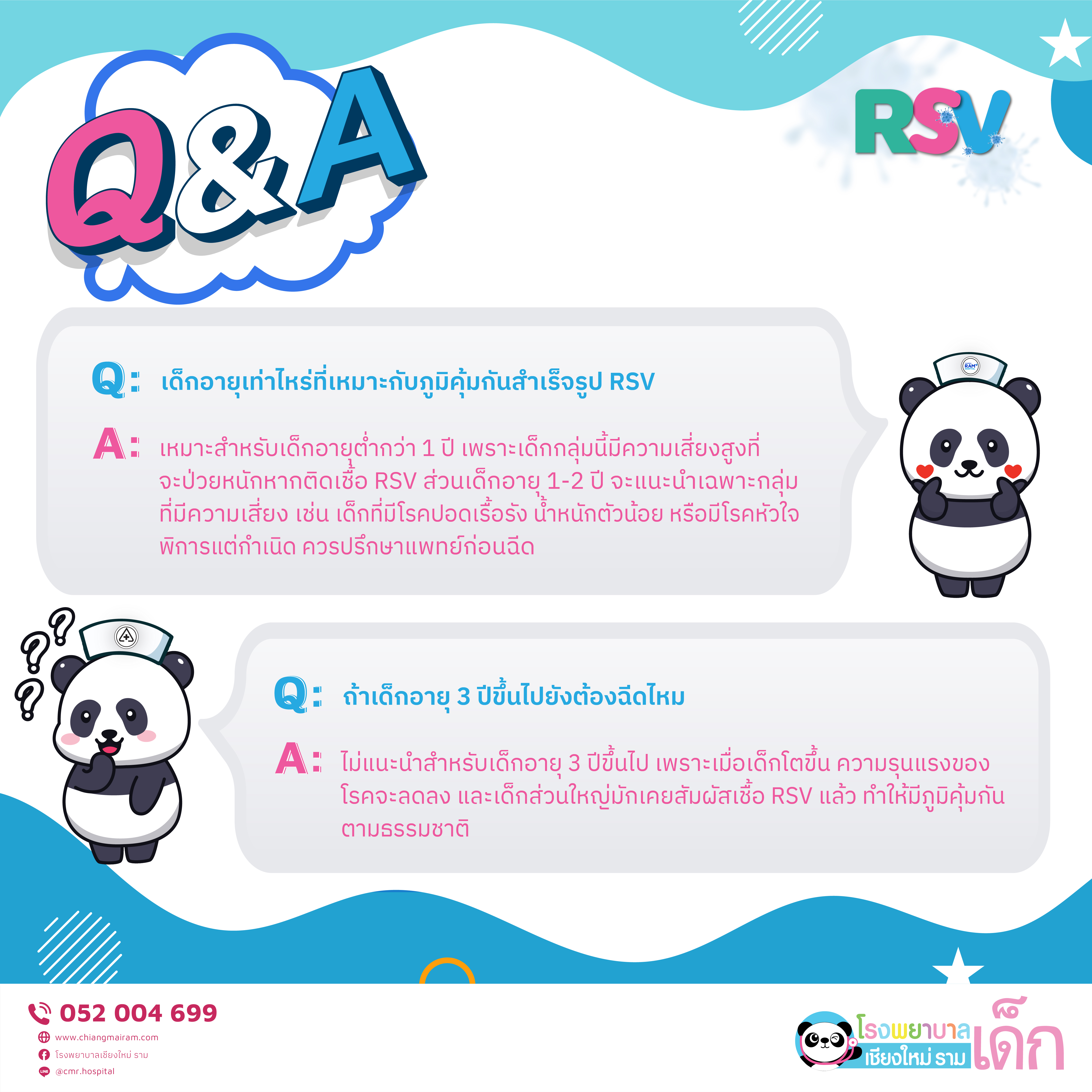 ไม่พลาดคำตอบจาก Live “เปิดตัว ภูมิคุ้มกัน RSV ที่แรกในเชียงใหม่“ โดย 👨🏻⚕️ นพ.กฤษณะ คงถาวรสกุล กุมารแพทย์โรคติดเชื้อ และ 👨🏼⚕️ นพ.สมรัก รังคกูลนุวัฒน์ กุมารแพทย์โรคระบบหายใจ ได้รวบรวมคำถามยอดฮิตมาให้คุณพ่อคุณแม่แล้ว❗️