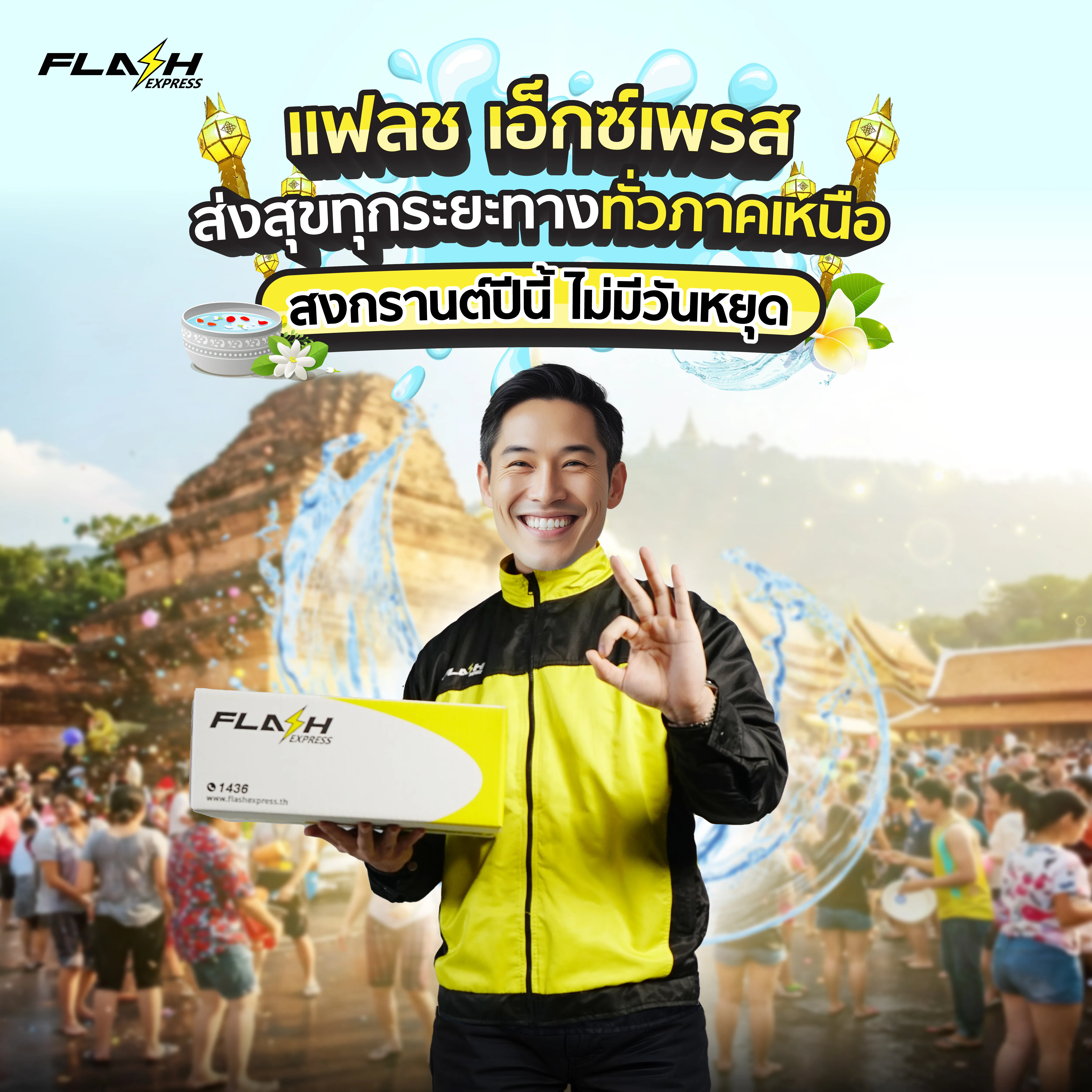 บริษัท แฟลช เอ็กซ์เพรส จำกัด ผู้นำด้านธุรกิจขนส่งและโลจิสติกส์มืออาชีพระดับสากล ยังคงให้บริการรับ-ส่งพัสดุทุกวัน ไม่มีวันหยุด แม้ในช่วงเทศกาลสงกรานต์ ระหว่างวันที่ 13-16 เมษายน 2568 เพื่อให้บริการพี่น้องชาวภาคเหนือสามารถส่งพัสดุได้ตามปกติอย่างครอบคลุมในทุกพื้นที่ด้วยมีจุดให้บริการรับ-ส่งพัสดุ และเครือข่ายพันธมิตรมากกว่า 2,500 จุด ตอกย้ำคอนเซปต์ “ส่งสุขทุกระยะทาง” โดยมีแนวคิดที่ว่าไม่ว่าคุณจะอยู่ที่ไหน แฟลชพร้อมให้บริการรับ-ส่งพัสดุคุณทุกที่ และพร้อมดูแลพัสดุของคุณให้ถึงปลายทางอย่างปลอดภัยด้วยมาตรฐานระดับมืออาชีพ รวมถึงบริการเรียกเข้ารับพัสดุถึงที่ฟรีไม่มีขั้นต่ำตั้งแต่ชิ้นแรก นอกจากนี้ยังมี 4 บริการเสริมเพื่อให้ลูกค้าได้เลือกใช้บริการเพิ่มเติม ได้แก่ Happy Return ถ้าผู้รับไม่อยู่บ้านพัสดุตีกลับฟรี ,Box Shield กล่องพัสดุปลอดภัย , Flash Care ของเสียหายเคลมเงินคืนได้เต็มจำนวน และOn-Time Delivery ส่งตรงเวลา ส่งช้าส่งฟรี