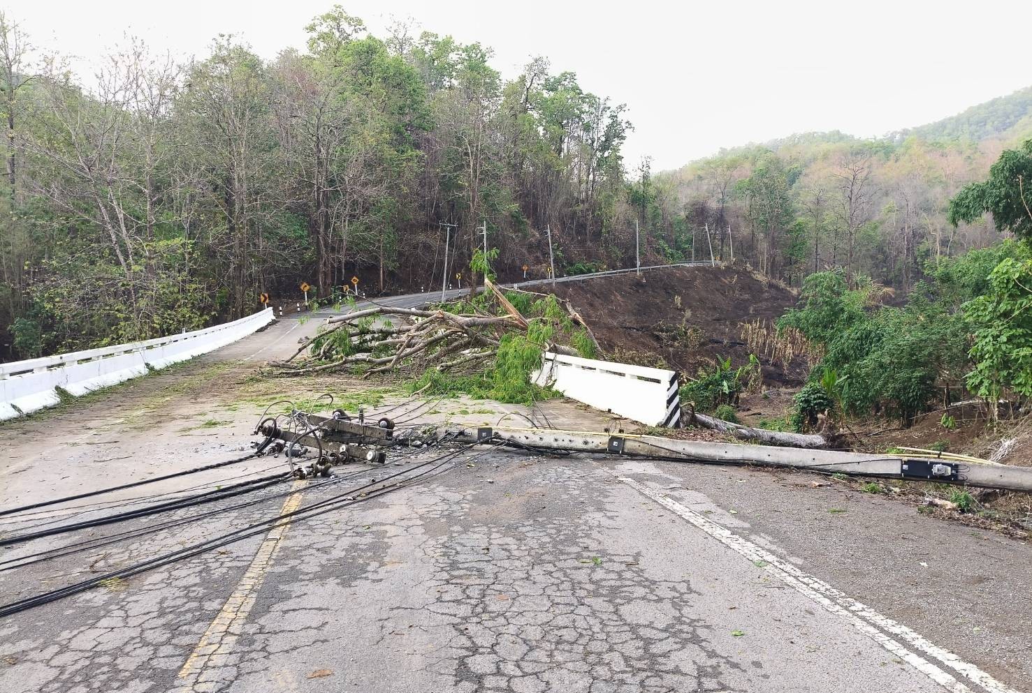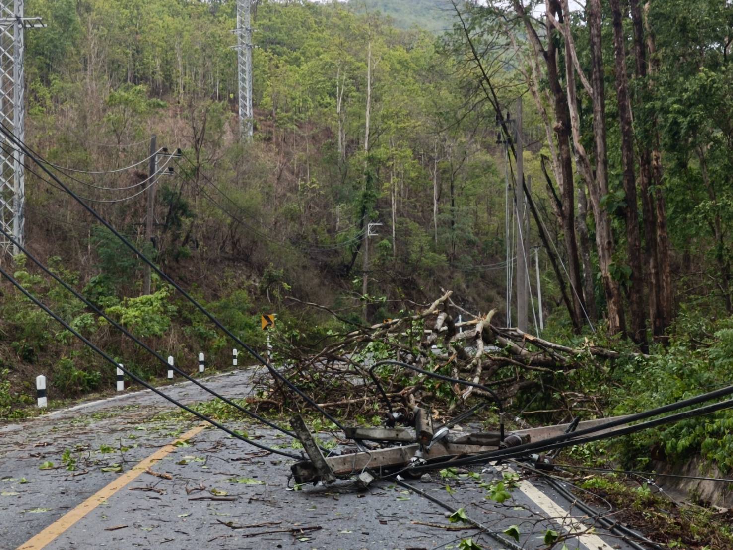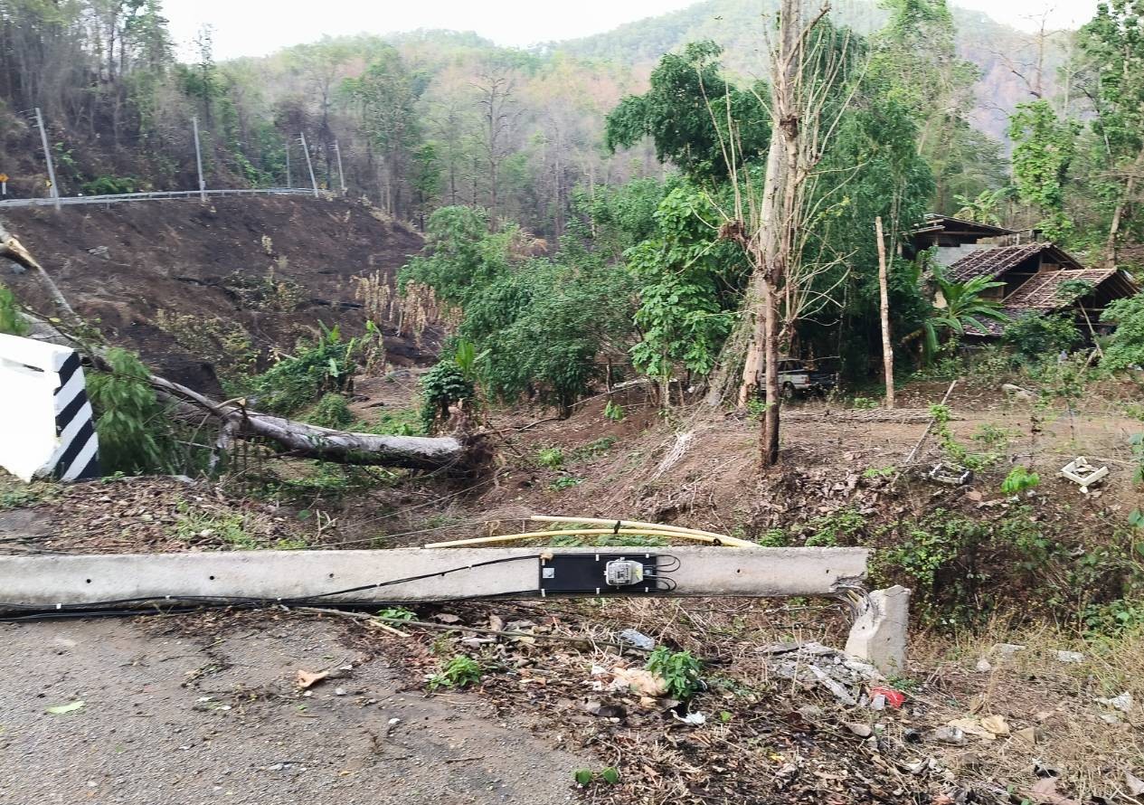 วันนี้ (28 เม.ย. 2568) เมื่อเวลา 16.30 น ได้เกิดฝนตกลมแรงในพื้นที่ อ.แม่สะเรียง จ.แม่ฮ่องสอน จนเป็นเหตุให้เกิดต้นไม้และเสาไฟฟ้าหักโค่น บนเส้นทางหลวงแผ่นดินหมายเลข 108 แม่สะเรียง – เชียงใหม่ ช่วงระหว่าง บ้านแม่เหาะ – แม่สะเรียง ช่วง ระหว่าง หลักกิโลเมตรที่ 175 – หลักกิโลเมตร ที่ 188 จำนวน 4 จุด มีเสาไฟล้มทับปิดขวางเส้นทางจราจร 4 ต้น จนท.ต้องตัดกระแสไฟฟ้าเพื่อเข้าปฎิบัติงาน ส่งผลให้ไฟในพื้นที่ดับกว่า 3 ชั่วโมง