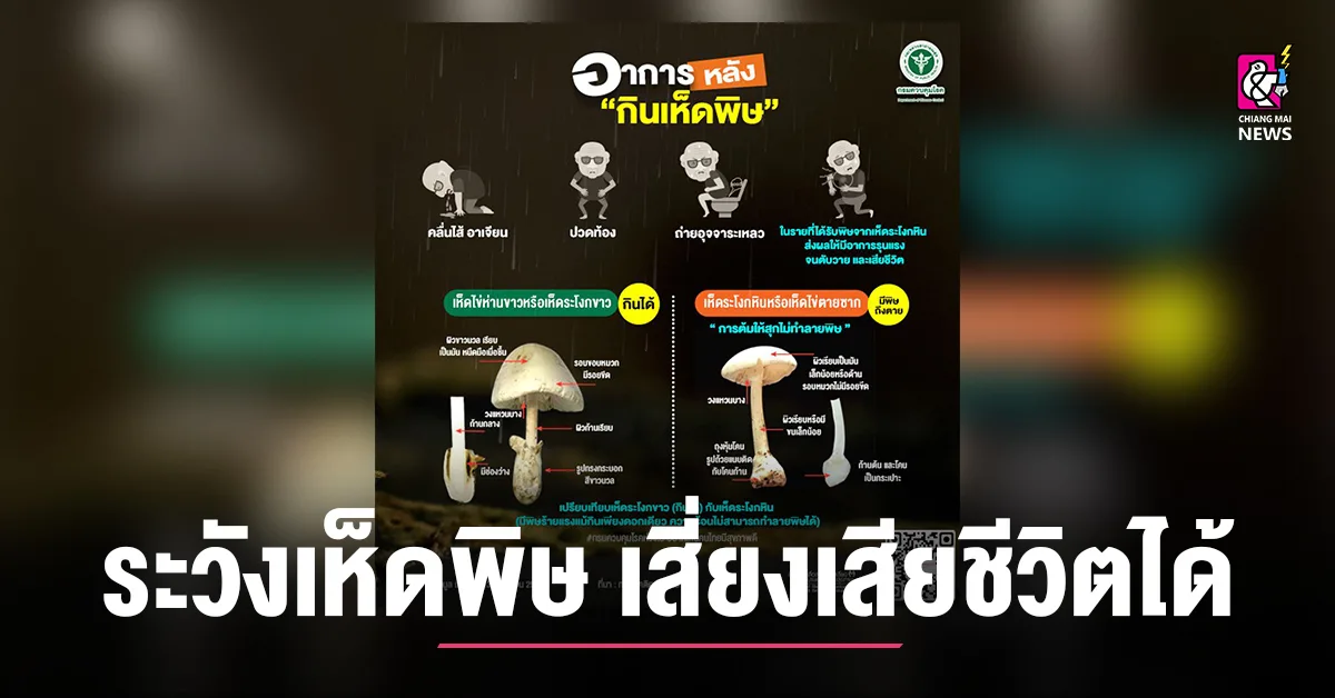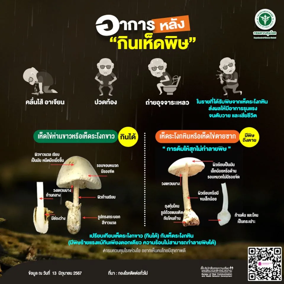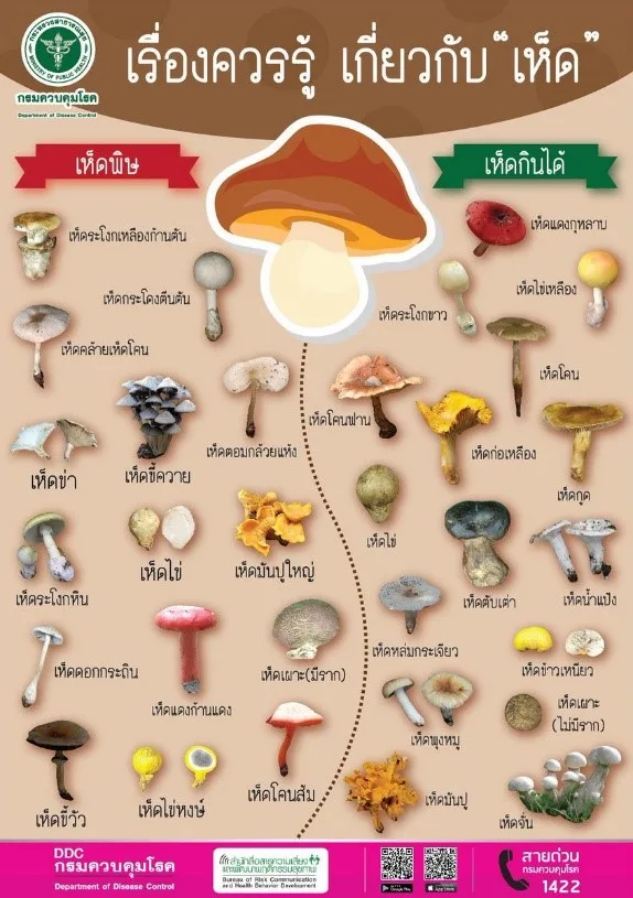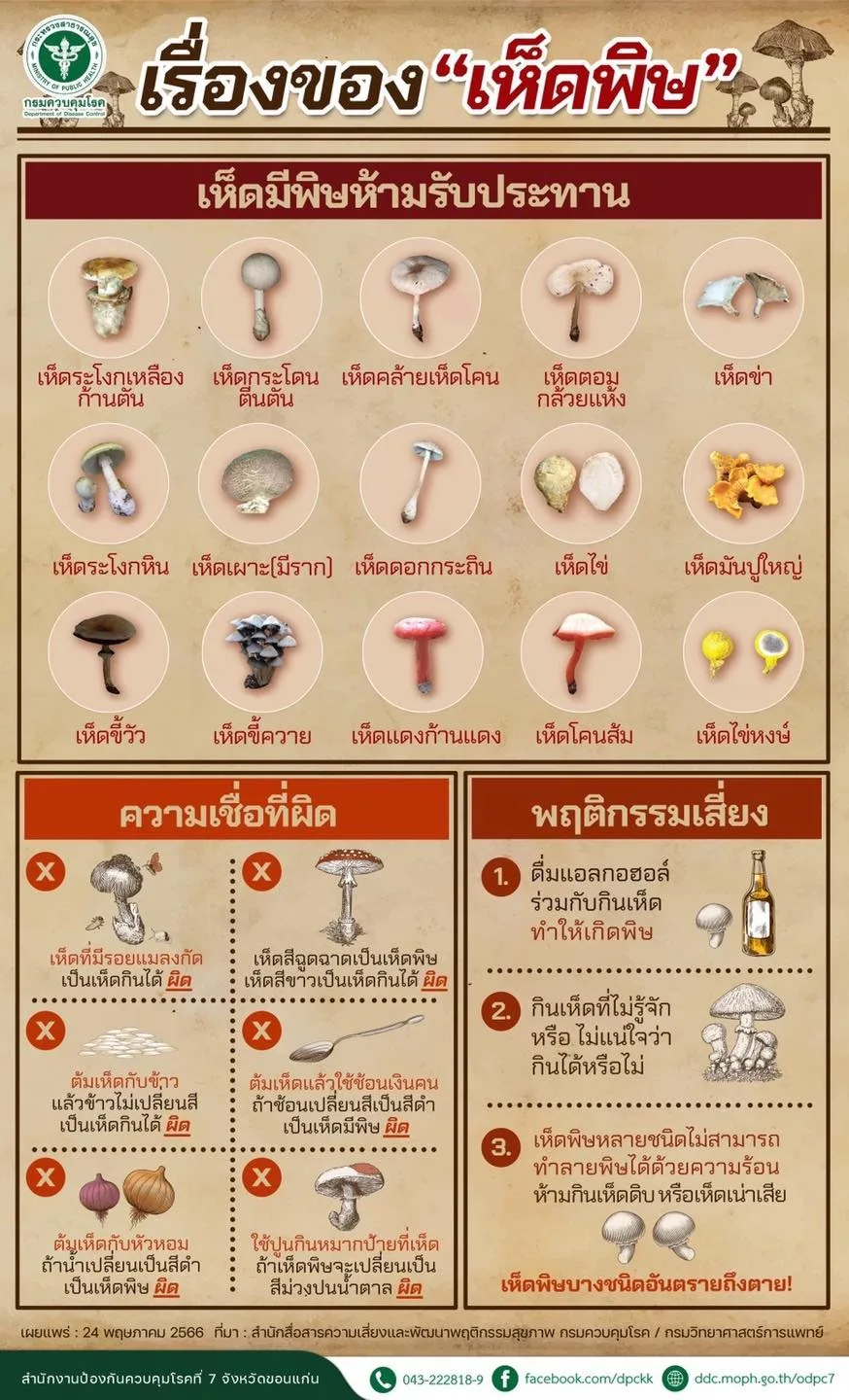 จากข้อมูลของกรมควบคุมโรค กระทรวงสาธารณสุข เนื่องจากช่วงนี้หลายพื้นที่เริ่มมีฝนตก ทำให้หลายพื้นที่เริ่มมีเห็ดป่า หรือเห็ดขึ้นเองตามธรรมชาติหลากหลายชนิด ทั้งเห็ดกินได้และเห็ดพิษ โดยเฉพาะเห็ดในระยะดอกตูม ซึ่งมีลักษณะคล้ายกันจนไม่สามารถแยกได้ด้วยตาเปล่าหากไม่มีความรู้ความชำนาญ อาจทำให้ประชาชนเข้าใจผิด และนำเห็ดพิษมาปรุงประกอบอาหารจนเกิดการเจ็บป่วยและเสียชีวิตได้