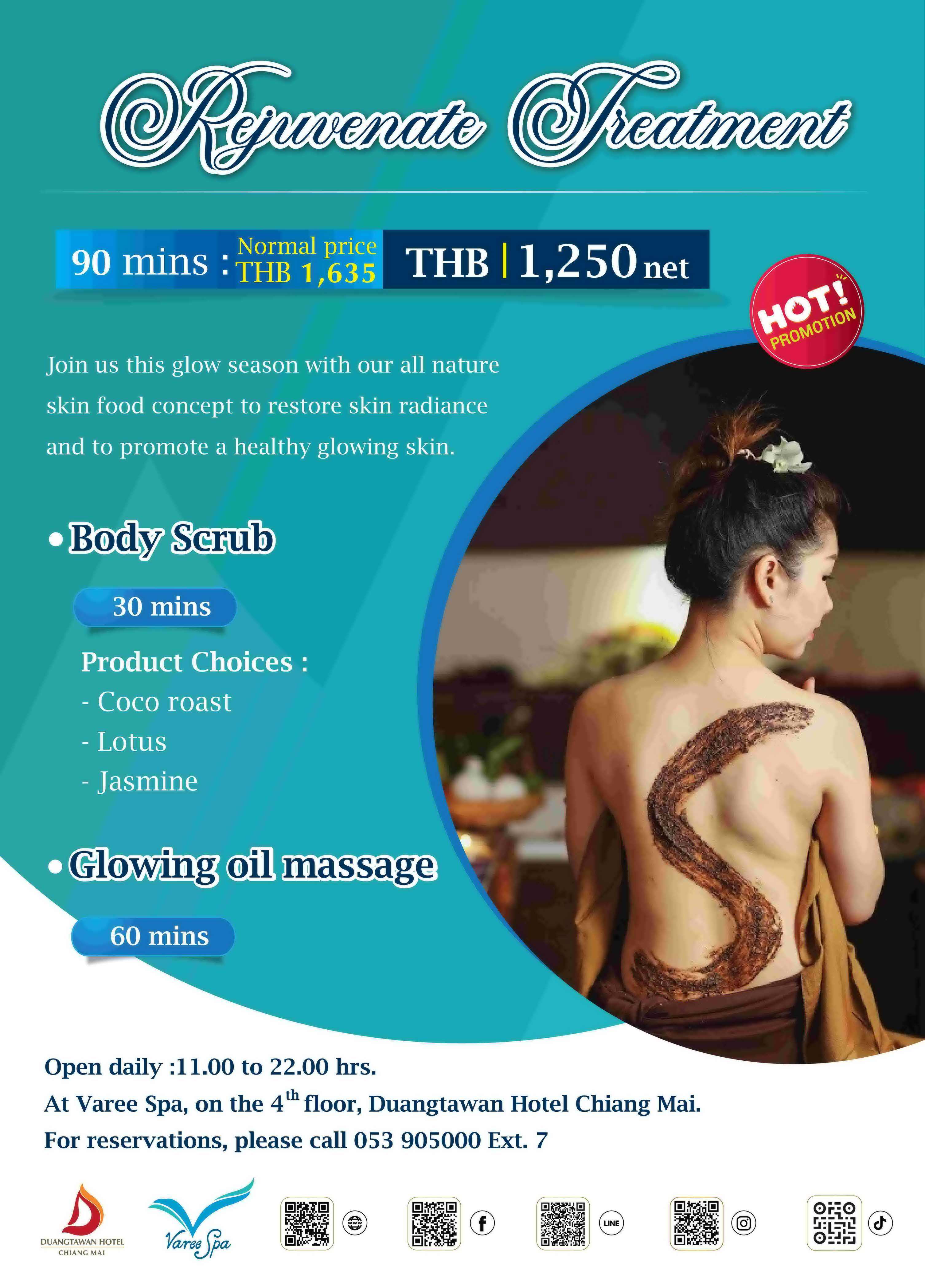 “ วารี สปา ” ตั้งอยู่บนชั้น 4 โรงแรมดวงตะวัน เชียงใหม่ ย่านไนท์บาซ่าร์ ที่ให้บริการมาตรฐานอัตลักษณ์ไทยล้านนาสปา โดยใช้ภูมิปัญญาแผนไทย เทคนิคการนวดแบบไทยล้านนาและแผนไทยผสมผสานได้อย่างลงตัว ร่วมกับการประยุกต์ใช้สมุนไพรและพืชผักผลไม้ในท้องถิ่นตามฤดูกาล ในการดูแลสุขภาพแบบ องค์รวม ทั้ง 5 ด้าน รูป รส กลิ่น เสียง สัมผัส ในบรรยากาศที่ผ่อนคลาย ขอแนะนำ Rejuvenate Spa Treatment ขัดตัว 30 นาทีและนวดอโรม่า 60 นาที โดยการขัดตัวด้วยส่วนผสมพิเศษ ซึ่งมีส่วนผสมของ โยเกิร์ต นมสด ข้าวโอ๊ต และกากกาแฟ เป็นสูตรขัดตัว ซึ่งในกากกาแฟนั้น มีคุณบัติพิเศษคือ ขจัดผิวชั้นนอกที่แห้งกร้าน ขจัดคราบและสิ่งสกปรกที่อยู่บนผิวชั้นนอก ให้หลุดออกอย่างหมดจด ช่วยลดรอยดำ ลดเลือนริ้วรอย ขัดผิวให้เนียนใส เผยผิวสวย สดใส ในเวลาอันรวดเร็ว และต่อด้วยการนวดน้ำมันอีก 60 นาที ซึ่งจะมีกลิ่นให้เลือก อาทิ กลิ่นกุหลาบ กลิ่นลาเวนเดอร์ ช่วยเติมความชุ่มชื้นให้ผิว เพิ่มวิตามิน และบำรุงลึกให้ผิวเนียนนุ่ม ชุ่มชื้น เปร่งปรั่ง มีสุขภาพดีขึ้นในเวลาอันรวดเร็ว