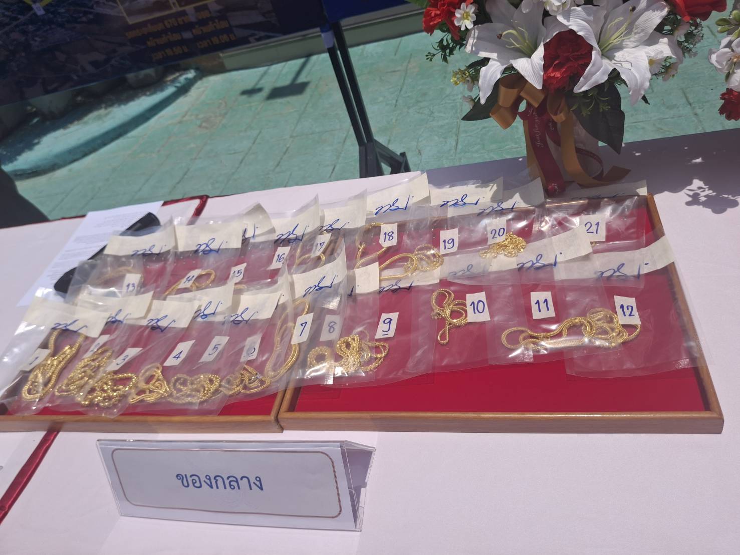 พร้อมของกลางเป็นสร้อยคอทองคำพระเหลี่ยมจำนวน 1 เส้น รถยนต์กระบะ ยี่ห้อโตโยต้า รุ่นรีโว่หมายเลขทะเบียน กต จำนวน 1 คัน รถยนต์กระบะยี่ห้อโตโยต้ารุ่นวีโก้ หมายเลขทะเบียนตาก จำนวน 1 คัน รถจักรยานยนต์ยี่ห้อ ยามาฮ่ารุ่นฟีโน่ไม่ติดแผ่นป้ายทะเบียน จำนวน 1 คัน เสื้อคลุมแขนยาวพนักงานส่งของสีเขียว 1 ตัว หน้ากากกันลมซึ่งถูกถอดจากหมวกกันน็อคสวมใส่ในวันก่อเหตุจำนวน 1 ชิ้น โทรศัพท์มือถือ 2 เครื่อง สร้อยคอทองคำรวม จำนวน 21 เส้น ตู้เซฟนิรภัย จำนวน 1 ตู้