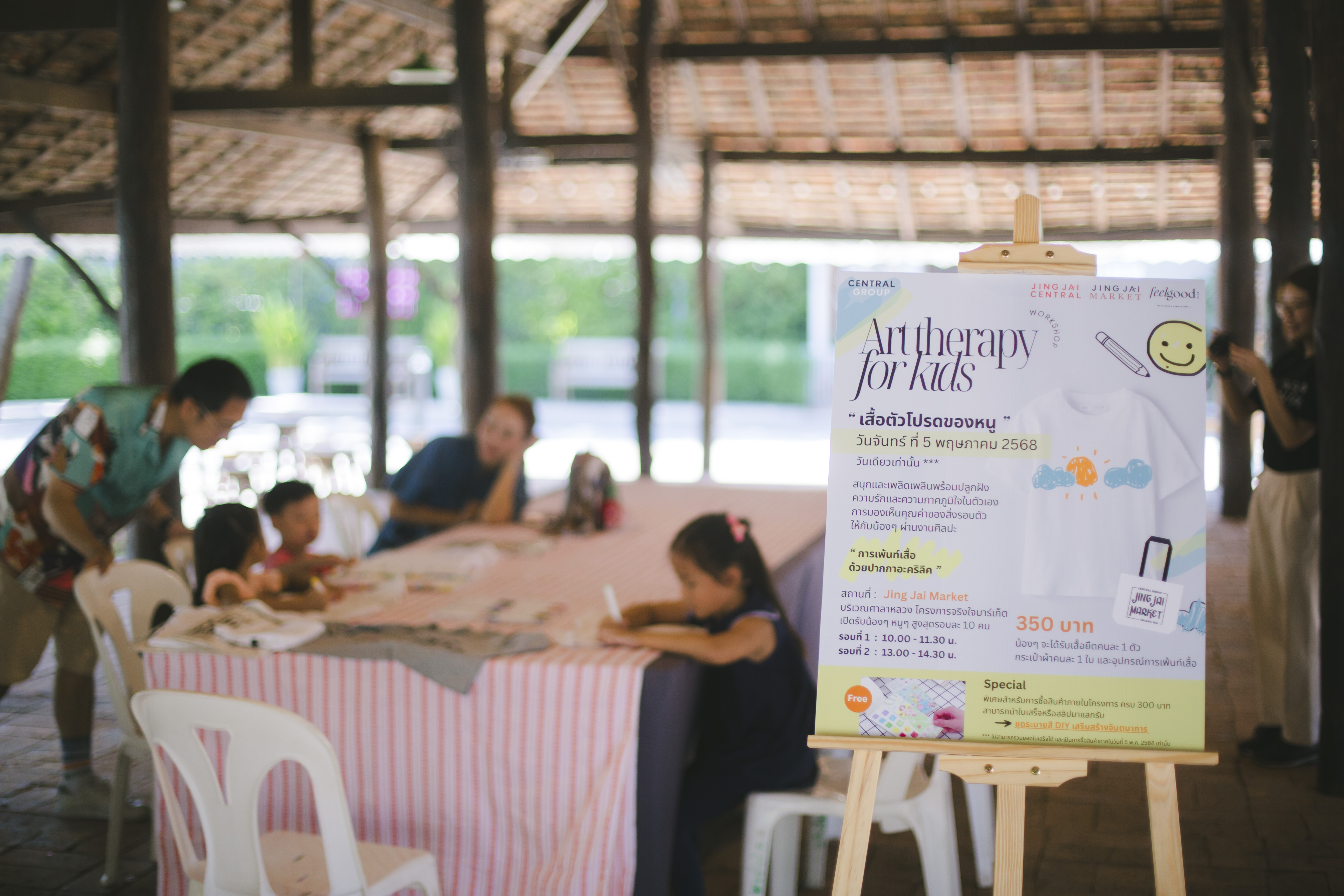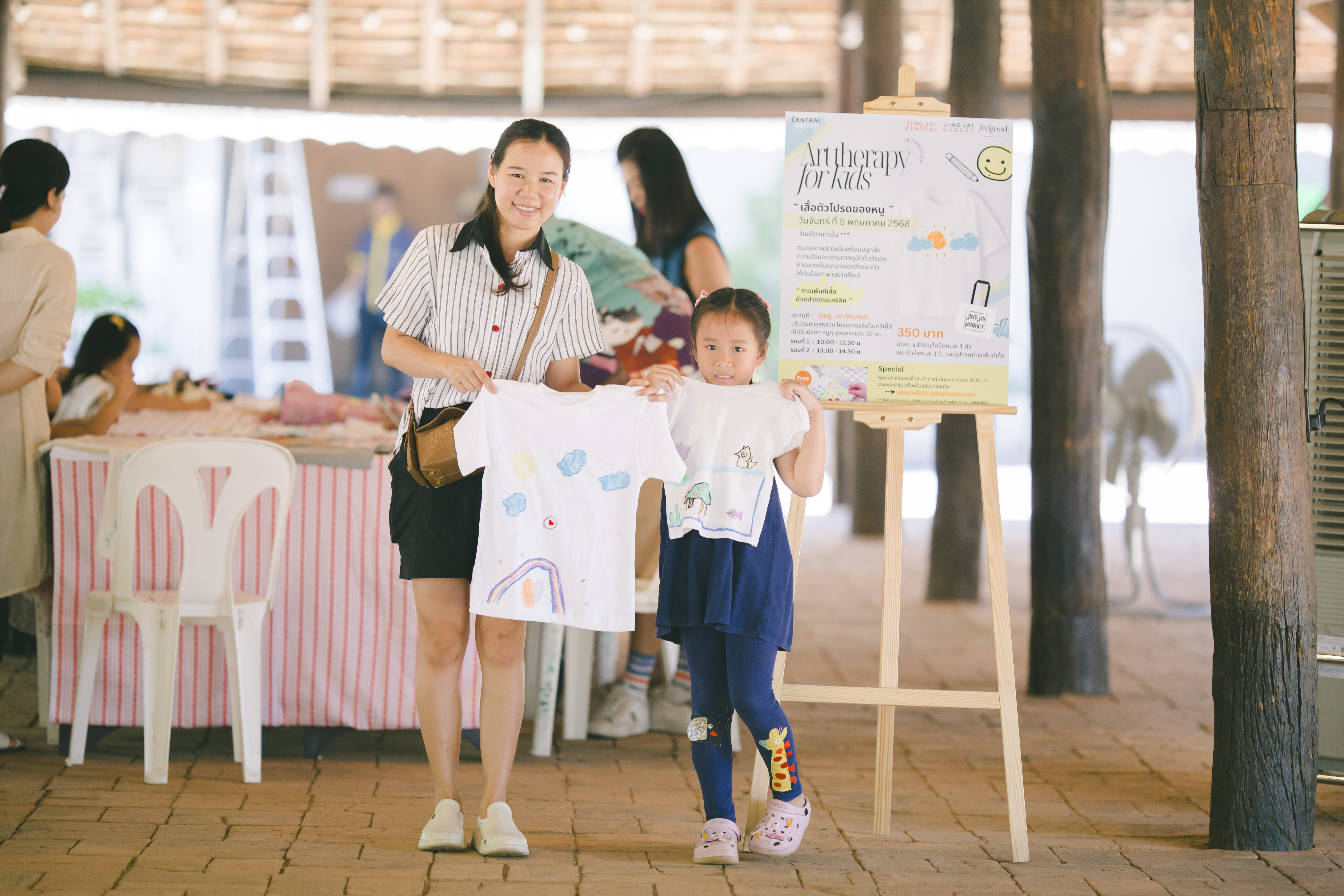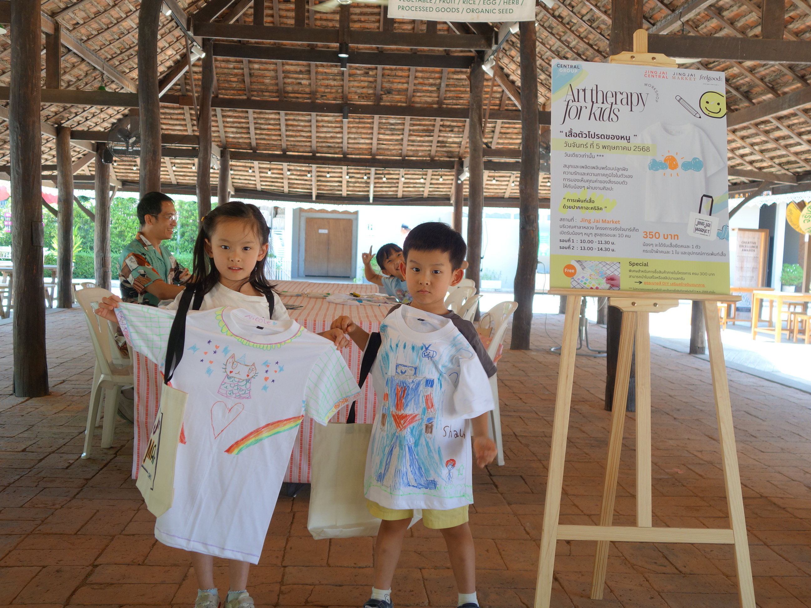 🎨 Jing Jai Kids Workshop “Art Therapy for kids : เพ้นท์เสื้อด้วยปากกาอะคริลิค” โดย Feel Good Club – Activity ✨กิจกรรมเสริมสร้างความภาคภูมิใจในตัวเอง และการมองเห็นคุณค่าของสิ่งรอบตัวผ่านงานศิลปะ ที่บริเวณศาลาหลวง ภายในโครงการจริงใจมาร์เก็ต