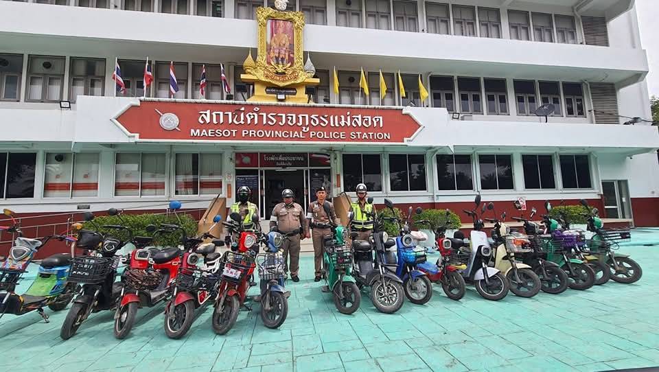 เมื่อวันที่ 10 มิถุนายน 2568 พ.ต.อ.รัง ดาวดึงษ์ ผกก.สภ.แม่สอด จ.ตาก นำกำลังเจ้าหน้าที่ตำรวจชุดสายตรวจและเจ้าหน้าที่ตำรวจงานจราจร ได้ร่วมกันปฏิบัติหน้าที่ในการตรวจสอบรถจักรยานไฟฟ้าในพื้นที่เขตรับผิดชอบ ดำเนินการตรวจยึดรถจักรยานไฟฟ้าจำนวน 22 คัน ซึ่งพบว่าผู้ขับขี่เป็นบุคคลต่างด้าว และรถมีสภาพไม่มั่นคงแข็งแรง อาจก่อให้เกิดอันตรายต่อผู้ใช้และประชาชนโดยรอบ