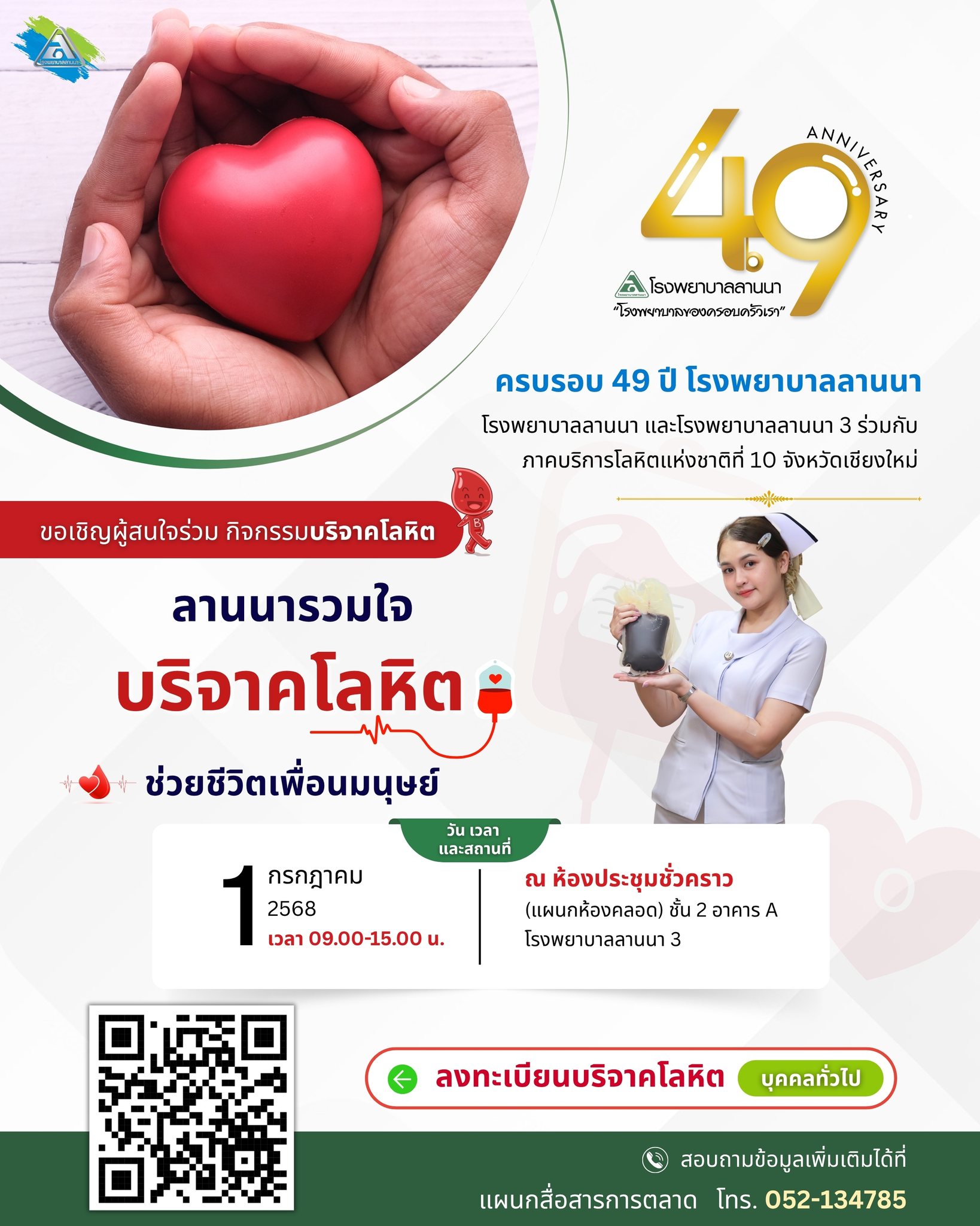 😊 เนื่องในโอกาสครบรอบ 49 ปีแห่งการก่อตั้ง โรงพยาบาลลานนา ขอเรียนเชิญผู้สนใจทุกท่านเข้าร่วมกิจกรรม “ลานนารวมใจ บริจาคโลหิต ช่วยชีวิตเพื่อนมนุษย์”
