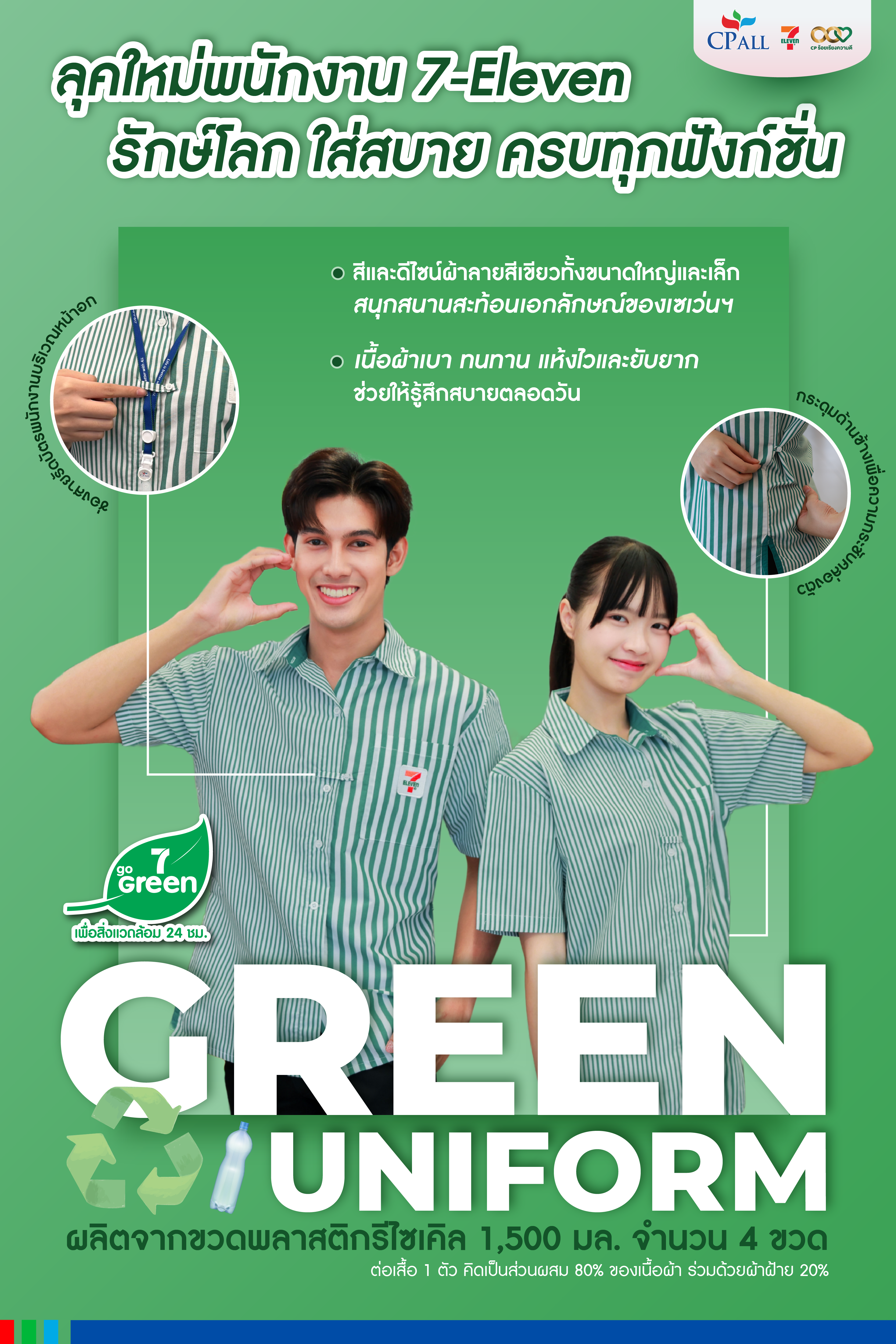 โดยไฮไลต์ของชุดยูนิฟอร์มพนักงานดีไซน์ใหม่นี้ คือ การผลิตจากขวดพลาสติกรีไซเคิลขนาด 1,500 มล. จำนวน 4 ขวดต่อเสื้อ 1 ตัว คิดเป็นส่วนผสม 80% ของเนื้อผ้า ร่วมด้วยผ้าฝ้าย 20% เริ่มทยอยใช้งานจริงในร้านเซเว่น อีเลฟเว่นทั่วประเทศตั้งแต่เดือนมิถุนายน 2568 เป็นต้นไป ตอกย้ำนโยบายด้านความยั่งยืนเรื่องการลดการใช้พลาสติกที่มุ่งลดปริมาณขยะพลาสติกและส่งเสริมเศรษฐกิจหมุนเวียน (Circular Economy) ของซีพี ออลล์