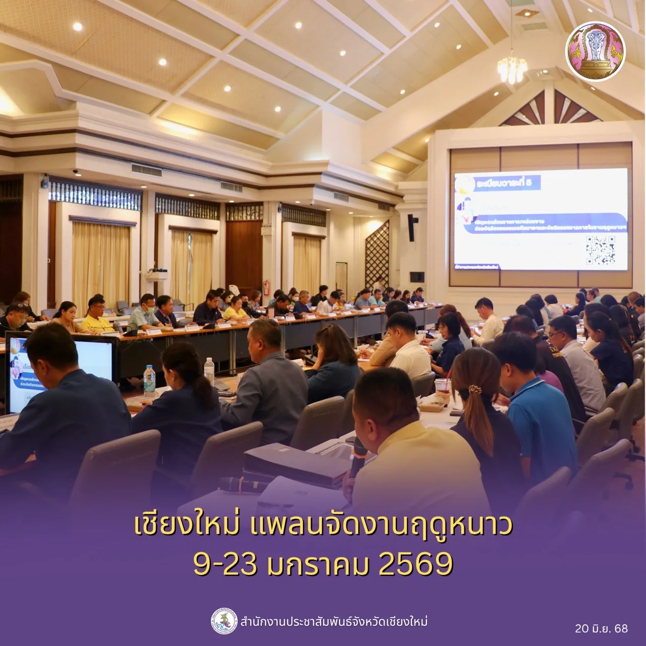 วันนี้ (20 มิ.ย. 68) ที่หอประชุมเฉลิมพระเกียรติ 80 พรรษา องค์การบริหารส่วนจังหวัดจังหวัดเชียงใหม่ นายนิรัตน์ พงษ์สิทธิถาวร ผู้ว่าราชการจังหวัดเชียงใหม่ เป็นประธานประชุมร่วมกับส่วนราชการ หน่วยงานที่เกี่ยวข้อง เพื่อหารือเตรียมความพร้อมการจัดงานฤดูหนาว นางสาวเชียงใหม่และงาน OTOP ของดีเมืองเชียงใหม่ ประจำปี 2569 ครั้งที่ 1 โดยในปีถัดไปมีกำหนดจัดขึ้นในวันที่ 9-23 มกราคม 2569 เพื่อให้หน่วยงานราชการ หน่วยงานรัฐวิสาหกิจ สถาบันการศึกษา องค์กรปกครองส่วนท้องถิ่น และภาคเอกชนในพื้นที่จังหวัดเชียงใหม่ ได้จัดแสดงนิทรรศการหรือการให้บริการของภาครัฐตามภารกิจของหน่วยงาน อีกทั้งเป็นการส่งเสริมการรักษาขนบธรรมเนียมประเพณี การอนุรักษ์ศิลปวัฒนธรรมอันดีงามของเชียงใหม่ ส่งเสริมการมีส่วนร่วมของผู้นำชุมชน ผู้นำท้องที่และผู้นำท้องถิ่นอีกด้วย