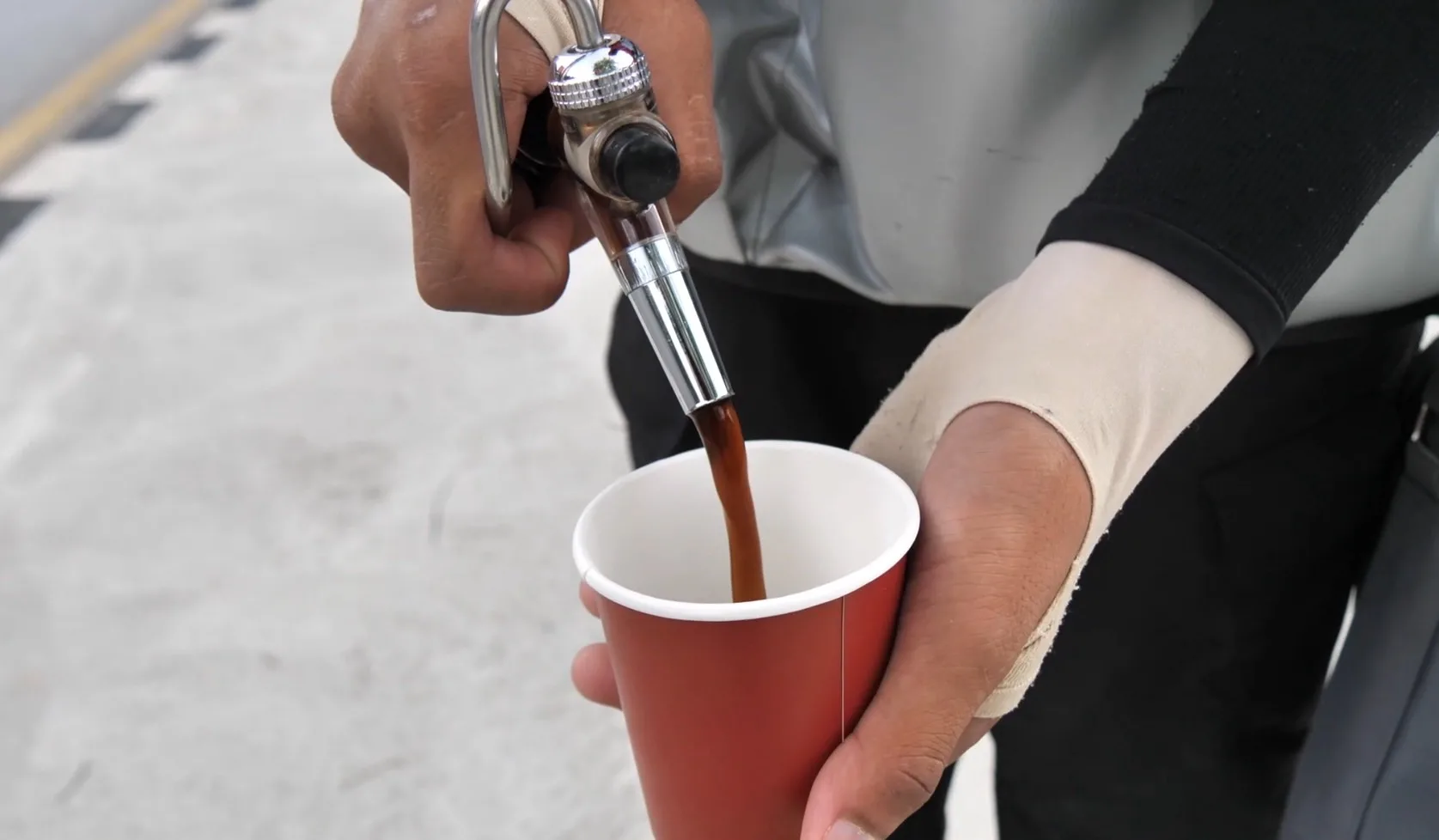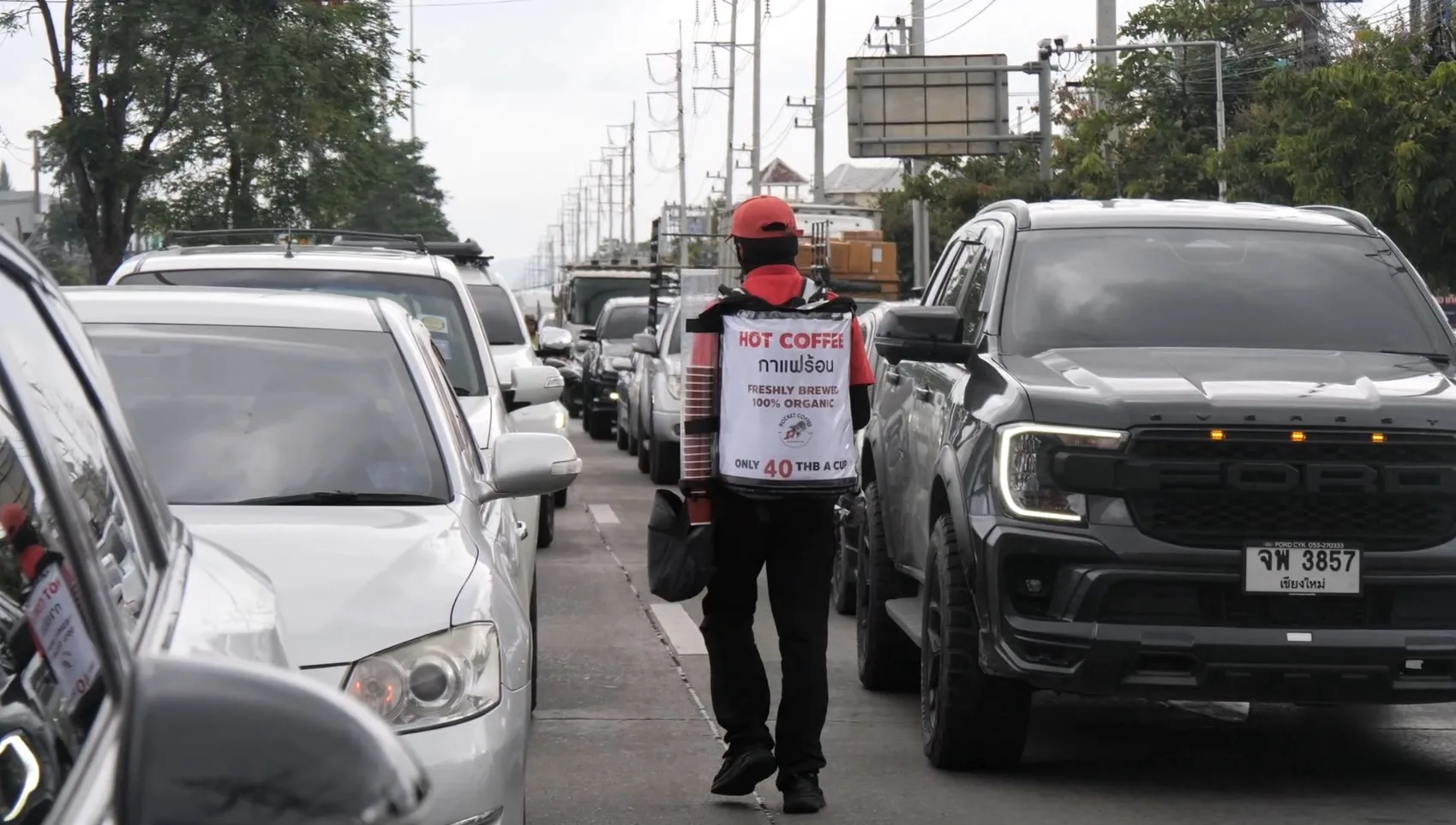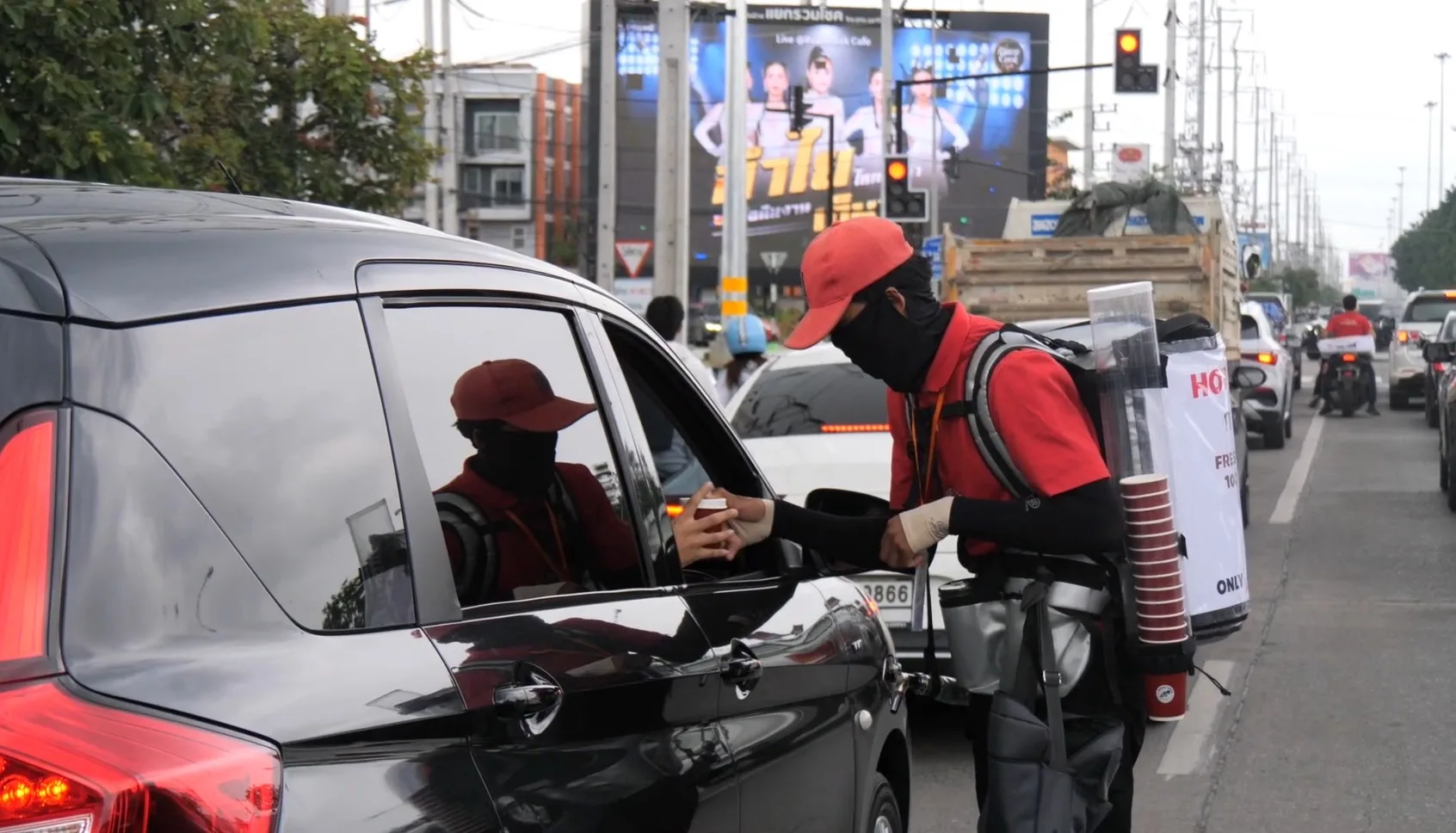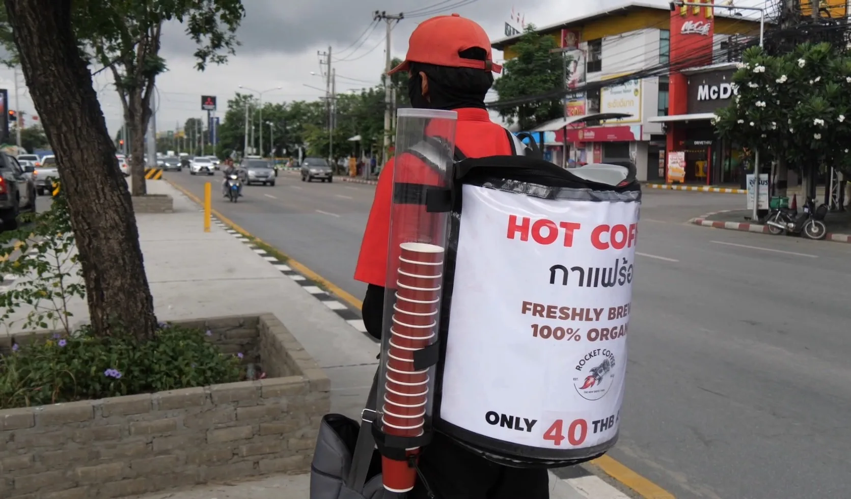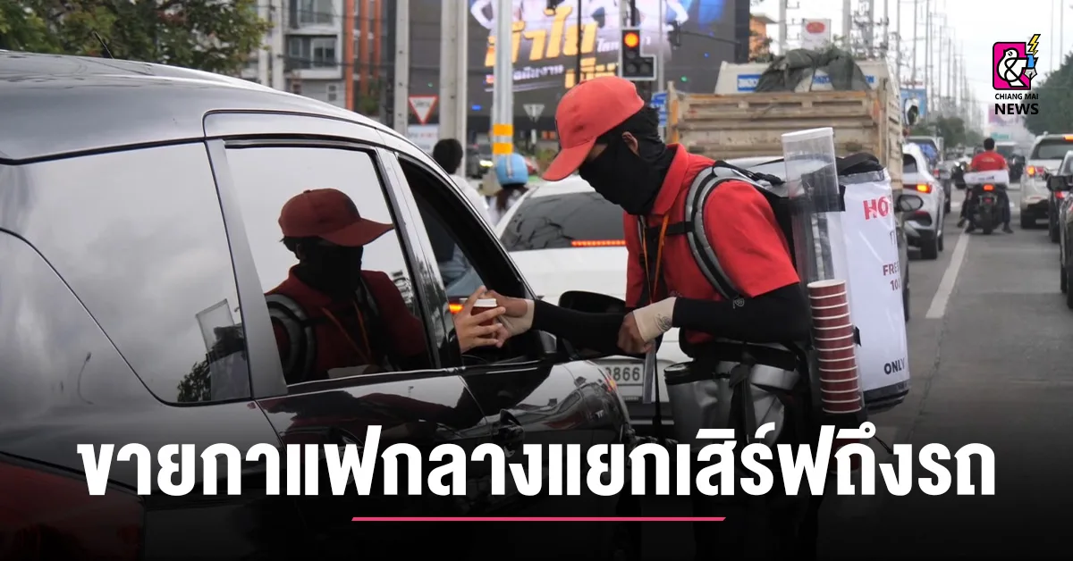 ผู้ใช้รถที่จอดติดไฟแดงบริเวณแยกรวมโชคมีชัย อ.เมืองเชียงใหม่ ในชั่วโมงเร่งด่วน พากันสะดุดตากับภาพแปลกตา พนักงานหนุ่มในชุดเสื้อแดงกางเกงดำ ด้านหลังสะพายถังเก็บความร้อนขนาดใหญ่พร้อมอุปกรณ์ครบครันดูคล้ายนักบินอวกาศ เดินขายกาแฟแบบเสิร์ฟถึงรถ เรียกว่าสะดวกรวดเร็วยิ่งกว่าไดรฟ์ทรู ตอบโจทย์วิถีคนในเมืองและคนที่ต้องเติมกาแฟในยามเช้า แต่ไม่มีเวลามากพอที่จะเข้าไปซื้อในร้านกาแฟด้วยตัวเองในชั่วโมงเร่งด่วน
