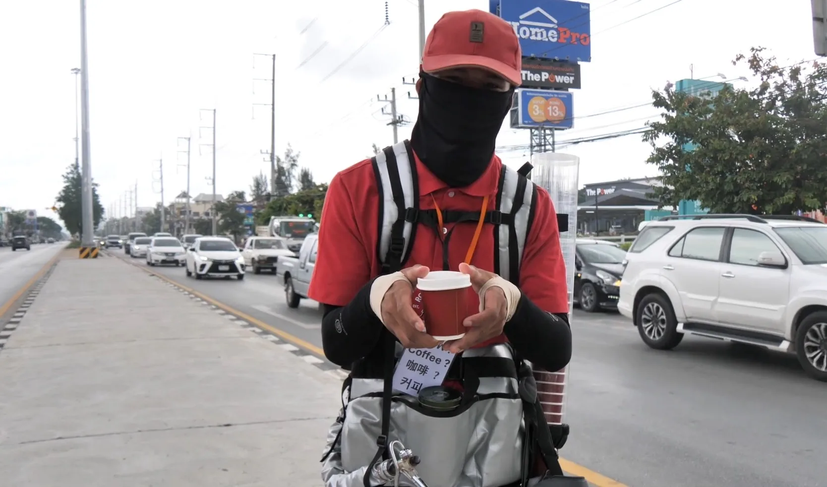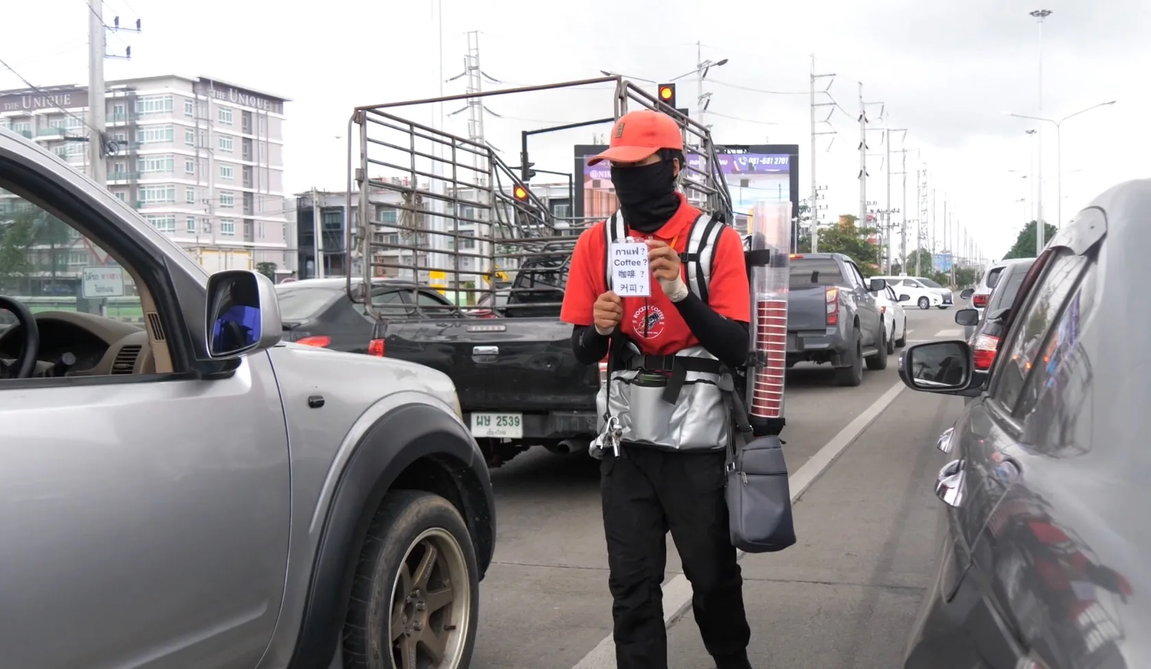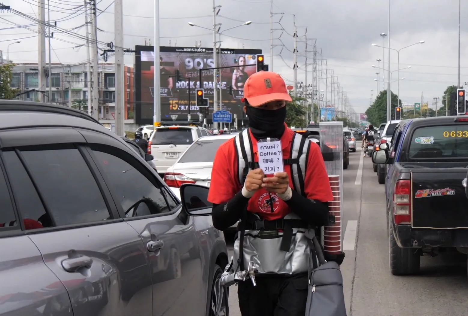 เงินอยู่ในอากาศ ร็อคเกตแมนโผล่ขายกาแฟกลางแยกเสิร์ฟถึงรถ ตอบโจทย์คอกาแฟชั่วโมงเร่งด่วน