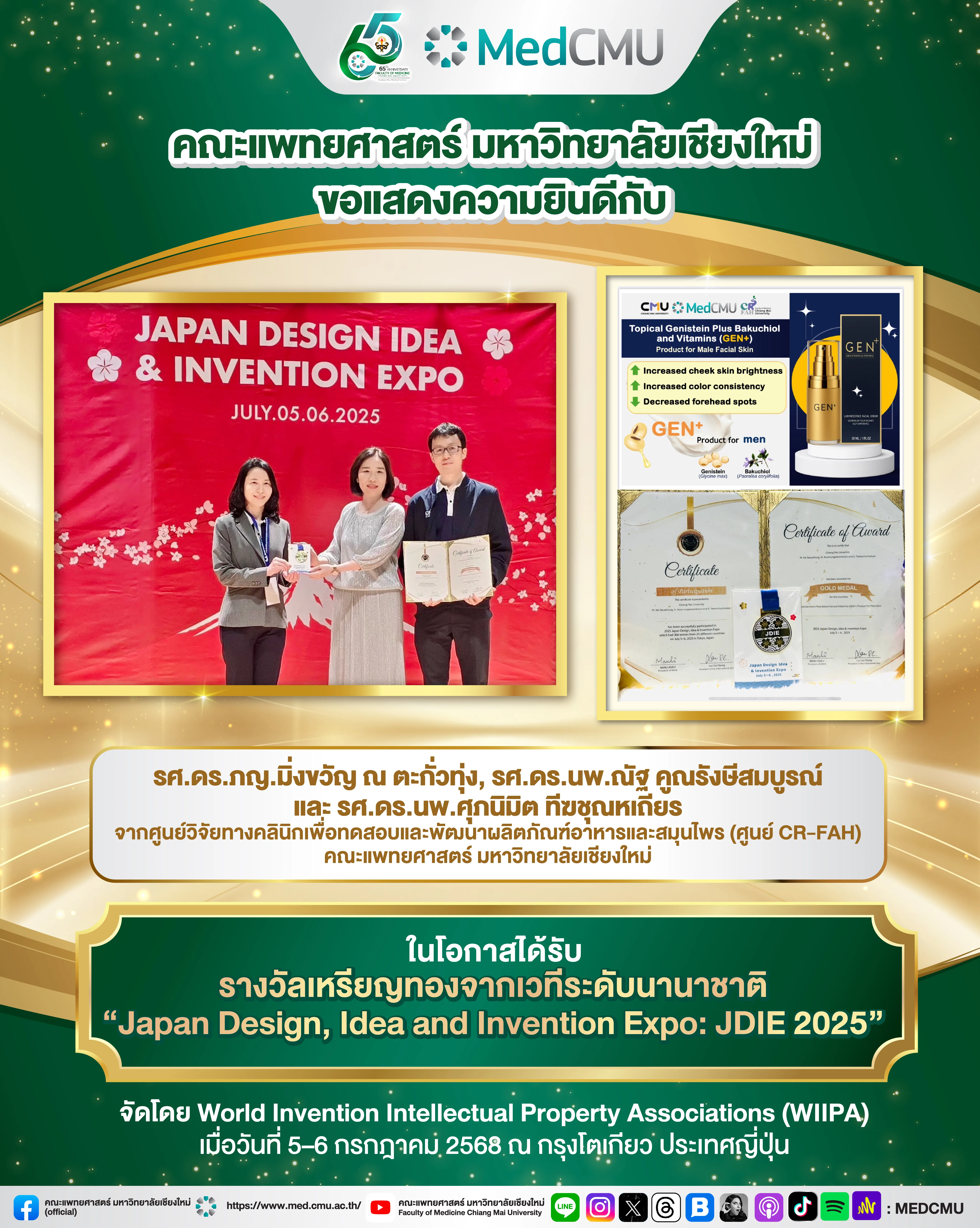 โดยผลงานนวัตกรรมที่ได้รับรางวัล คือ “ผลิตภัณฑ์เจนิสทิอินผสมบาคูคิออลและวิตามิน (เจนพลัส) สำหรับผิวผู้ชาย รูปแบบทาภายนอก (Topical Genistein Plus Bakuchiol and Vitamins (GEN+) Product for Male Skin)”