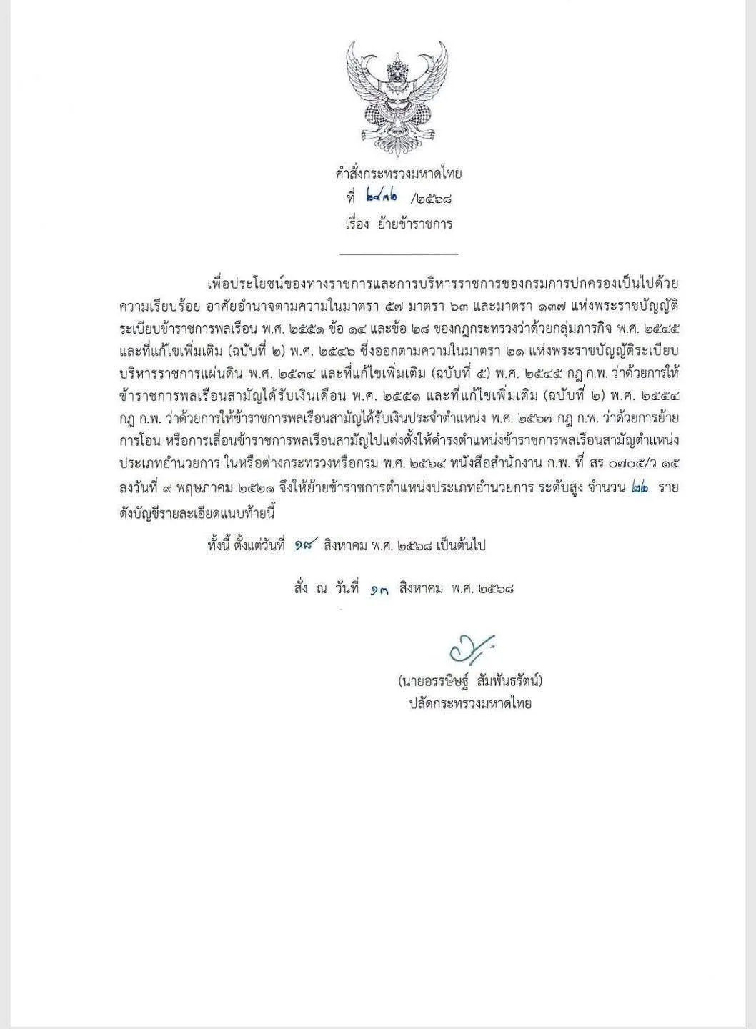 กรุงเทพฯ – กระทรวงมหาดไทย ได้ออกคำสั่งแต่งตั้งและโยกย้ายข้าราชการตำแหน่งประเภทอำนวยการระดับสูง ในกรมการปกครองจำนวน 22 ราย เพื่อเสริมศักยภาพและปรับปรุงการบริหารงานให้สอดรับกับสถานการณ์ปัจจุบัน โดยคำสั่งดังกล่าวลงนามโดย นายอรรษิษฐ์ สัมพันธรัตน์ ปลัดกระทรวงมหาดไทย เมื่อวันที่ 13 สิงหาคม 2568 และมีผลบังคับใช้ตั้งแต่วันที่ 18 สิงหาคม 2568 เป็นต้นไป