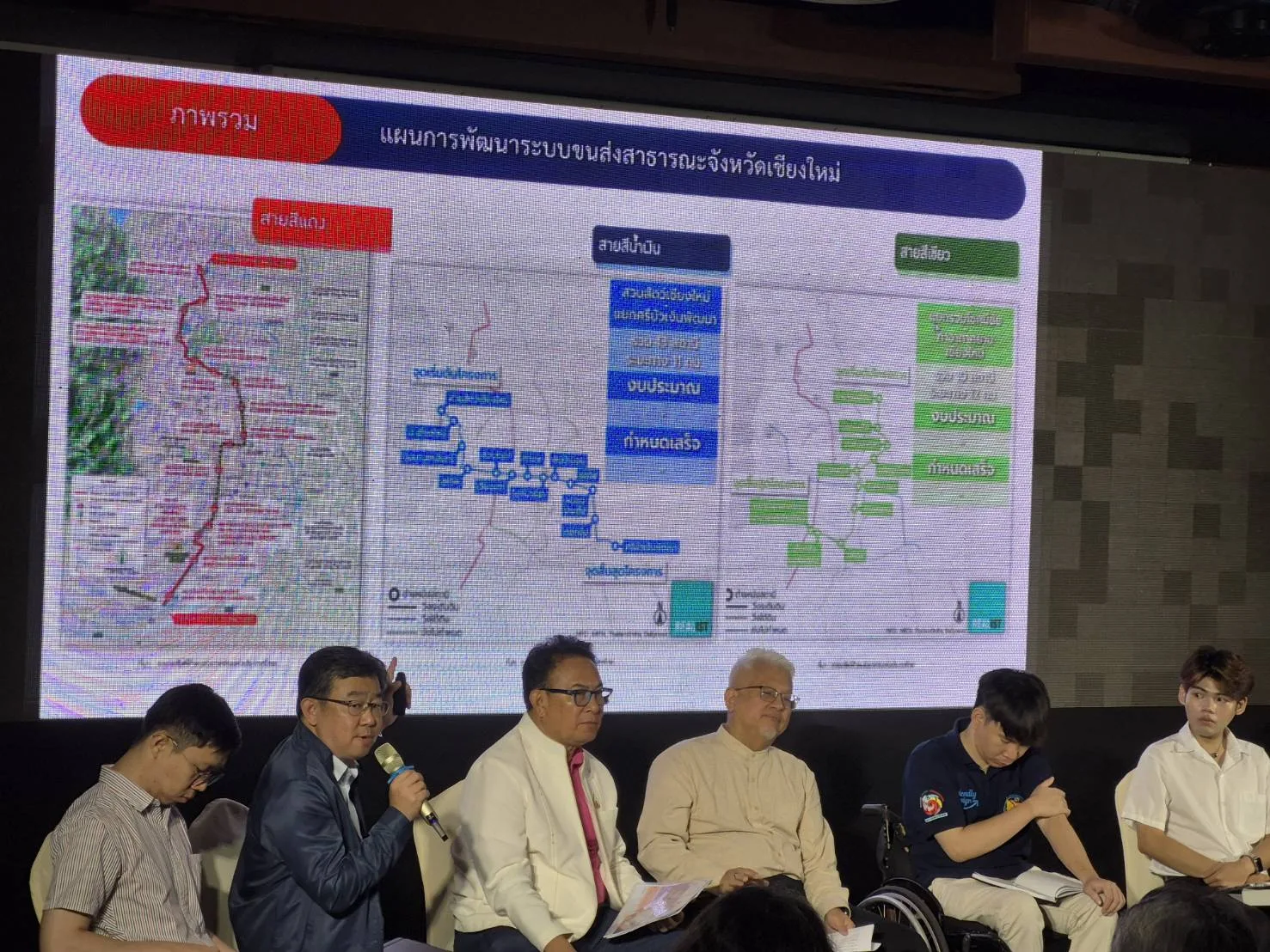 งานเสวนาครั้งนี้ เริ่มต้นโดย ผศ.ดร.ปรีดา พิชยาพันธ์ การออกแบบระบบขนส่งมวลชนควรจะครอบคลุม โดยในเชียงใหม่เผชิญกับปัญหาการจราจรติดขัด และประชากรส่วนใหญ่ต้องใช้ยานพาหนะของตน ในอนาคต แต่มีประชากรจำนวนหนึ่งที่ไม่สามารถใช้ยานพาหนะส่วนตัวได้ ประกอบกับปัญหามลพิษทางอากาศ ในกรุงเทพมหานครและเมืองใหญ่ มีสาเหตุสำคัญจากควันไอเสียรถยนต์ ดังนั้นระบบขนส่งมวลชนสามารถแก้ปัญหาทั้งการเดินทาง และลดมลพิษได้ โดยระบบขนส่งมวลชนต้องมีการออกแบบเส้นทาง ระบบที่รองรับผู้โดยสาร สาธารณูปโภคสนับสนุน ระบบตั๋วที่ราคาเหมาะสมและสะดวก ได้รับการยอมรับจากประชาชน มีการบริหารจัดการที่ดี ซึ่งพื้นที่เมืองเชียงใหม่ มีคนมากกว่า 2 ล้านคน ที่เดินทางเข้าออกตัวเมืองในแต่ละวัน ดังนั้นเชียงใหม่ ซึ่งเป็นเมืองที่มีศักยภาพสูง จำเป็นต้องพัฒนาระบบให้ตอบโจทย์ ซึ่งปัจจุบันมีแผนแม่บทรถไฟฟ้ารางเบา 3 สาย พร้อมระบบขนส่งมวลชนเสริม พร้อมมาตรการเสริม ที่จะช่วยลดค่าใช้จ่ายให้คนสามารถใช้ได้ ทำยังไงให้เชื่อมระบบขนส่งสาธารณะระบบต่างๆได้ ซึ่งสำหรับการเดินรถ จำเป็นต้องดำเนินตามกฎหมายสัมปทาน ในอนาคตจะมีการปรับปรุงหรือไม่ ทางภาครัฐกำลังปรับปรุง โดยเชียงใหม่มีเส้นทางสัมปทาน 25 สาย โดยเอกชนให้บริการเพียง 2 สาย ในอนาคต ระบบขนส่งสาธารณะต้องเป็นโครงข่าย เพื่อให้คนสามารถเดินทางง่าย พร้อมเชื่อมต่อไปนอกเมือง เช่นระบบ Feeder เช่น รถโดยสารขนาดเล็ก เป็นต้น