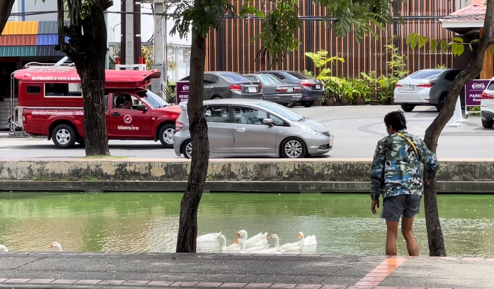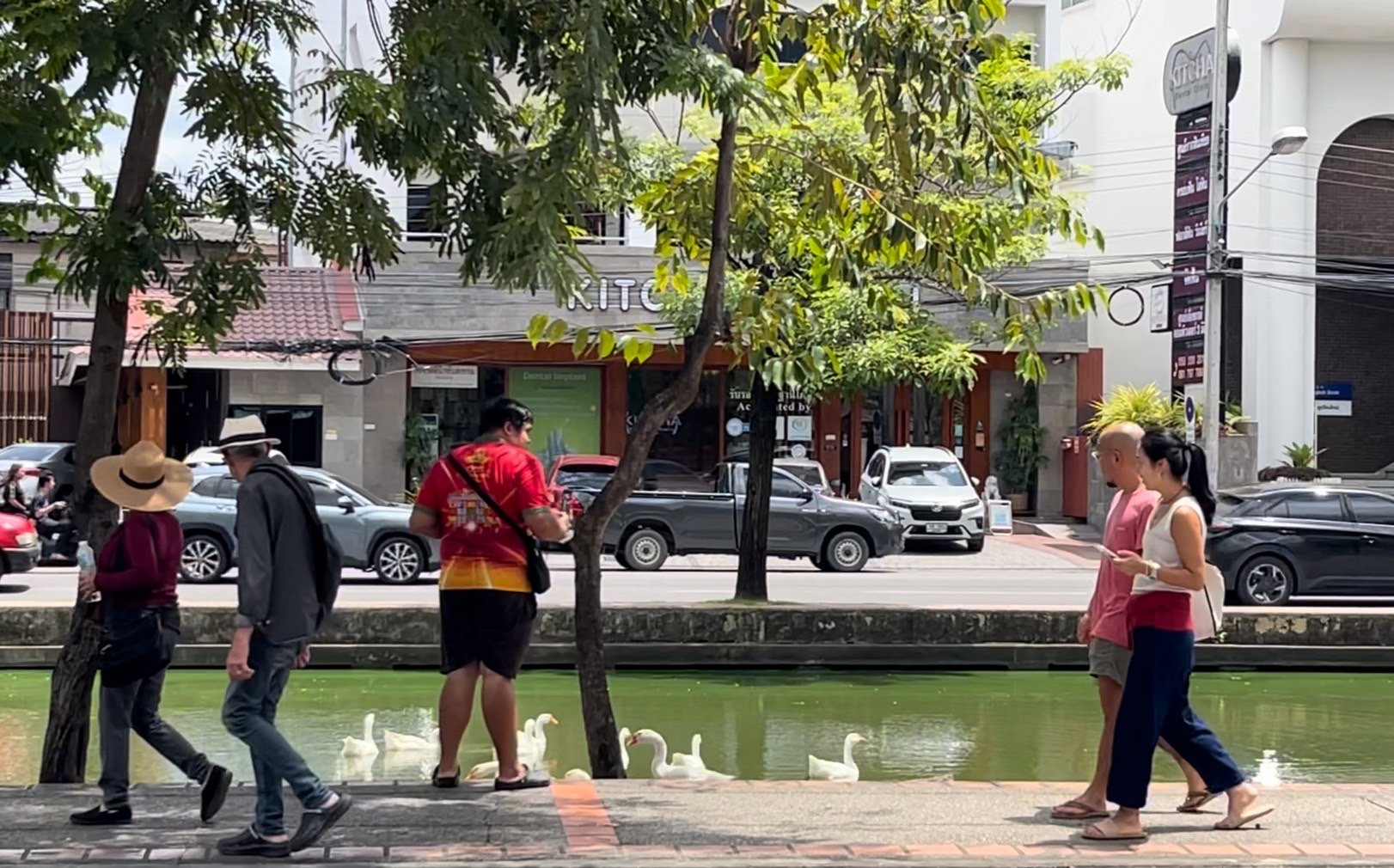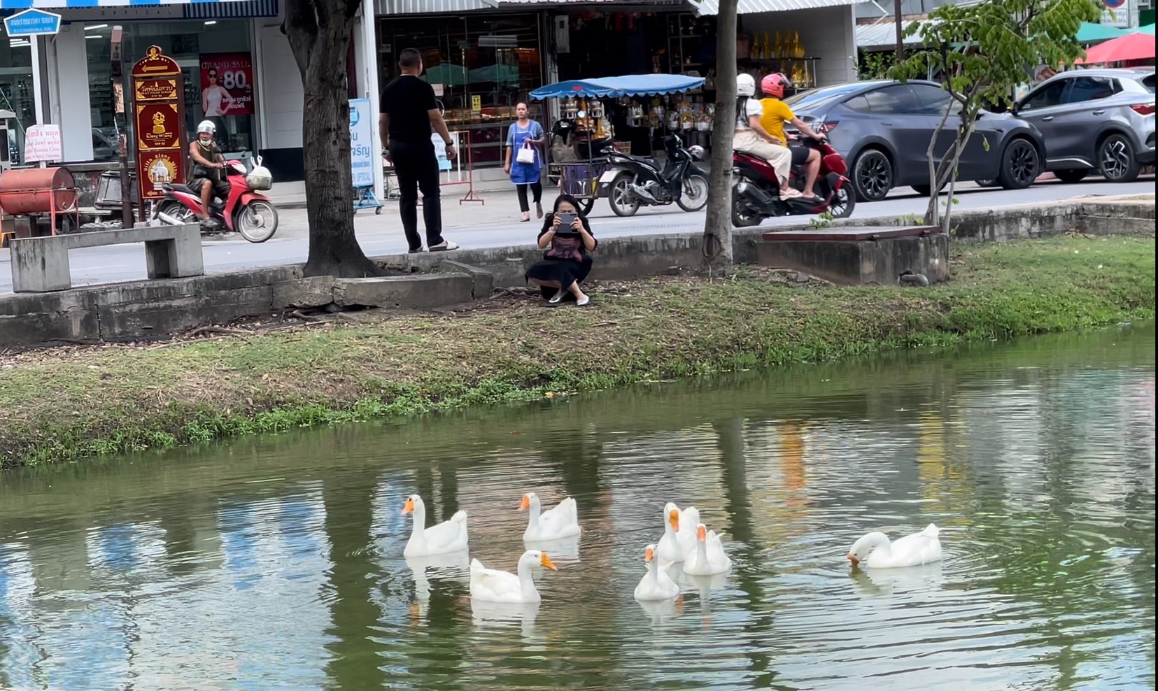 ทีมข่าวตรวจสอบพบฝูงห่านพากันแหวกว่ายเล่นน้ำอยู่ เฉพาะบริเวณคูเมืองตลอดทั้งวัน โดยไม่มีใครไปรบกวนและพวกมันก็ไม่ได้ขึ้นมาสร้างความเดือดร้อนบนถนน หรือร้านค้าบริเวณดังกล่าวแต่อย่างใด ขณะที่ริมคูเมืองบริเวณดังกล่าว มีคอกที่สร้างขึ้นมาเพื่อเลี้ยงห่านฝูงนี้