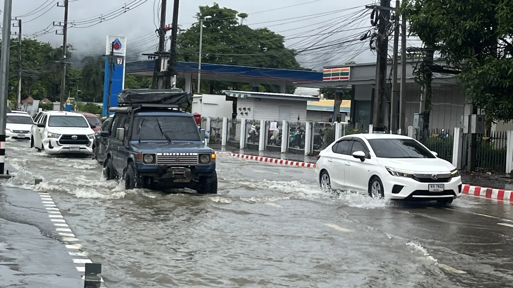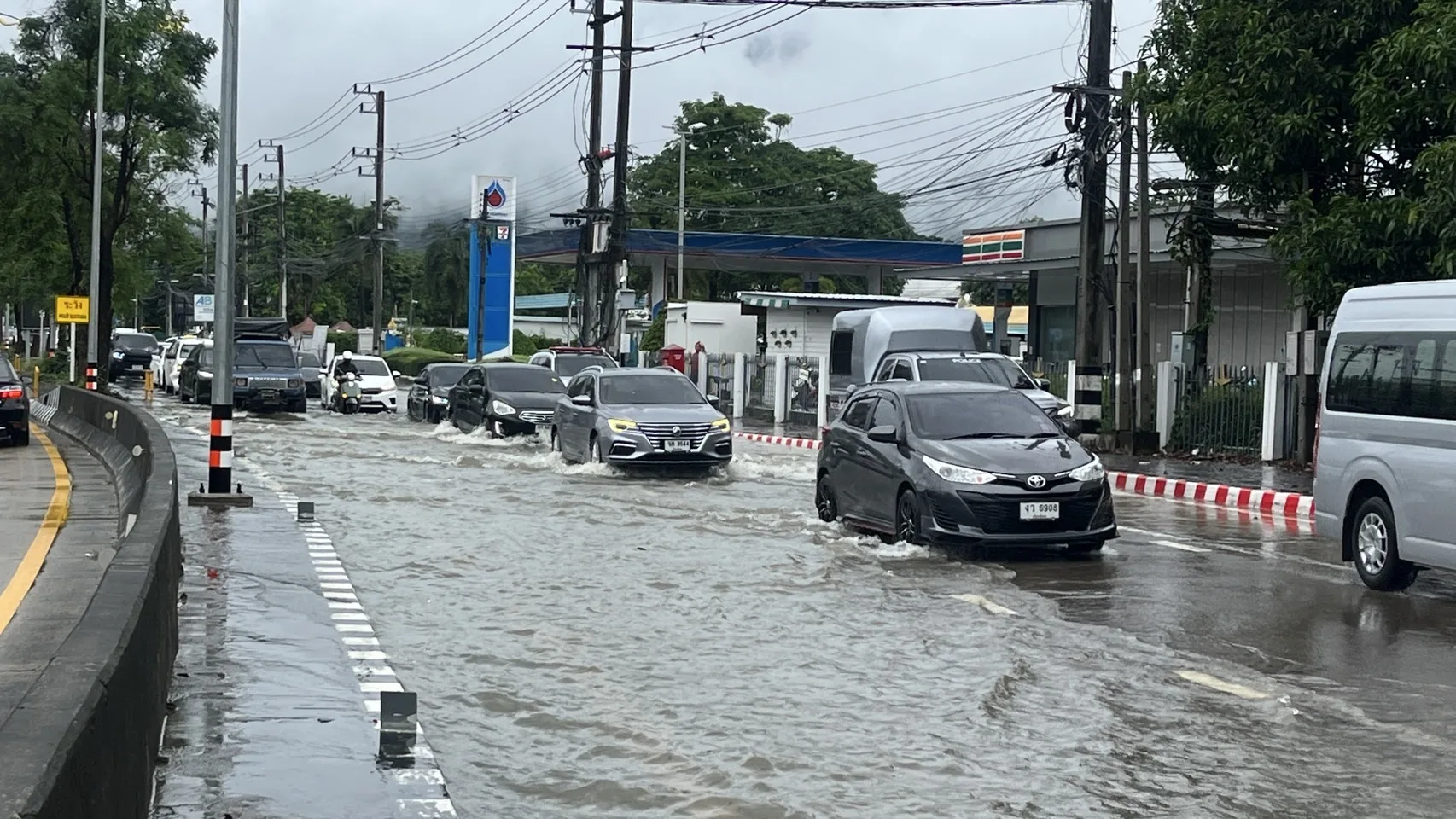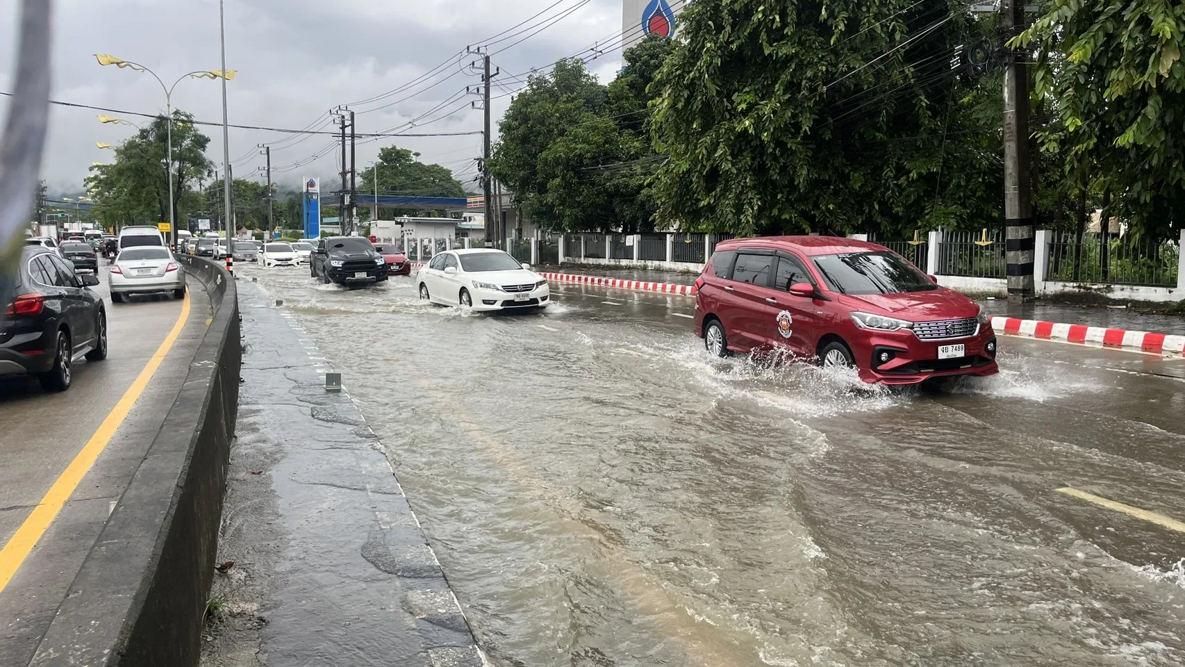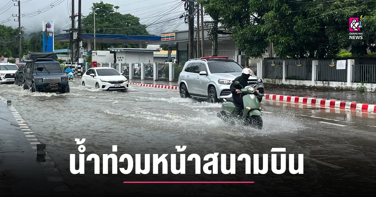 เมื่อเวลา 15.30 น.ผู้สื่อข่าวรายงานที่ถนนด้านหน้าท่าอากาศยานนานาชาติเชียงใหม่ หรือสนามบินเชียงใหม่ อ.เมือง จ.เชียงใหม่ จุดถนนขาออกจากกองบิน 41 เข้ามาที่สี่แยกแอร์พอต ถนนหน้าปั๊ม ปตท.เกิดน้ำท่วมขังตลอดสายจนถึงสี่แยกแอร์พอต