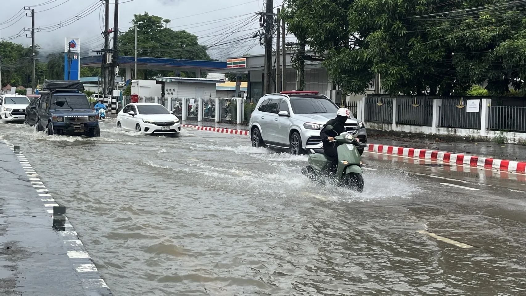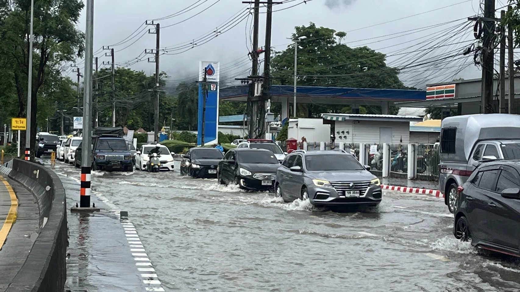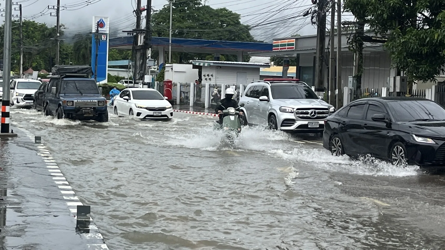 เมื่อเวลา 15.30 น.ผู้สื่อข่าวรายงานที่ถนนด้านหน้าท่าอากาศยานนานาชาติเชียงใหม่ หรือสนามบินเชียงใหม่ อ.เมือง จ.เชียงใหม่ จุดถนนขาออกจากกองบิน 41 เข้ามาที่สี่แยกแอร์พอต ถนนหน้าปั๊ม ปตท.เกิดน้ำท่วมขังตลอดสายจนถึงสี่แยกแอร์พอต