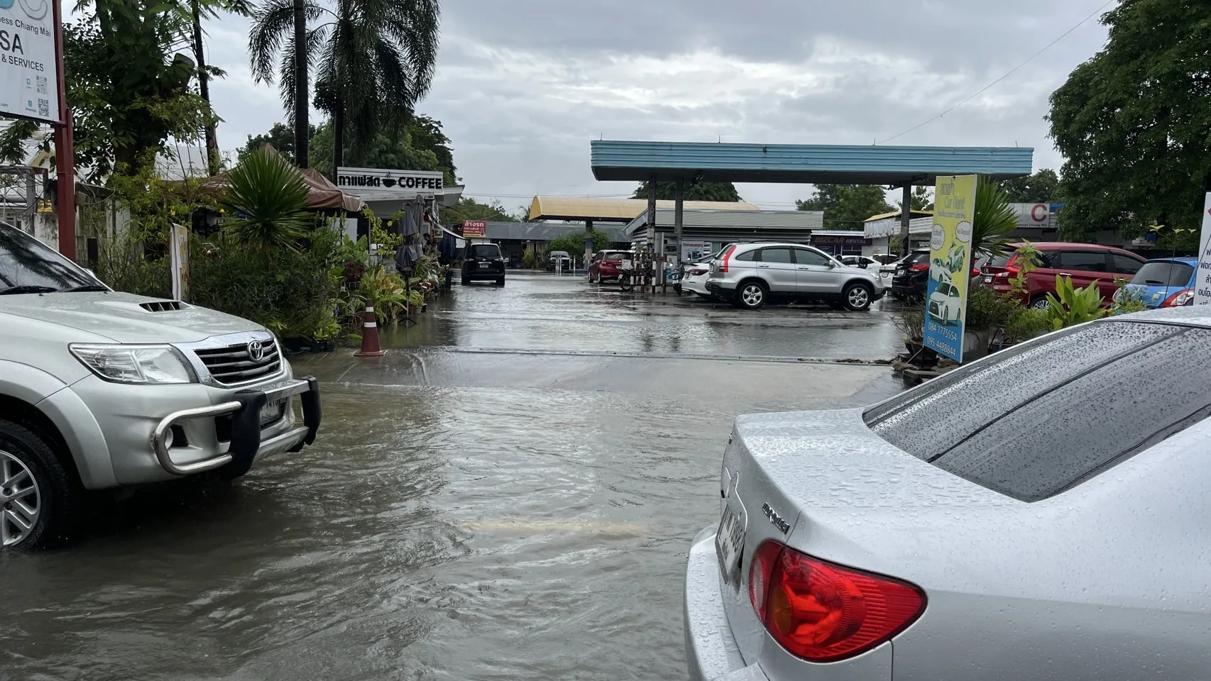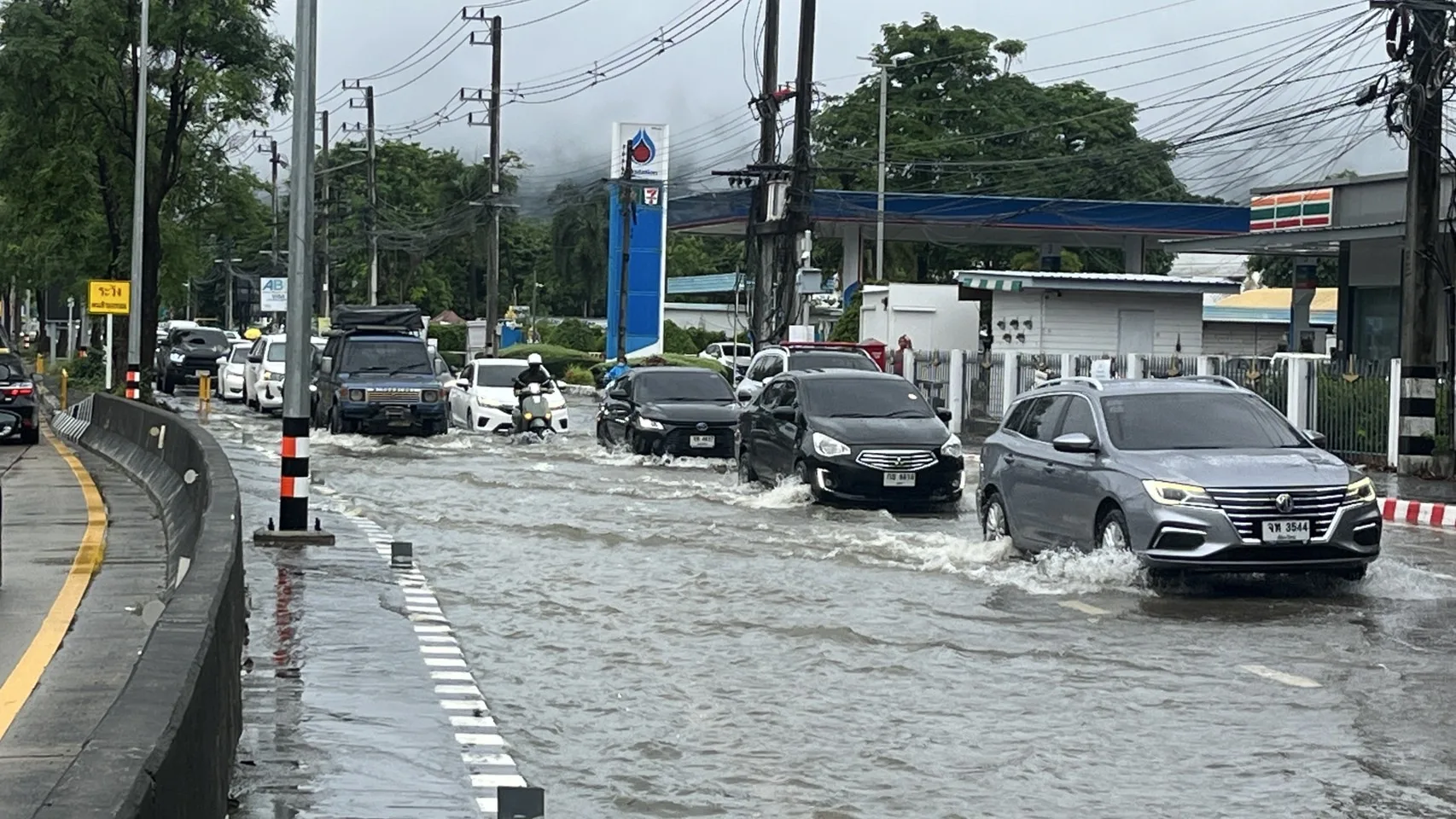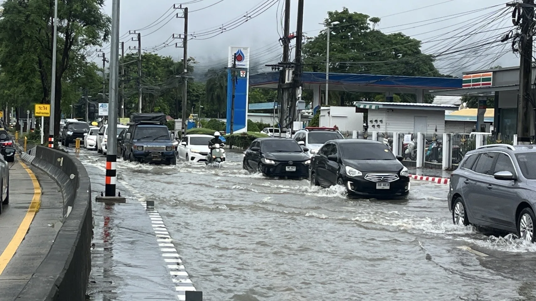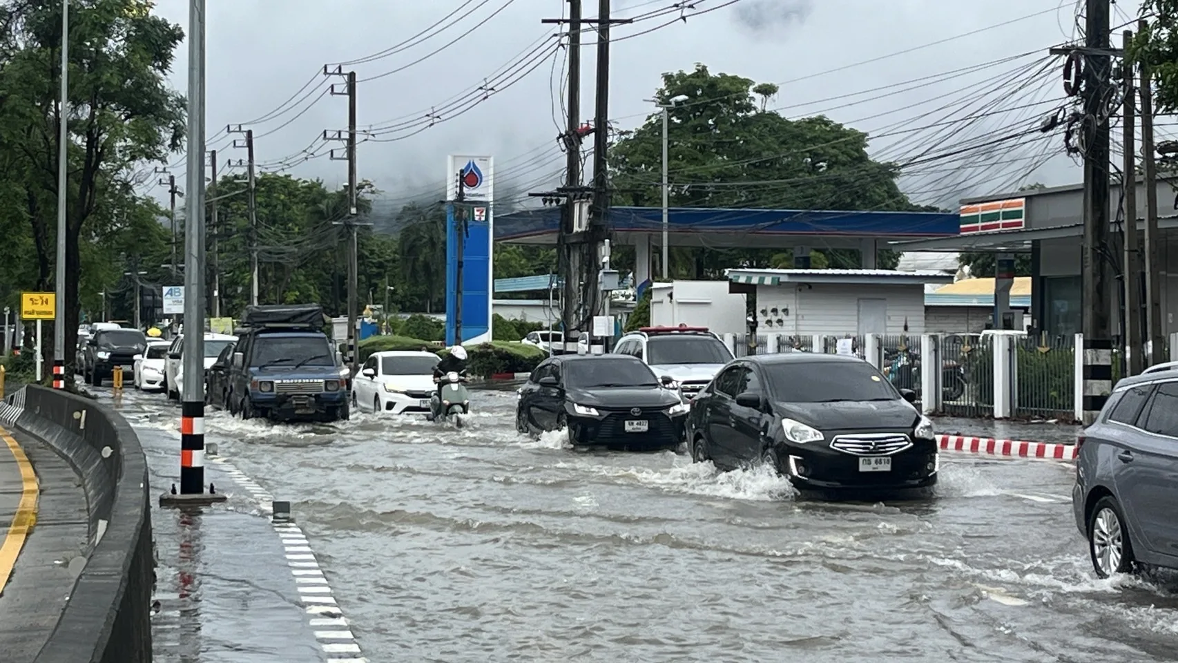 เมื่อเวลา 15.30 น.ผู้สื่อข่าวรายงานที่ถนนด้านหน้าท่าอากาศยานนานาชาติเชียงใหม่ หรือสนามบินเชียงใหม่ อ.เมือง จ.เชียงใหม่ จุดถนนขาออกจากกองบิน 41 เข้ามาที่สี่แยกแอร์พอต ถนนหน้าปั๊ม ปตท.เกิดน้ำท่วมขังตลอดสายจนถึงสี่แยกแอร์พอต