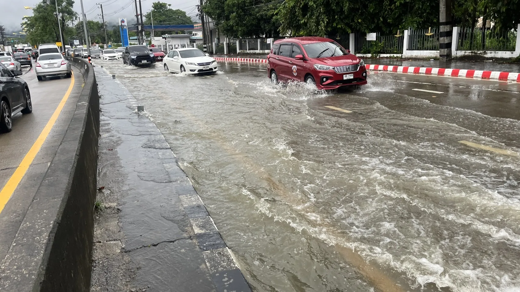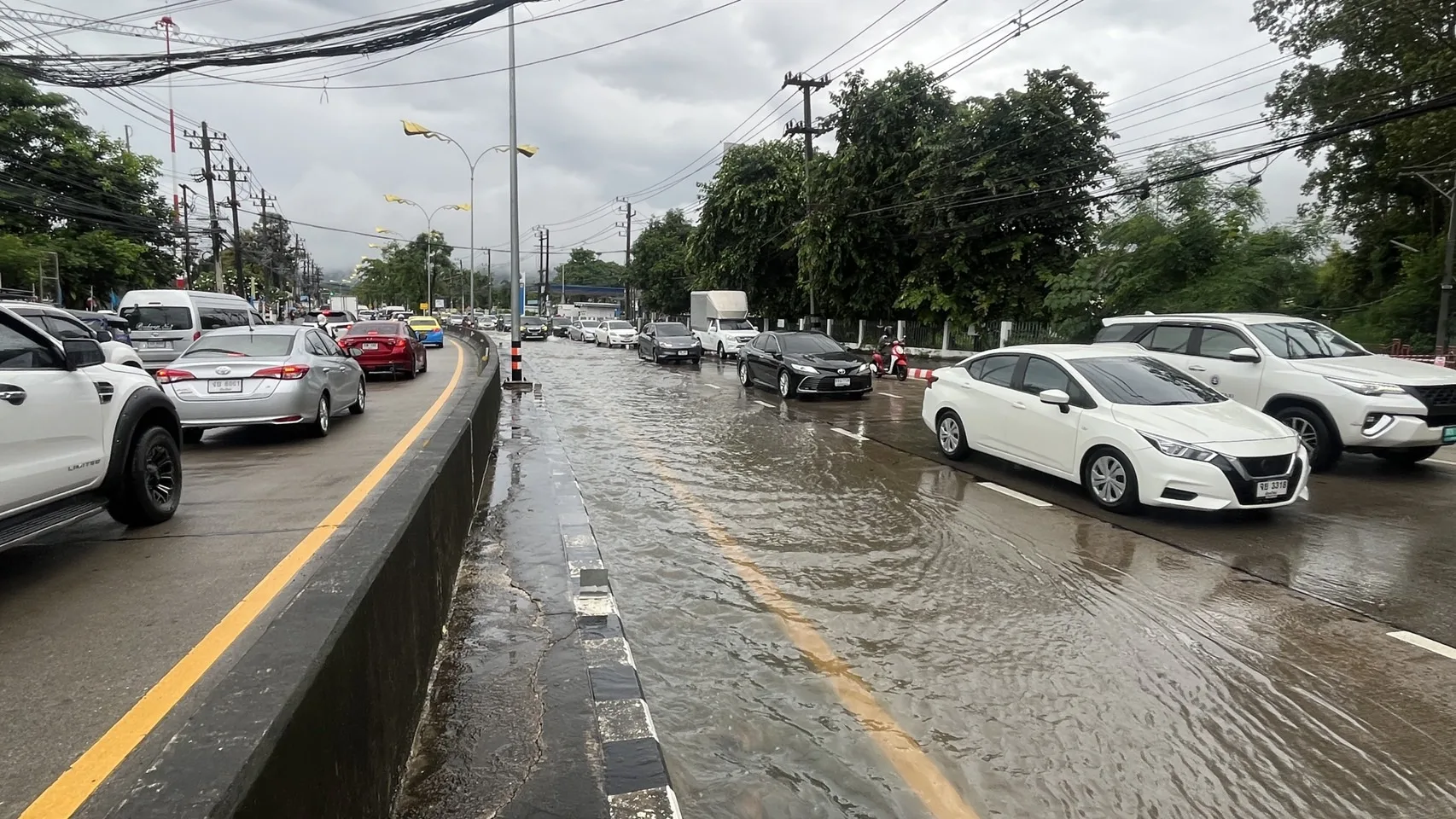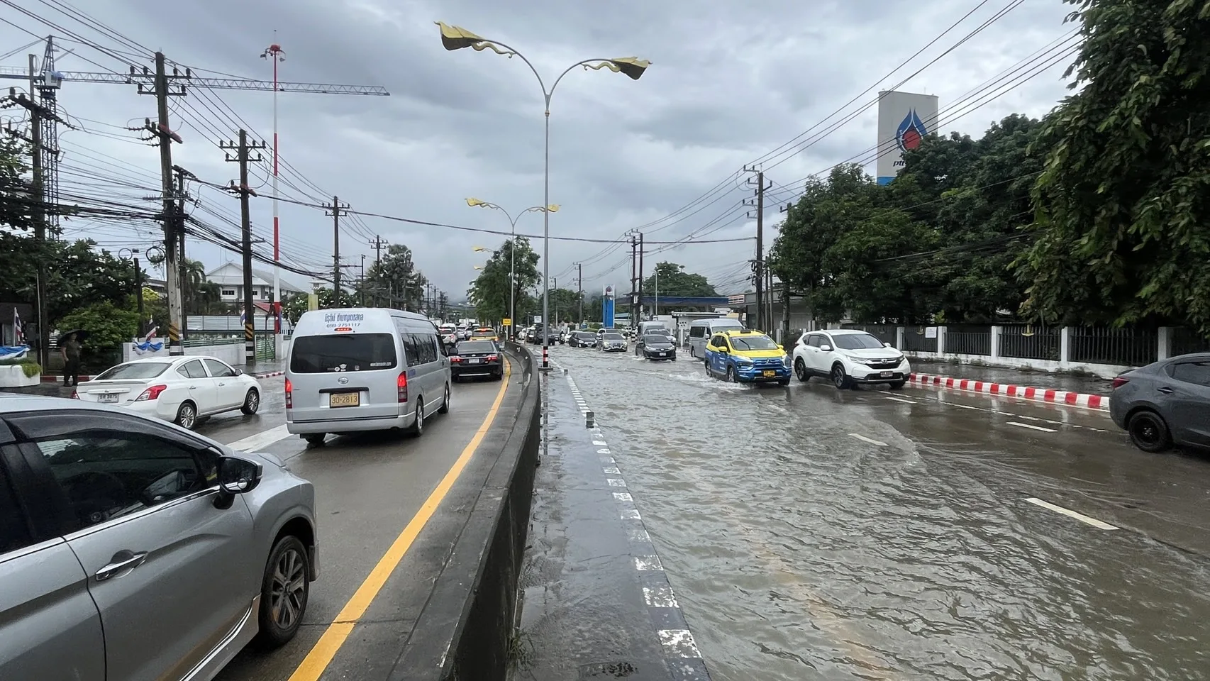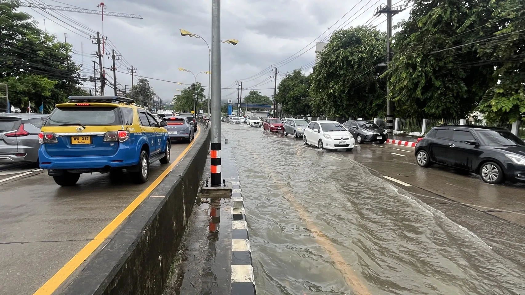 รถยนต์ขนาดเล็ก ต้องขับเลนซ้ายสุดเพื่อหนีน้ำท่วม โดยน้ำไหลออกมาจากกองบิน 41 ซึ่งสายน้ำดังกล่าวได้ไหลลงมาจากยอดดอยสุเทพ ไหลมาตามถนน จากนั้นน้ำก็จะไหลลงท่อส่งน้ำไหลทางต่อไป