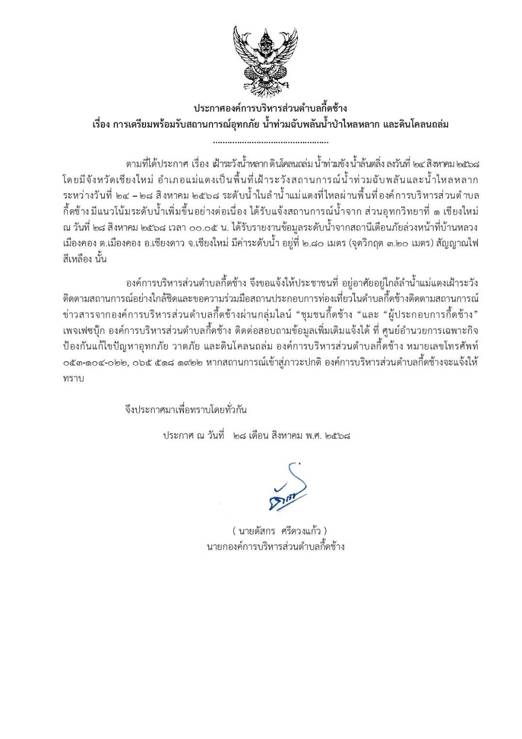 ประกาศองค์การบริหารส่วนตำบลกื้ดช้าง #วันที่ 28 สิงหาคม 2568 ระบุว่า ตามที่ได้ประกาศ เรื่อง เฝ้าระวังน้ำหลาก ดินโคลนถล่ม น้ำท่วมขัง น้ำล้นตลิ่ง ลงวันที่ 24 สิงหาคม 2568 โโยจังหวัดเชียงใหม่ อำเภอแม่แตงเป็นพื้นที่เฝ้าระวังสถานการณ์น้ำท่วมฉับพลันและน้ำป่าไหลหลากระหว่างวันที่ 24 -28 สิงหาคม 2568 ระดับลำน้ำแม่แตงที่ไหลผ่านพื้นที่องค์การบริหารส่วนตำบลกื้ดช้าง มีแนวโน้มระดับน้ำเพิ่มขึ้นอย่างต่อเนื่อง