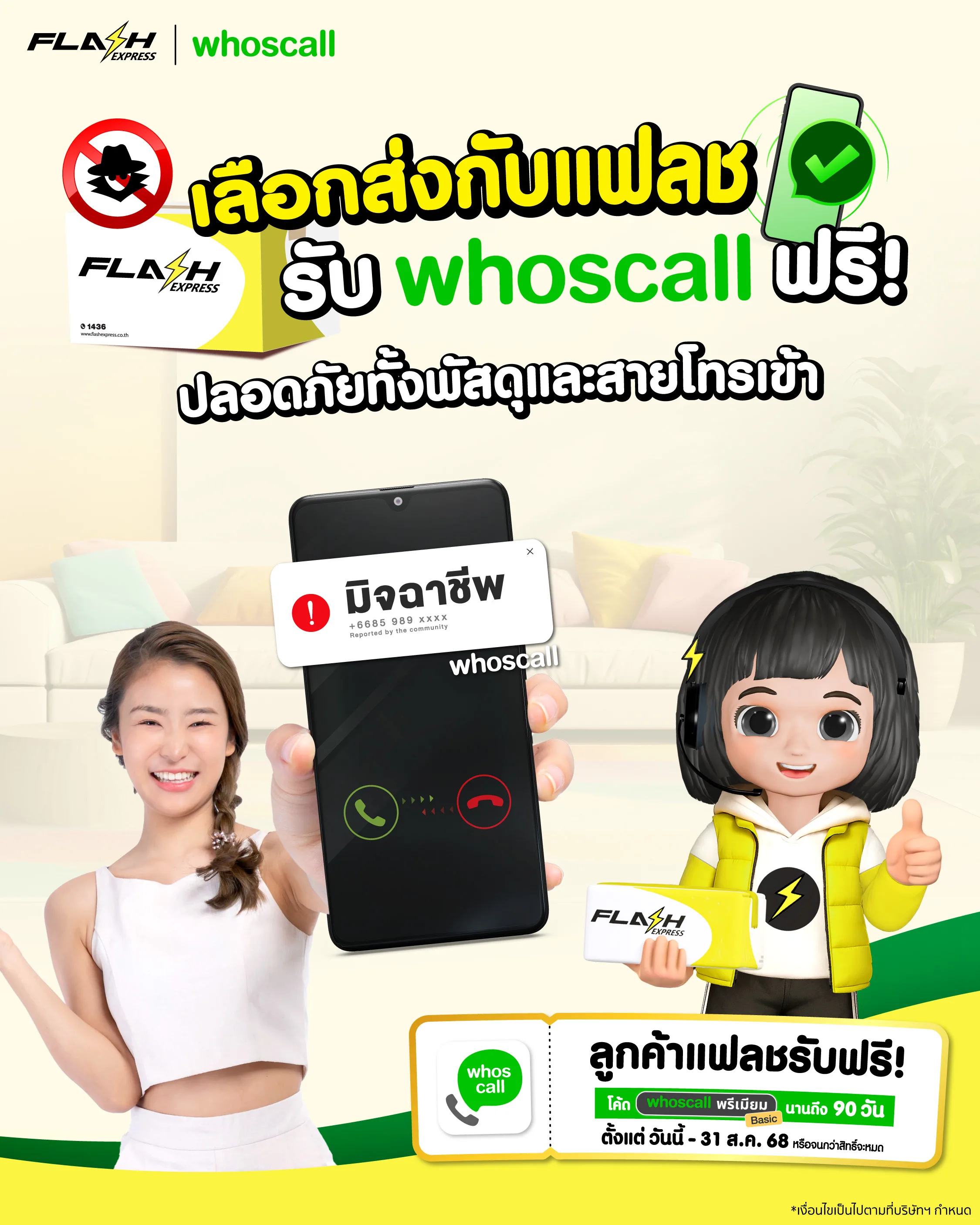 บริษัท แฟลช เอ็กซ์เพรส จำกัด ผู้นำด้านธุรกิจขนส่งและโลจิสติกส์ระดับมืออาชีพ ให้บริการครบวงจร ครอบคลุมทั่วไทย และเซาท์ อีส เอเชีย จับมือ บริษัท โกโกลุก (ประเทศไทย) ผู้พัฒนาเทคโนโลยีเพื่อความเชื่อมั่นชั้นนำ และผู้ให้บริการแอปพลิเคชัน Whoscall ยกระดับความปลอดภัยให้กับลูกค้า และผู้ใช้บริการจัดส่งพัสดุจากภัยไซเบอร์ทุกรูปแบบ ทั้งการโทรแอบอ้างมีพัสดุตกค้าง ,การส่ง SMS และลิงก์ปลอมเพื่อหลอกให้แอดไลน์ หรือหลอกให้ติดตั้งแอปพลิเคชัน และเบอร์มิจฉาชีพที่มุ่งโจมตีผู้ใช้บริการขนส่งพัสดุจากการซื้อสินค้าผ่านแพลตฟอร์มออนไลน์ โดยการแจกโค้ดใช้งานฟรี Whoscall พรีเมียม เบสิก นาน 90 วัน จำนวน 6,000 โค้ด ให้กับลูกค้า และพนักงานส่งพัสดุของแฟลช เอ็กซ์เพรส ตั้งแต่วันนี้ถึง 31 สิงหาคม 2568 โดยความร่วมมือในครั้งนี้ แฟลช เอ็กซ์เพรส หวังเป็นอย่างยิ่งว่าจะสามารถเสริมความมั่นใจให้กับลูกค้าผู้ใช้บริการในการส่งพัสดุ และช่วยลดความเสี่ยงจากภัยของมิจฉาชีพได้อย่างเท่าทัน และมีประสิทธิภาพ