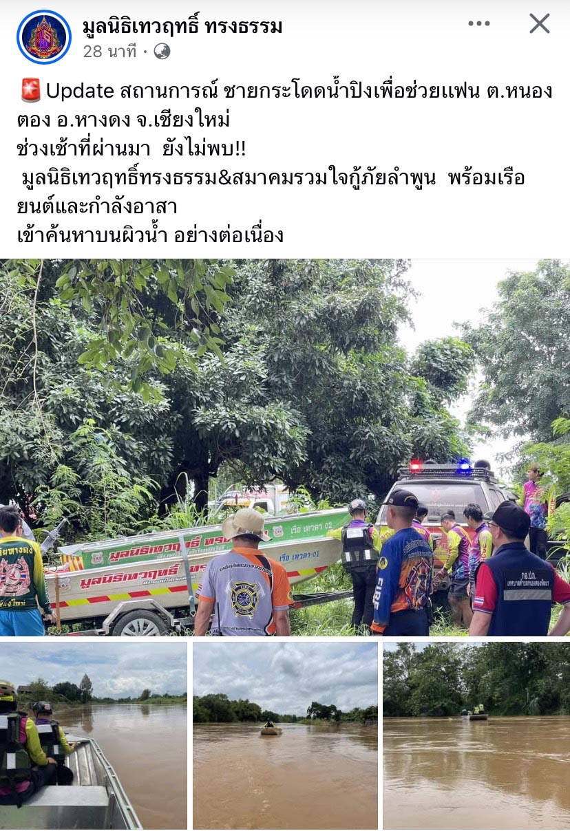 เมื่อวันที่ 29 ส.ค.2568 เจ้าหน้าที่กู้ชีพ-กู้ภัย ประกอบด้วย กู้ชีพฯทต.หนองตอง,สมาคมกู้ภัย ร่วมใจลำพูน,กู้ชีพฯทต.สันทรายมหาวงค์และมาจากอีกหลายหน่วยงาน ออกค้นหาร่าง นายแม็ก อายุ 27 ปีชาวบ้านเกาะหมู่5 ต.หนองตอง อ.หางดง จ.เชียงใหม่ ชึ่งจมน้ำปิง ขณะช่วยแฟนสาวกระโดดน้ำปิง ปลิดชีพบริเวณสะพานล้องปู่หม่น อ.สารภี จ.เชียงใหม่ ไปเมื่อคืนวันที่ 27 ส.ค.68 และทางไมค์ มหาวงค์ กู้ชีพฯทต.สันทรายมหาวงค์/ประดาน้ำ สามารถช่วยผู้หญิงรอดชีวิต ส่วนนายแม็กฯหมดแรงยมน้ำหายไป