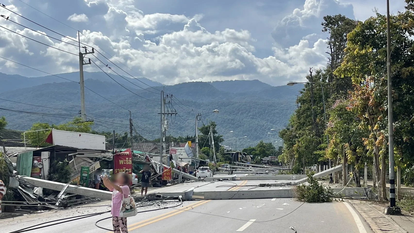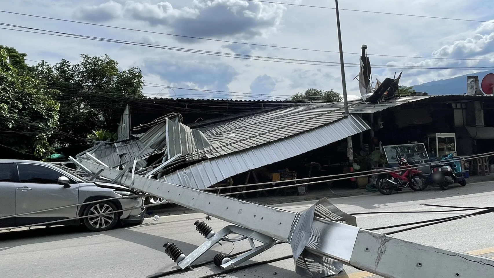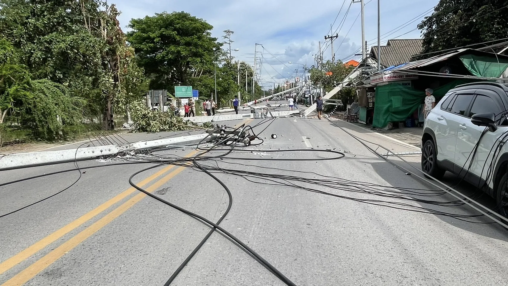 ขณะที่ทางด้านแม่ค้ารายหนึ่ง ที่ร้านถูกเสาไฟฟ้าล้มทับ บอกว่า กำลังยืนอยู่ในร้าน จู่ๆ ก็ได้ยินเสียเสาไฟฟ้าล้ม คนในร้านพากันแตกตื่นตกใจวิ่งเข้าไปด้านใน ก่อนที่เสาไฟที่อยู่บริเวณใกล้ๆ กับร้านจะล้มลงมาทับรัานจนเสียหายยับเยิน แต่โชคดีที่พากันวิ่งหนีได้ทันจึงไม่เป็นอันตรายต่อชีวิต แต่ก็ยังตกใจกับเหตุการณ์ที่เกิดขึ้นอยู่