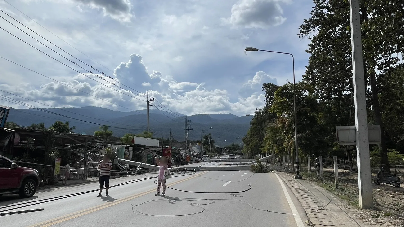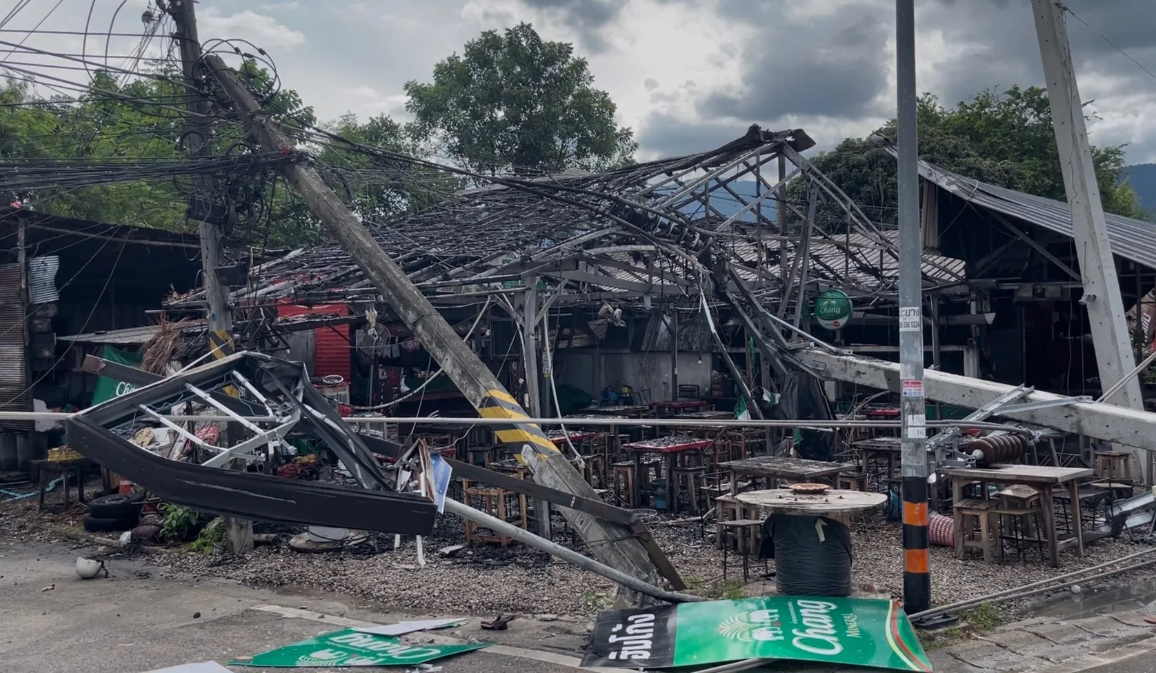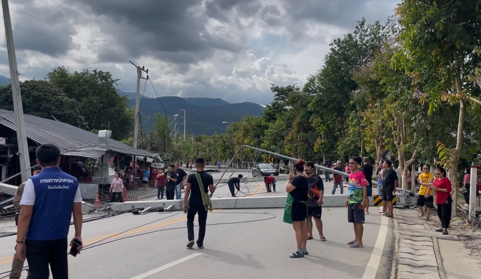 ขณะที่ทางด้านแม่ค้ารายหนึ่ง ที่ร้านถูกเสาไฟฟ้าล้มทับ บอกว่า กำลังยืนอยู่ในร้าน จู่ๆ ก็ได้ยินเสียเสาไฟฟ้าล้ม คนในร้านพากันแตกตื่นตกใจวิ่งเข้าไปด้านใน ก่อนที่เสาไฟที่อยู่บริเวณใกล้ๆ กับร้านจะล้มลงมาทับรัานจนเสียหายยับเยิน แต่โชคดีที่พากันวิ่งหนีได้ทันจึงไม่เป็นอันตรายต่อชีวิต แต่ก็ยังตกใจกับเหตุการณ์ที่เกิดขึ้นอยู่