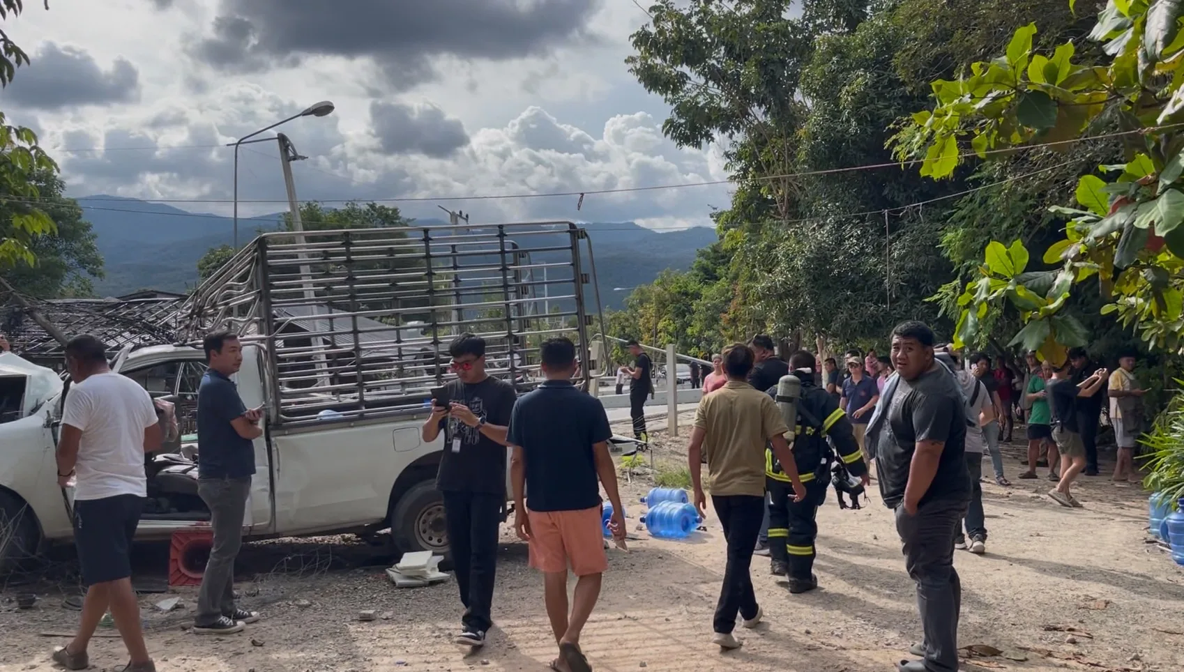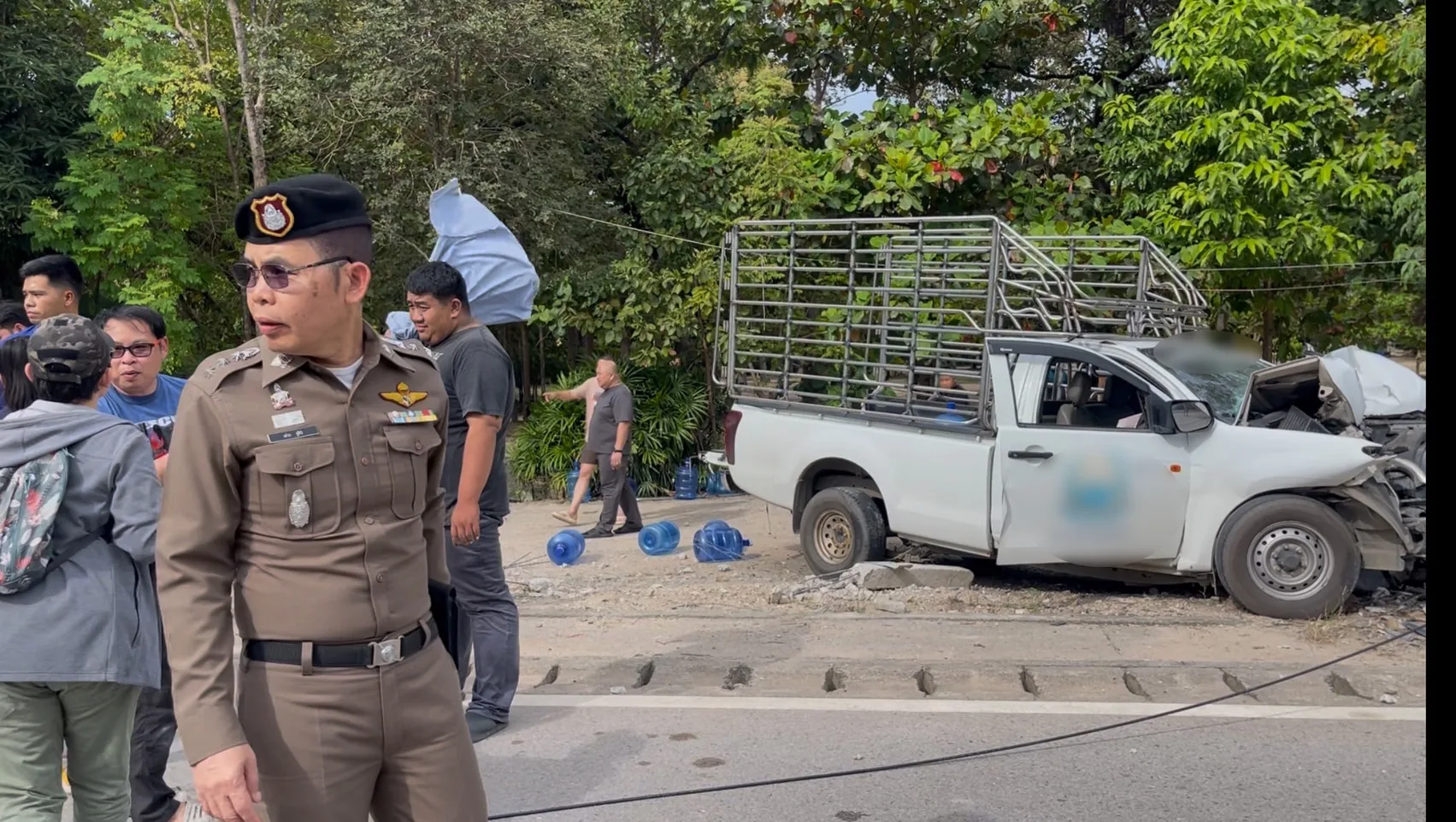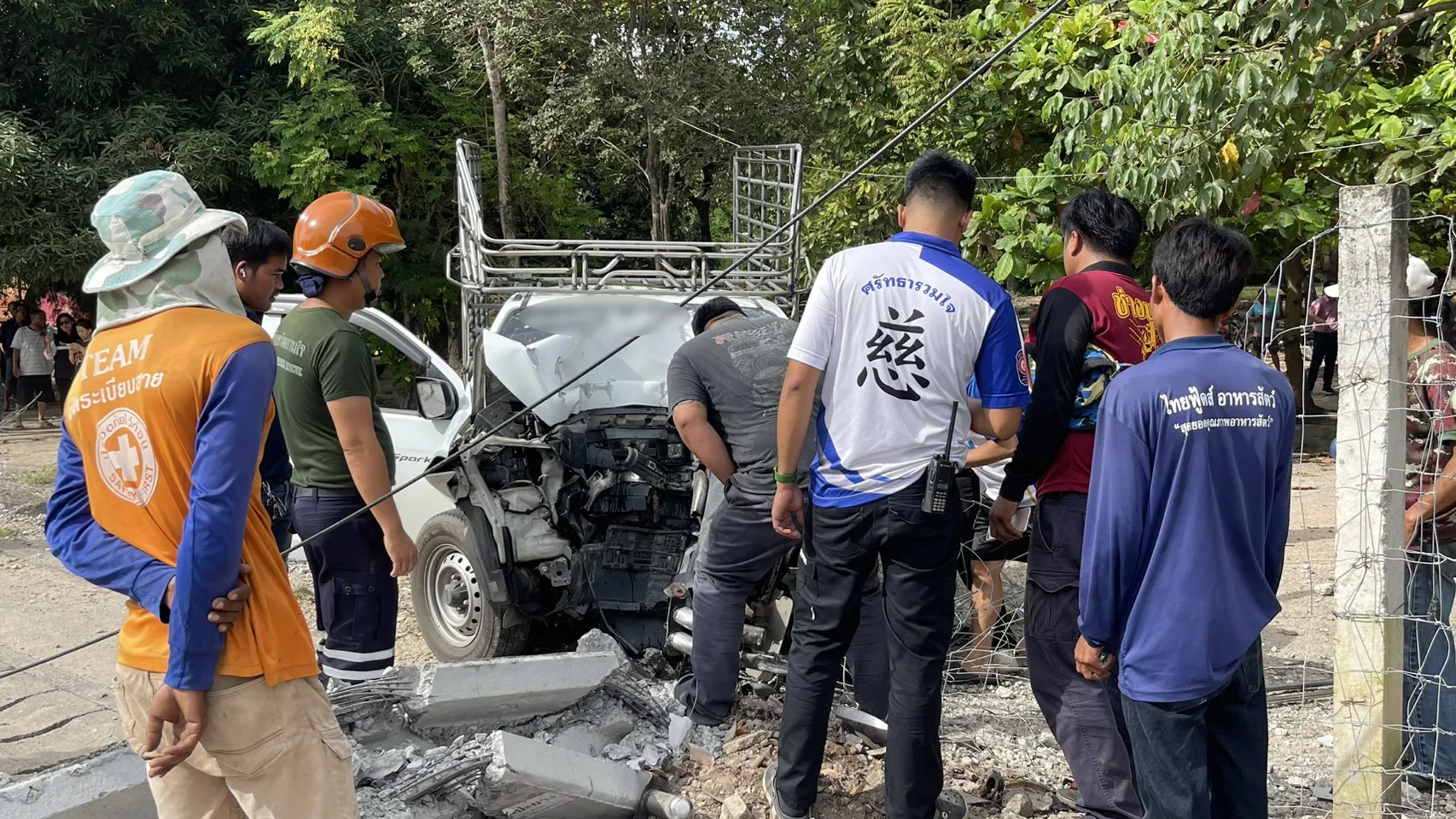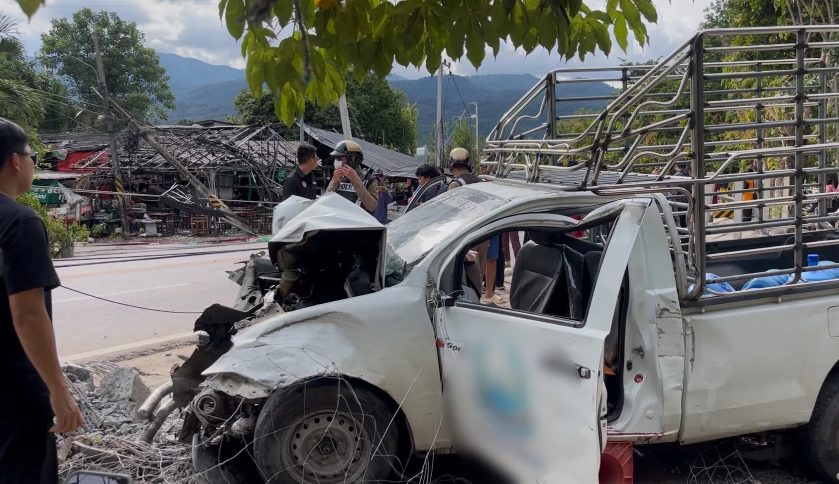 จากการตรวจสอบพบว่า บริเวณที่เสาไฟฟ้าล้มขุดแรกมีรถยนต์กระบะคอกสีขาว ซึ่งเป็นรถขนส่งน้ำดื่มนาคราชหมายเลยทะเบียนเชียงใหม่ สภาพด้านหน้ารถชนเข้ากับเสาไฟฟ้าจนพังยับเยิน โดนภายในรถมีผู้ได้รับบาดเจ็บ 2 ราย เป็นชาย อายุประมาณ 30-35 ปี โดยรายแรกที่ได้รับบาดเจ็บสาหัสเป็นคนที่นั่งโดยสารมาด้านข้างคนขับ มีอาการหมดสติเจ้าหน้าที่ต้องรีบทำการ CPR และรีบนำตัวส่งโรงพยาบาลอย่างเร่งด่วน ส่วนอีกรายเป็นชายคนขับ ยังมีสติและบาดเจ็บมีบาดแผลถลอก มีอาการแน่นหน้าอก ทางเจ้าหน้าที่ได้ทำการปฐมพยาบาลและนำตัวส่งโรงพยาบาลในเวลาต่อมา