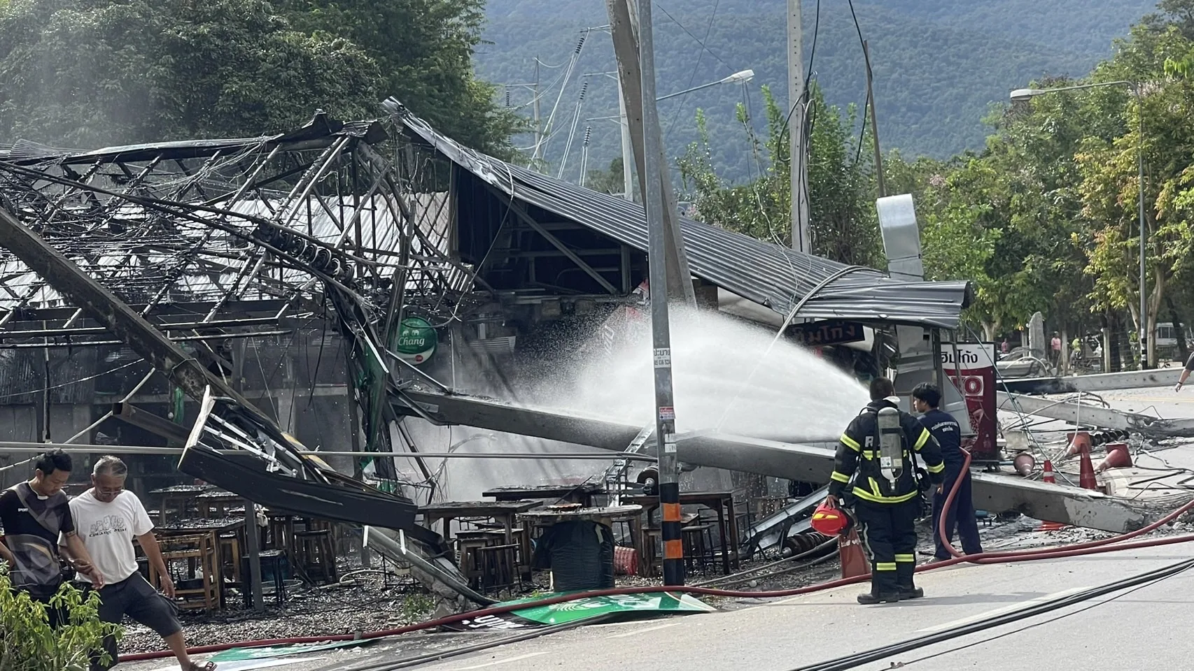 นอกจากนี้ได้เร่งช่วยกันทำการดับเพลิงที่ลุกไหม้บริเวณร้านฮิมโก้ง ที่ถูกเสาไฟฟ้าล้มลงมาทับจนเกิดเพลิงไหม้ ใช้เวลาราว 10 กว่านาทีจนสามารถควบคุมเพลิงไว้ได้ โดยไม่มีผู้ได้รับบาดเจ็บภายในจุดนี้แต่อย่างใด
